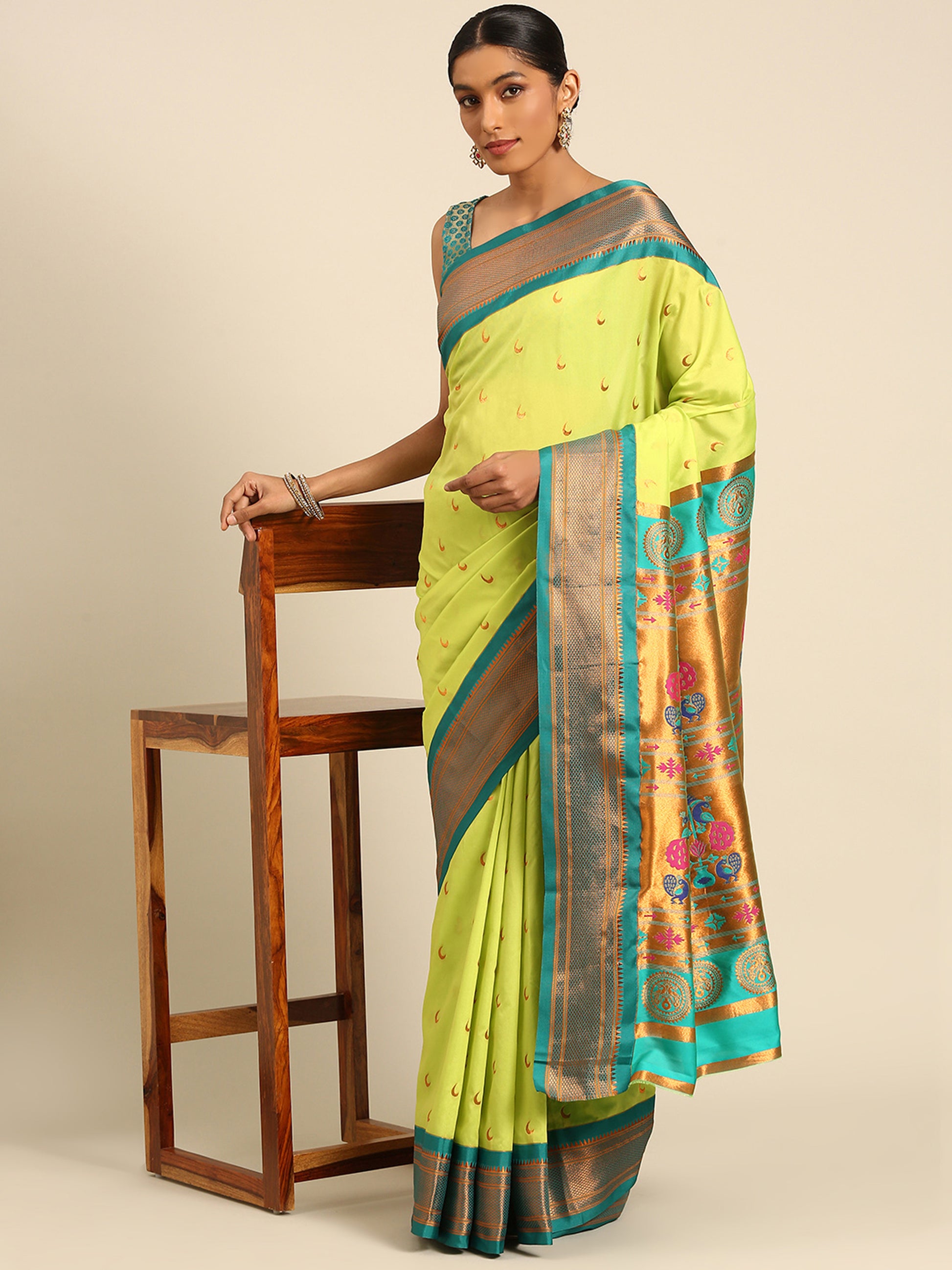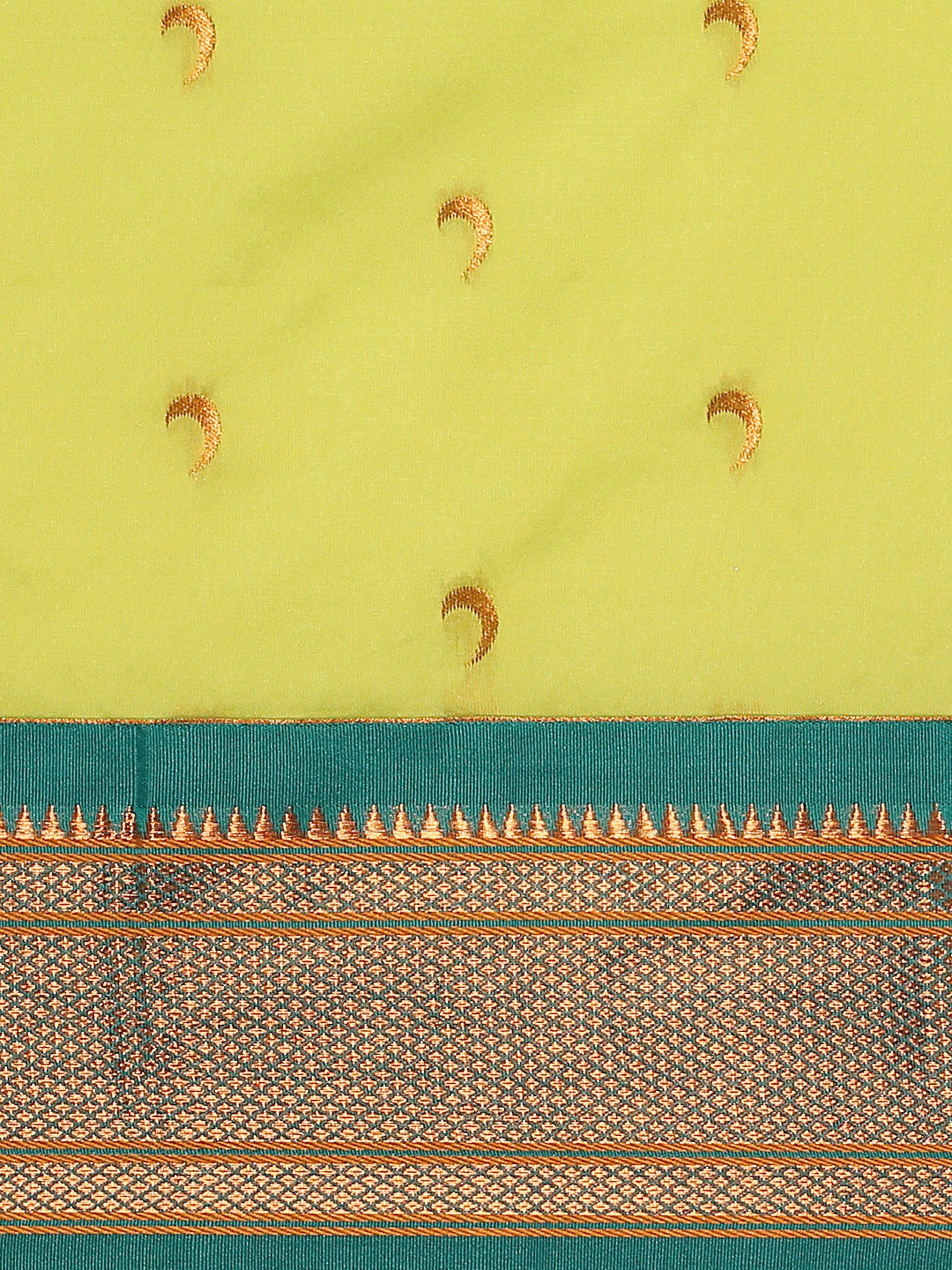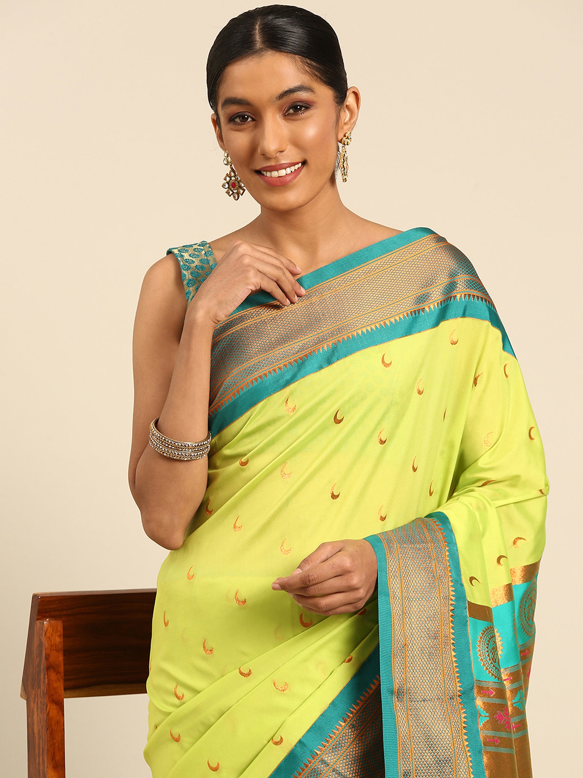 Explore The Collection Of Beautifully Designed Parrot Green & Rama Soft Silk Chandrakor Paithani Saree From Varkala Silk Sarees On Amazon. Indulge In Timeless Elegance With Our Soft Silk Chandrakor Paithani Saree. Its Intricate Checks Design Border Adds A Touch Of Sophistication, While The Copper Zari Chandraakor (Half Moon) Motif Butti Adorning The Body Exudes Grace. The Copper Zari Woven Peacock Motifs Pallu Enhances Its Allure, Making It Perfect For Weddings, Parties, And Festivals. Comes With An Unstitched Blouse Piece For Customization. Elevate Your Style With This Exquisite Piece Of Artistry.
