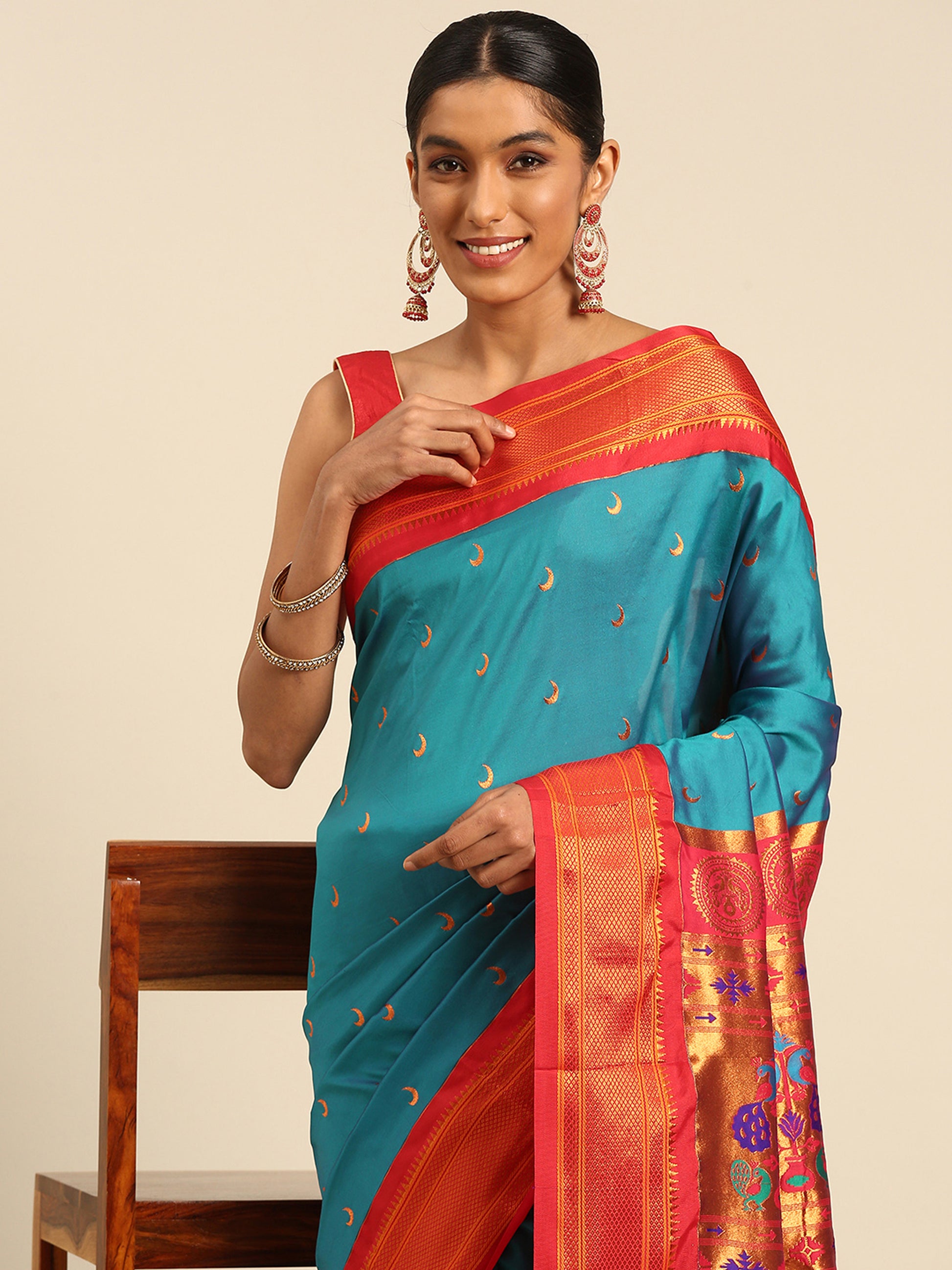 Explore The Collection Of Beautifully Designed Rama & Red Soft Silk Chandrakor Paithani Saree From Varkala Silk Sarees. Indulge In Timeless Elegance With Our Soft Silk Chandrakor Paithani Saree. Its Intricate Checks Design Border Adds A Touch Of Sophistication, While The Copper Zari Chandraakor (Half Moon) Motif Butti Adorning The Body Exudes Grace. The Copper Zari Woven Peacock Motifs Pallu Enhances Its Allure, Making It Perfect For Weddings, Parties, And Festivals. Comes With An Unstitched Blouse Piece For Customization. Elevate Your Style With This Exquisite Piece Of Artistry.