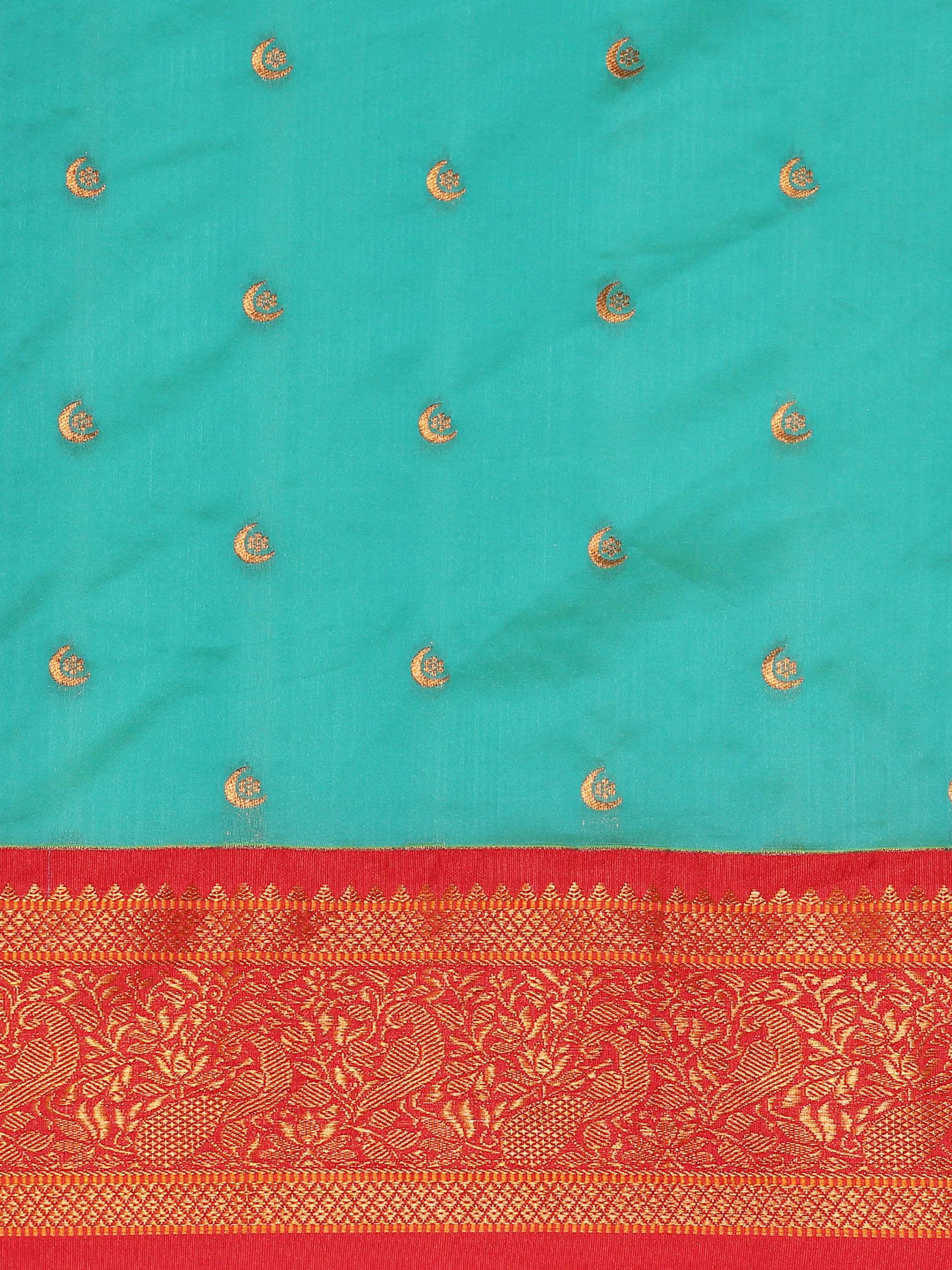 Explore The Collection Of Beautifully Designed Chintamani Blue & Red Soft Silk Chandratara Paithani Saree With Blouse Piece From Varkala Silk Sarees. This Chandratara Paithani Saree Is Crafted From A Soft Silk Blend (70% Polyester, 30% Silk) And Measures 5.5 Meters With An Additional 0.8-Meter Blouse Piece. It Features Rich Copper Zari Work, With An Intricate Jacquard Border Showcasing Peacock Designs And Delicate Chandrakor And Star Motifs On The Body. The Pallu Is Adorned With Beautiful Copper Zari Woven Peacock Motifs, Adding A Touch Of Elegance. Perfect For Weddings, Parties, And Festivals, This Saree Should Be Dry-Cleaned For The First Wash, With Gentle Hand Washing Recommended For Future Care.