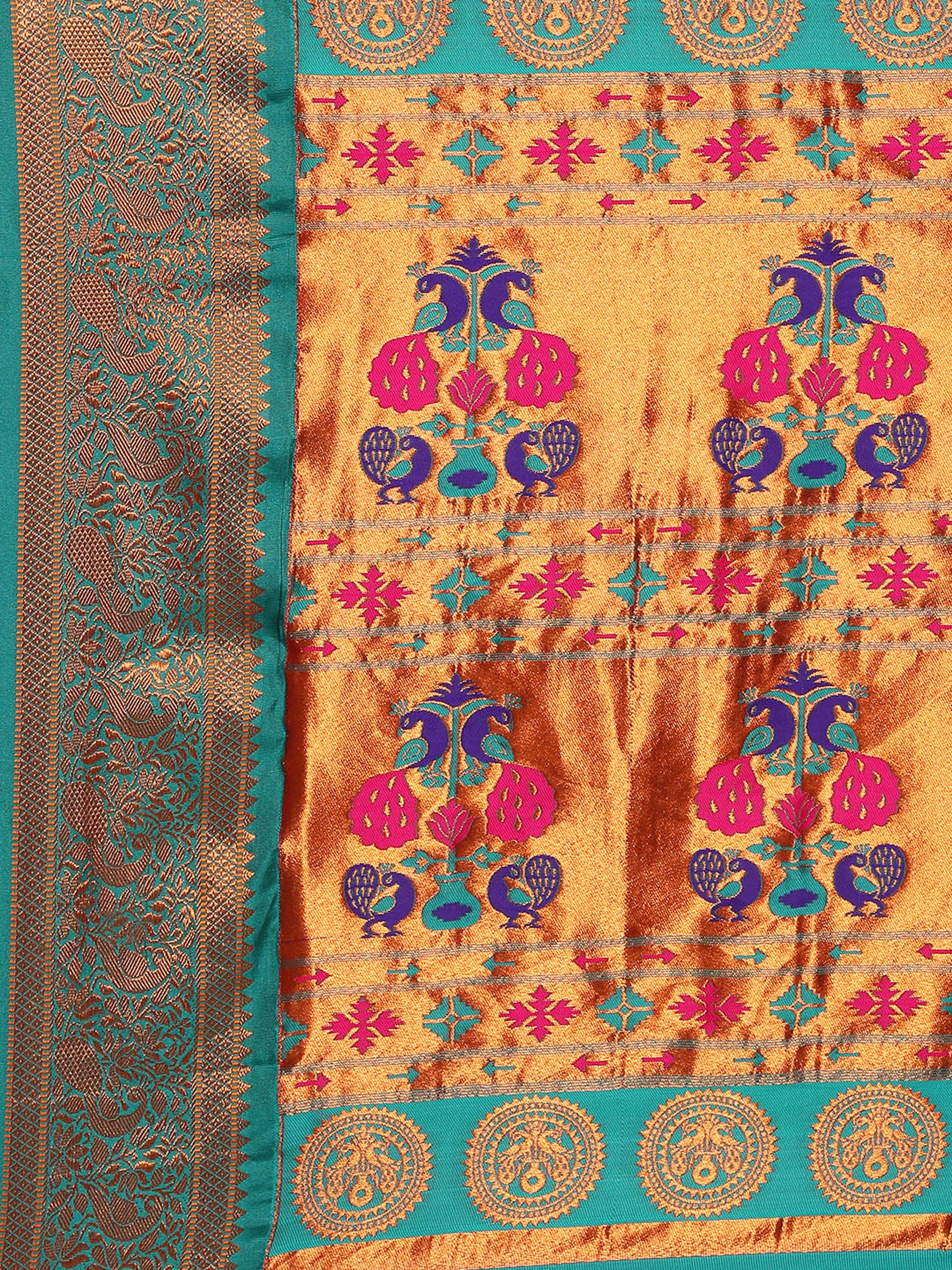 - Pallu Work Type: Copper Zari Woven Peacock Motifs