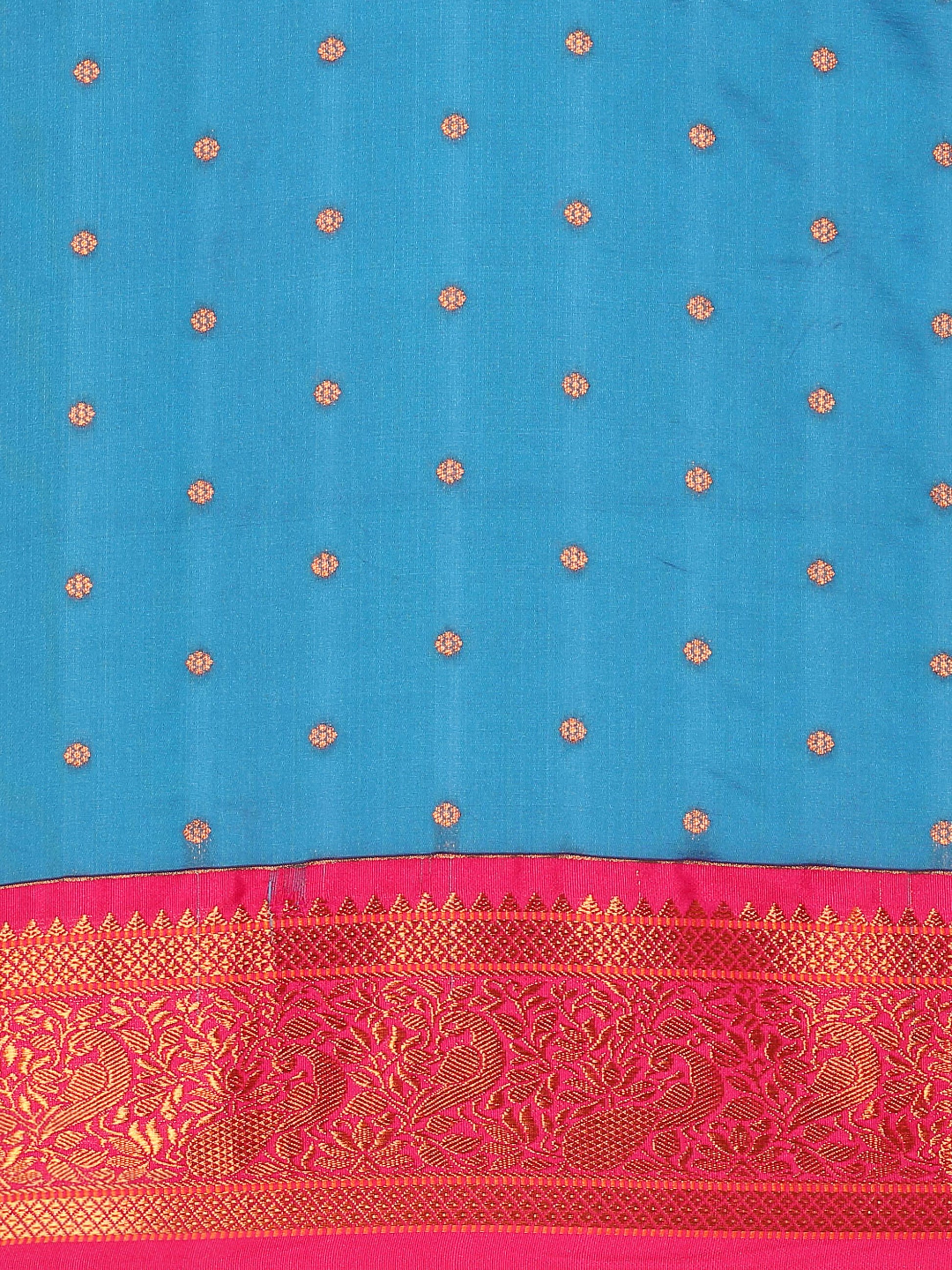 Explore The Collection Of Beautifully Designed Firozi & Pink Soft Silk Fancy Pallu Paithani Saree With Blouse Piece From Varkala Silk Sarees. This Exquisite Fancy Pallu Paithani Saree From Varkala Silk Sarees Combines Traditional Elegance With Modern Craftsmanship. Made From A Soft Silk Blend Of 70% Polyester And 30% Silk, It Offers A Luxurious Feel And Striking Durability. The 5.5-Meter Saree Features A Rich Copper Zari Border With Intricate Peacock Designs And Small Copper Butti Details On The Body, While The Pallu Is Adorned With Vibrant Copper Zari Woven Peacock Motifs, Creating A Stunning Visual Appeal. The Accompanying Blouse Piece Perfectly Complements The Saree's Royal Look. Ideal For Weddings, Parties, And Festivals, This Saree Should Be Dry-Cleaned For The First Wash, With Gentle Hand Washing Recommended Thereafter.
