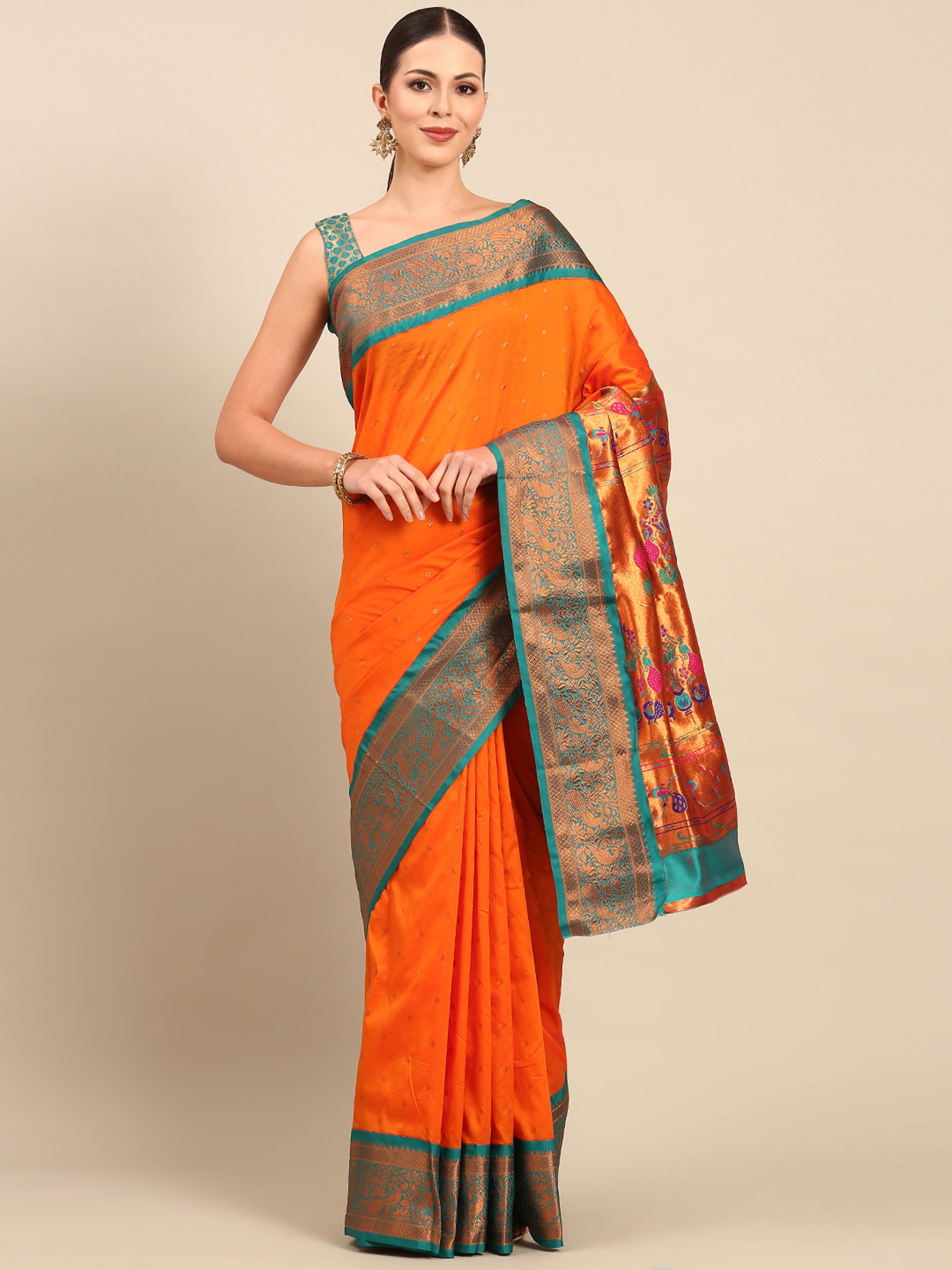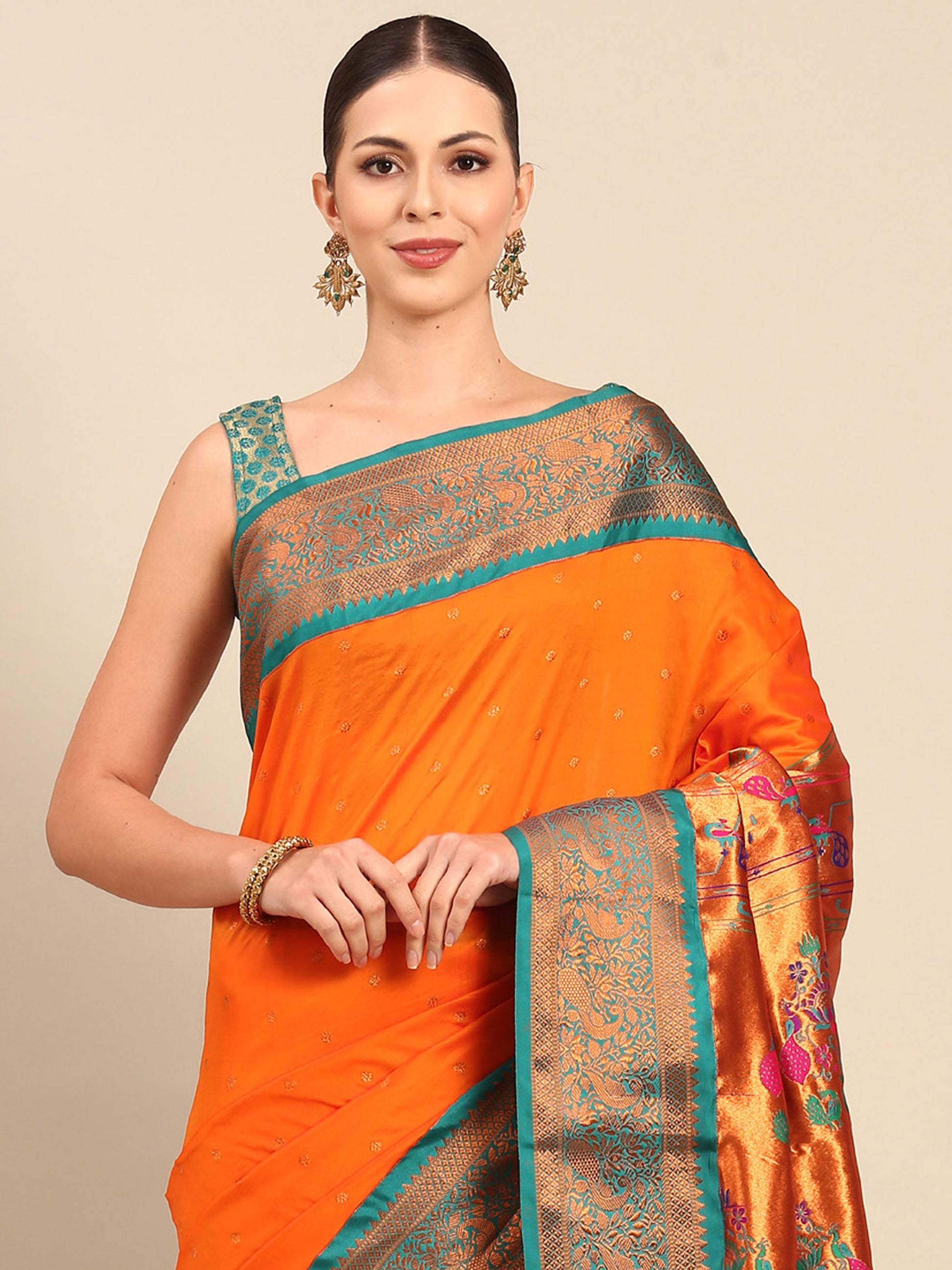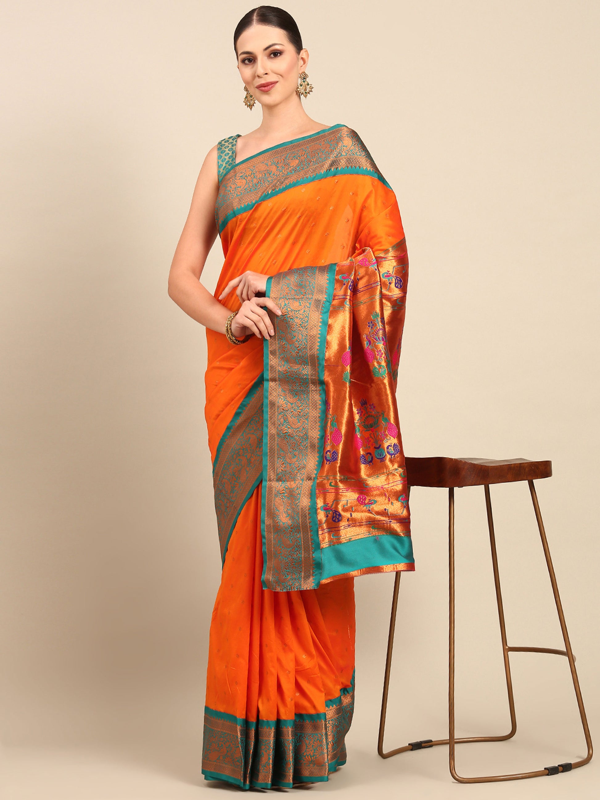 Explore The Collection Of Beautifully Designed Orange & Rama Soft Silk Fancy Pallu Paithani Saree With Blouse Piece From Varkala Silk Sarees. This Exquisite Fancy Pallu Paithani Saree From Varkala Silk Sarees Combines Traditional Elegance With Modern Craftsmanship. Made From A Soft Silk Blend Of 70% Polyester And 30% Silk, It Offers A Luxurious Feel And Striking Durability. The 5.5-Meter Saree Features A Rich Copper Zari Border With Intricate Peacock Designs And Small Copper Butti Details On The Body, While The Pallu Is Adorned With Vibrant Copper Zari Woven Peacock Motifs, Creating A Stunning Visual Appeal. The Accompanying Blouse Piece Perfectly Complements The Saree's Royal Look. Ideal For Weddings, Parties, And Festivals, This Saree Should Be Dry-Cleaned For The First Wash, With Gentle Hand Washing Recommended Thereafter.