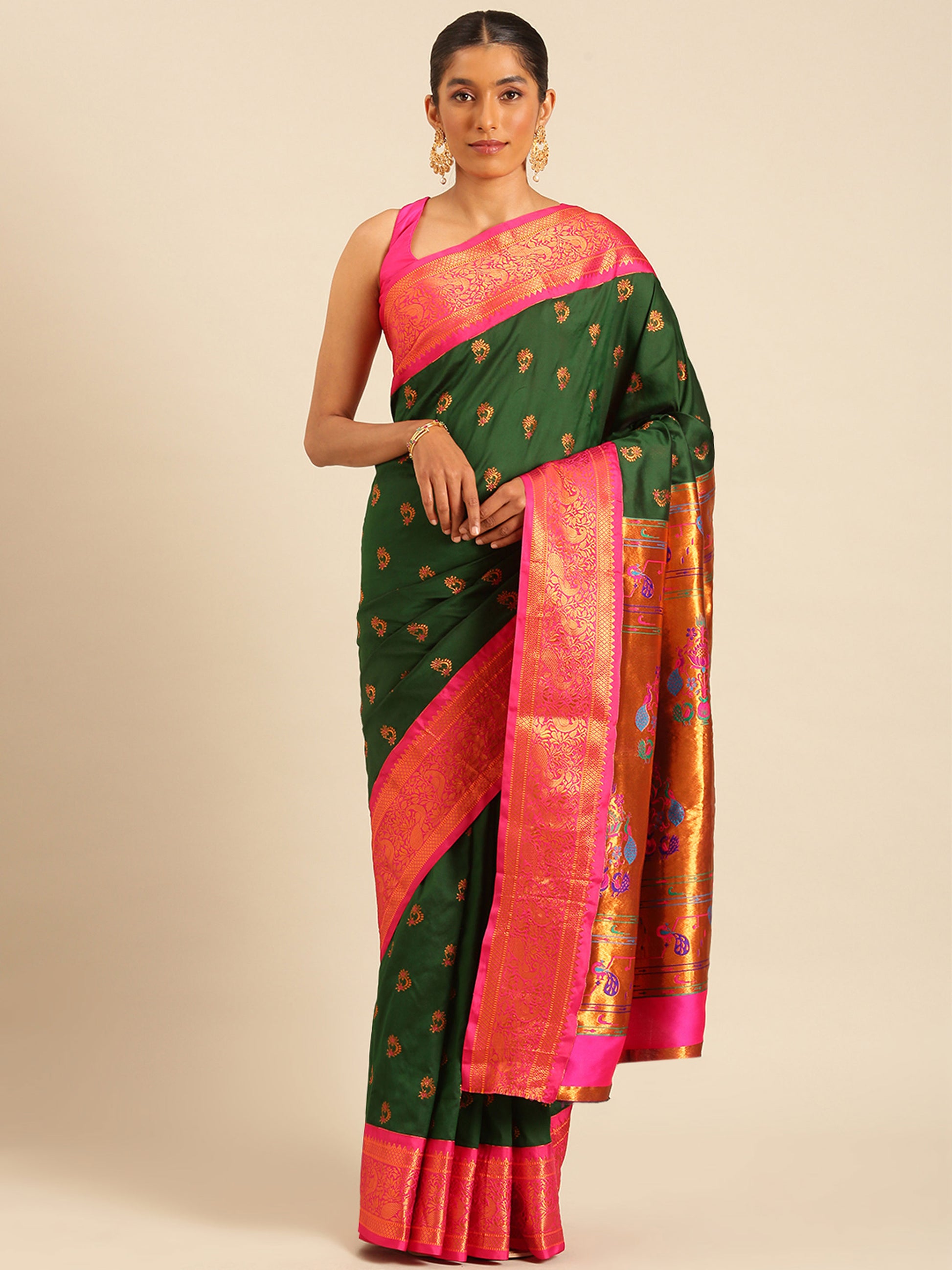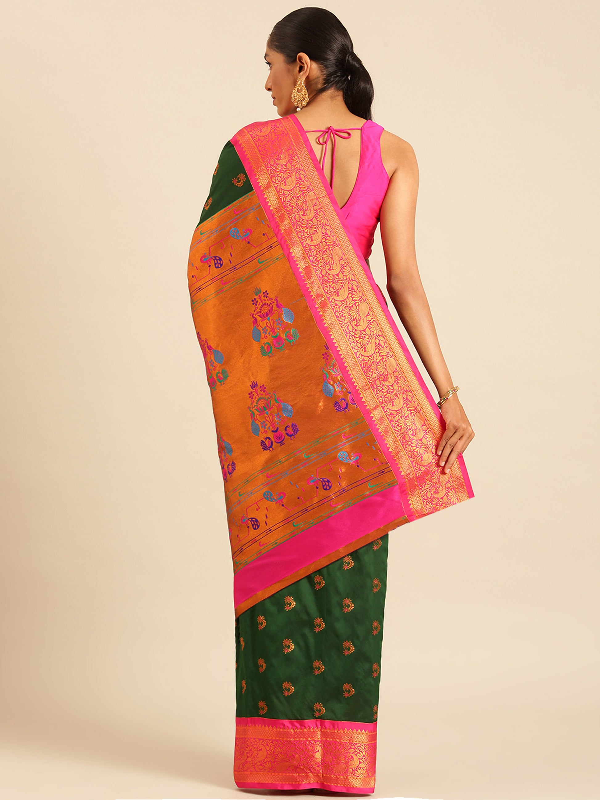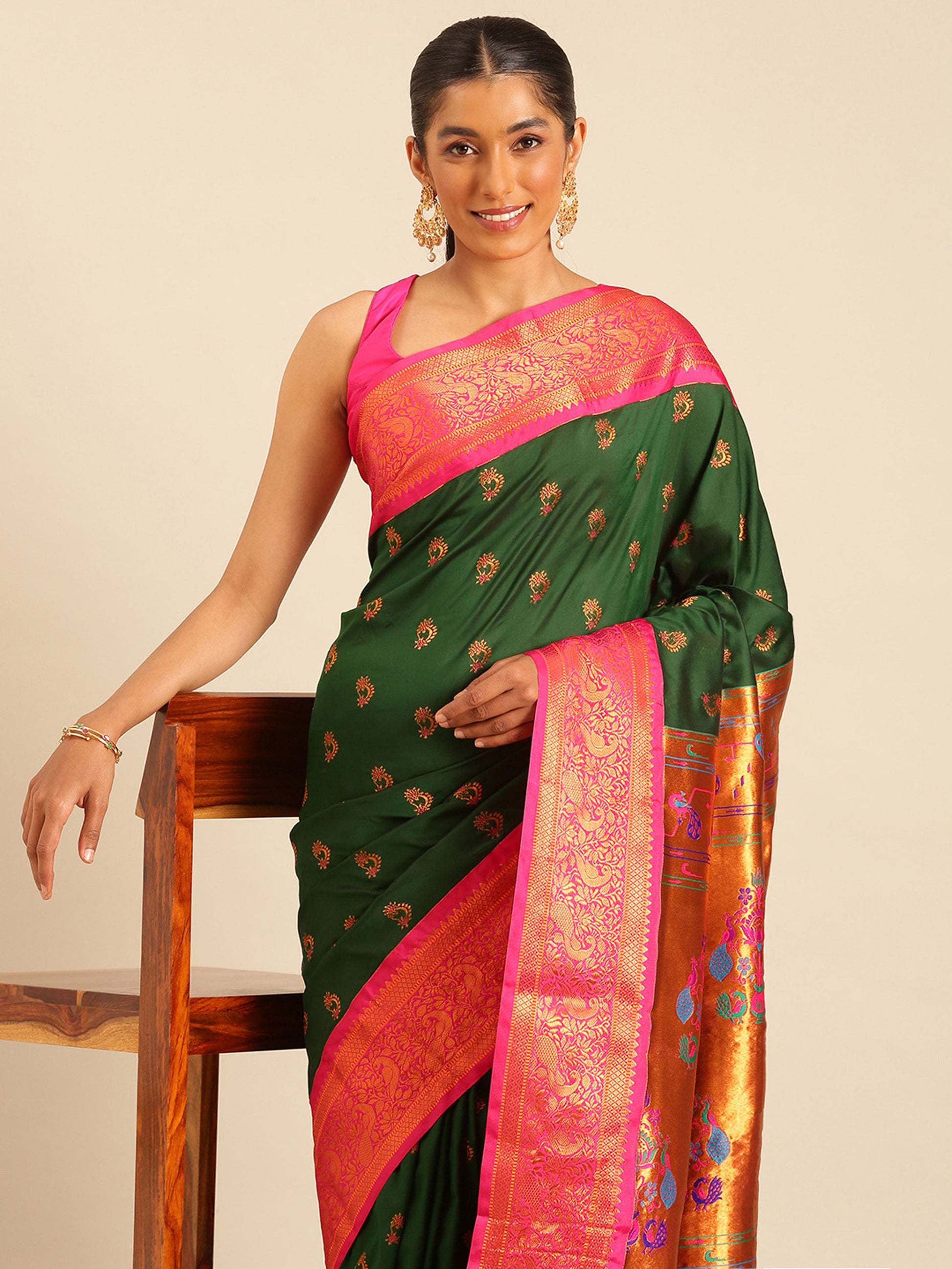 Explore The Collection Of Beautifully Designed Bottle Green & Pink Soft Silk Peshwai Nath Paithani Saree With Blouse Piece From Varkala Silk Sarees. Add A Touch Of Timeless Elegance To Your Wardrobe With The Peshwai Nath Paithani Saree, A Stunning Blend Of Tradition And Modern Grace. Made From Soft Silk Fabric With A Composition Of 70% Polyester And 30% Silk, This Saree Offers A Smooth Texture And Rich Drape. The 5.5-Meter Saree With A 0.8-Meter Blouse Piece Is Adorned With A Copper Zari Intricate Peacock Design Jacquard Border, Adding A Regal Charm. The Body Features Copper Zari Peshwai Nath Meena Butti, While The Pallu Showcases Copper Zari Woven Peacock Motifs, Symbolizing Prosperity And Beauty. Enhanced With Zari And Multicolor Resham Silk Thread Embellishments, This Woven Kadiyal Paithani Saree Is Perfect For Weddings, Parties, And Festive Occasions. It Comes With A Matching Blouse Piece To Complete Your Look. Dry Clean For The First Wash, Followed By Gentle Hand Wash. Elevate Your Ethnic Style With This Luxurious Paithani Masterpiece.