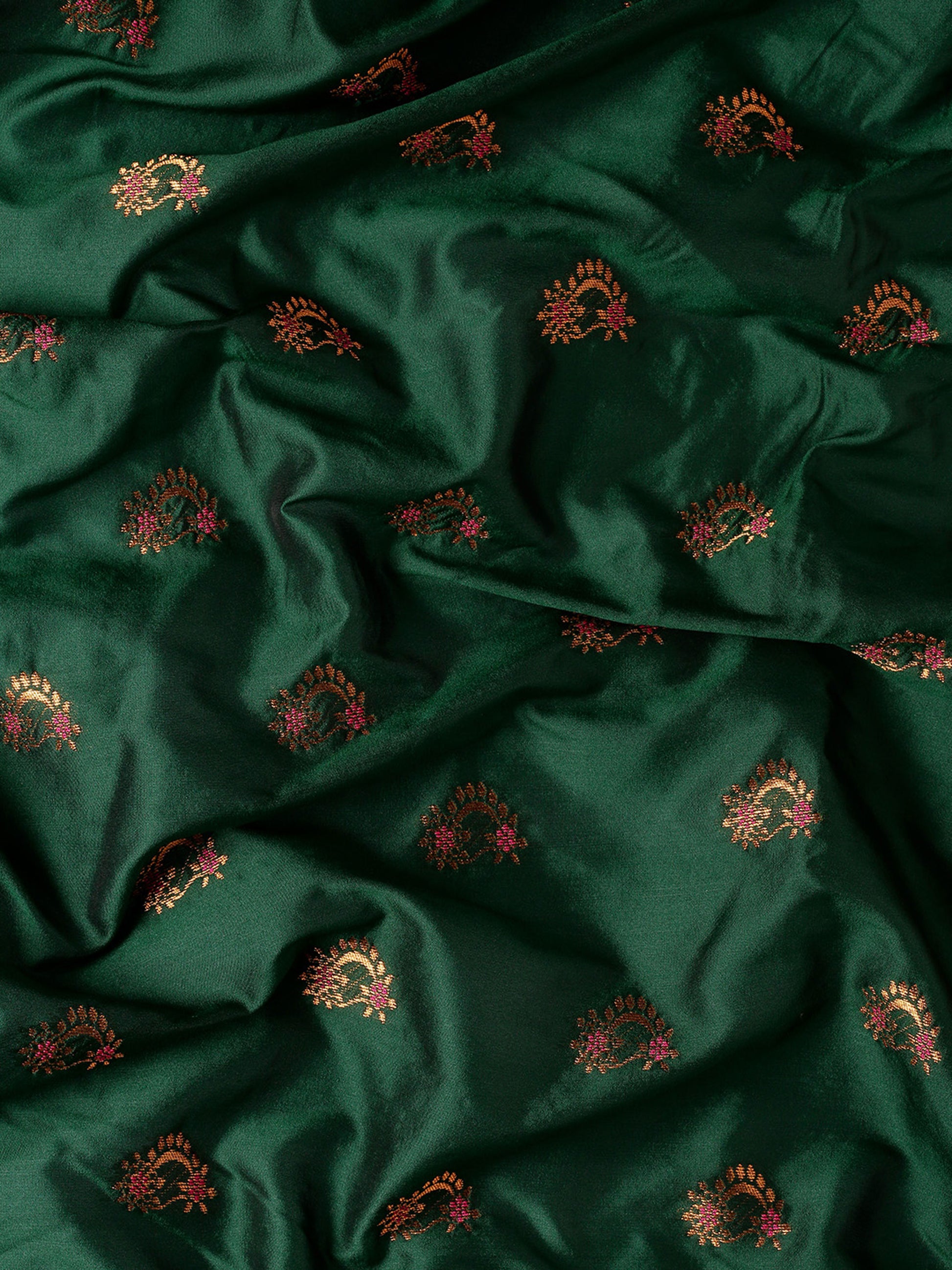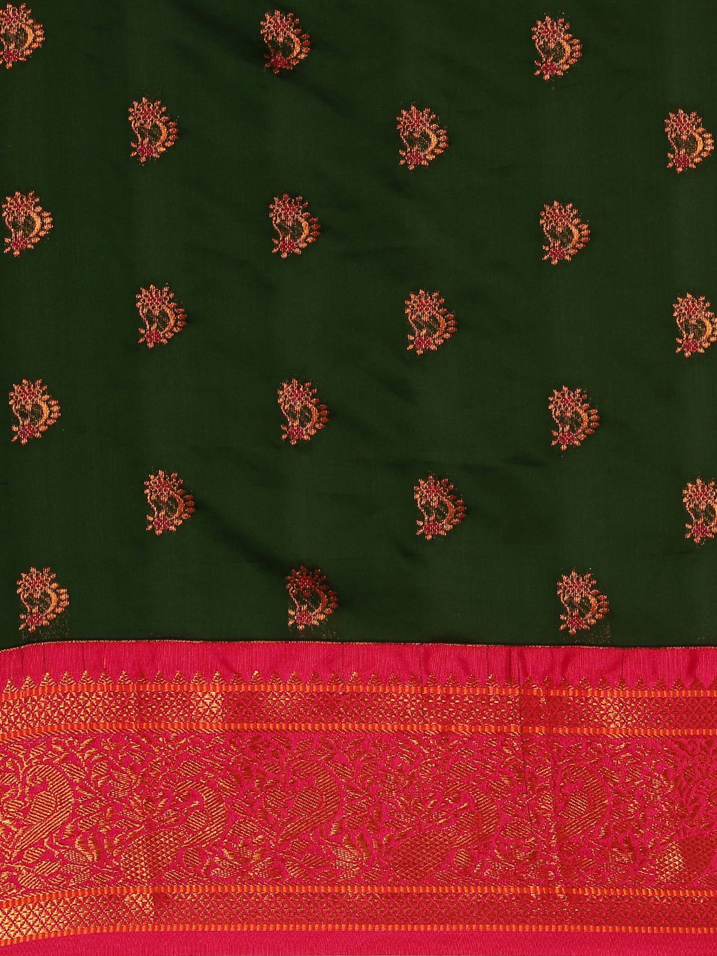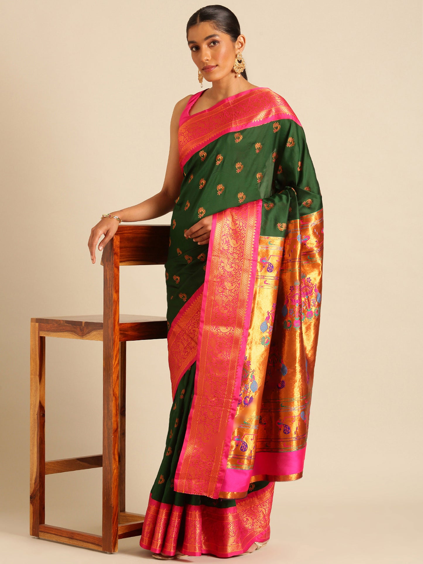 Explore The Collection Of Beautifully Designed Bottle Green & Pink Soft Silk Peshwai Nath Paithani Saree With Blouse Piece From Varkala Silk Sarees. Add A Touch Of Timeless Elegance To Your Wardrobe With The Peshwai Nath Paithani Saree, A Stunning Blend Of Tradition And Modern Grace. Made From Soft Silk Fabric With A Composition Of 70% Polyester And 30% Silk, This Saree Offers A Smooth Texture And Rich Drape. The 5.5-Meter Saree With A 0.8-Meter Blouse Piece Is Adorned With A Copper Zari Intricate Peacock Design Jacquard Border, Adding A Regal Charm. The Body Features Copper Zari Peshwai Nath Meena Butti, While The Pallu Showcases Copper Zari Woven Peacock Motifs, Symbolizing Prosperity And Beauty. Enhanced With Zari And Multicolor Resham Silk Thread Embellishments, This Woven Kadiyal Paithani Saree Is Perfect For Weddings, Parties, And Festive Occasions. It Comes With A Matching Blouse Piece To Complete Your Look. Dry Clean For The First Wash, Followed By Gentle Hand Wash. Elevate Your Ethnic Style With This Luxurious Paithani Masterpiece.