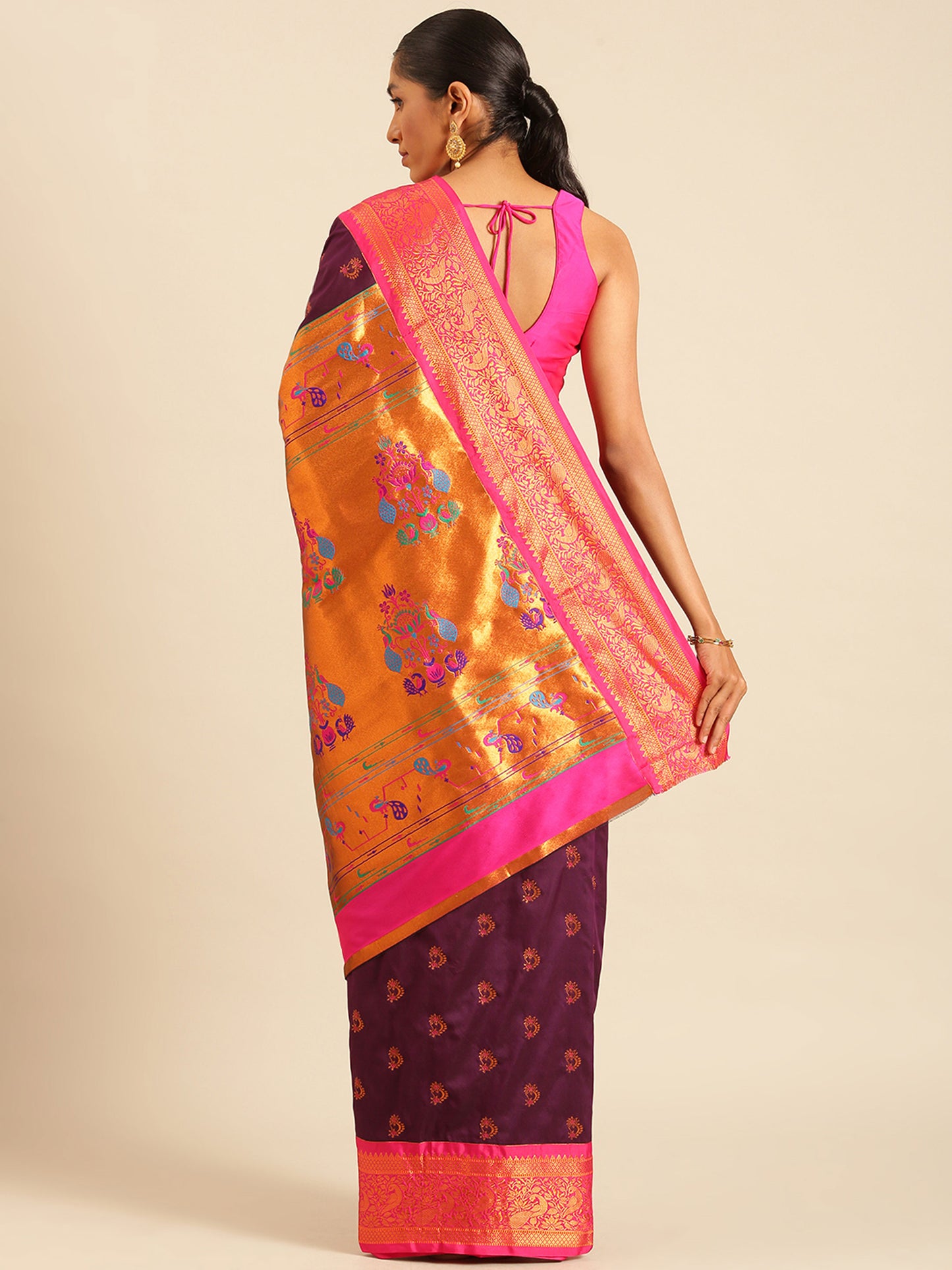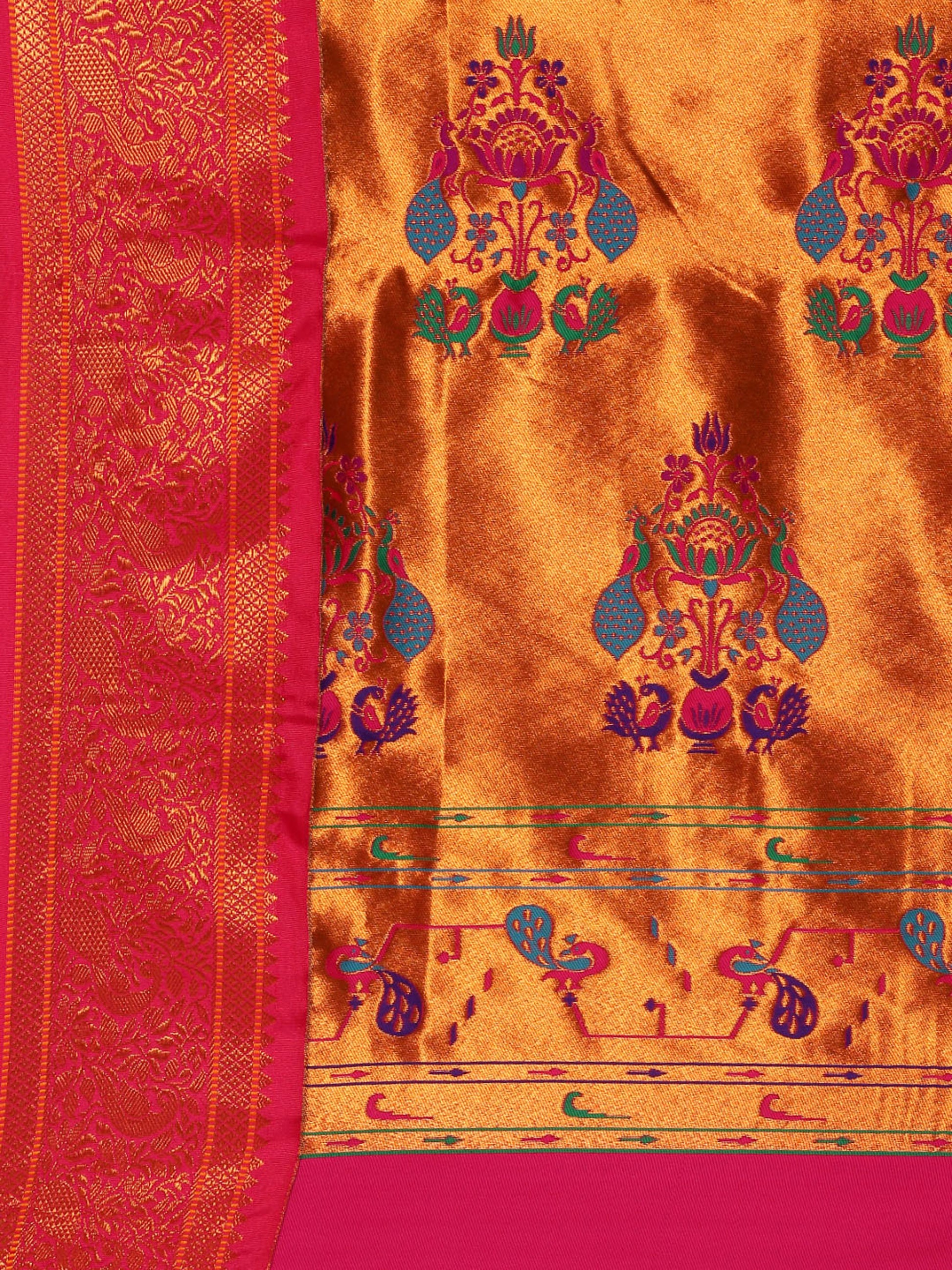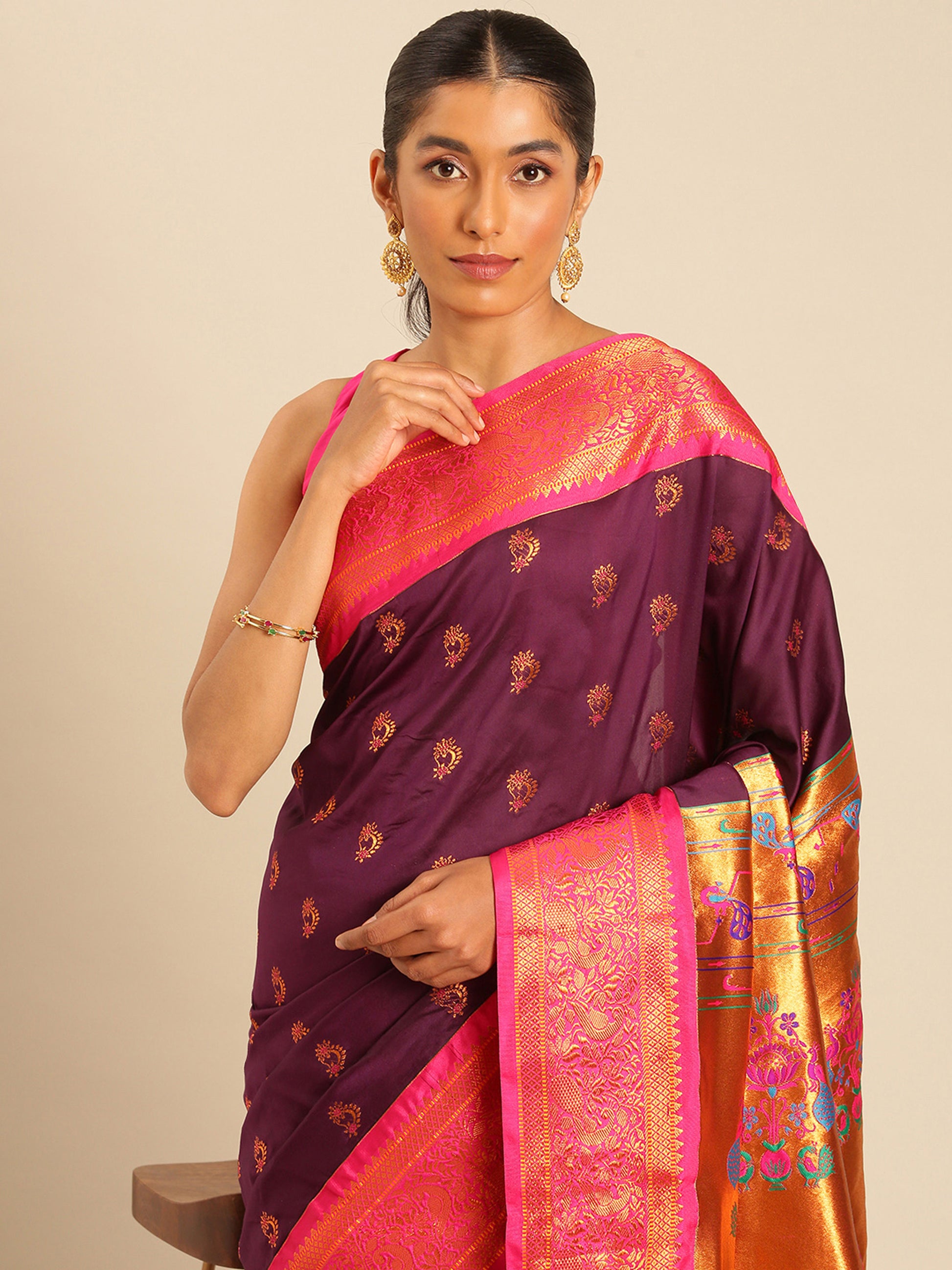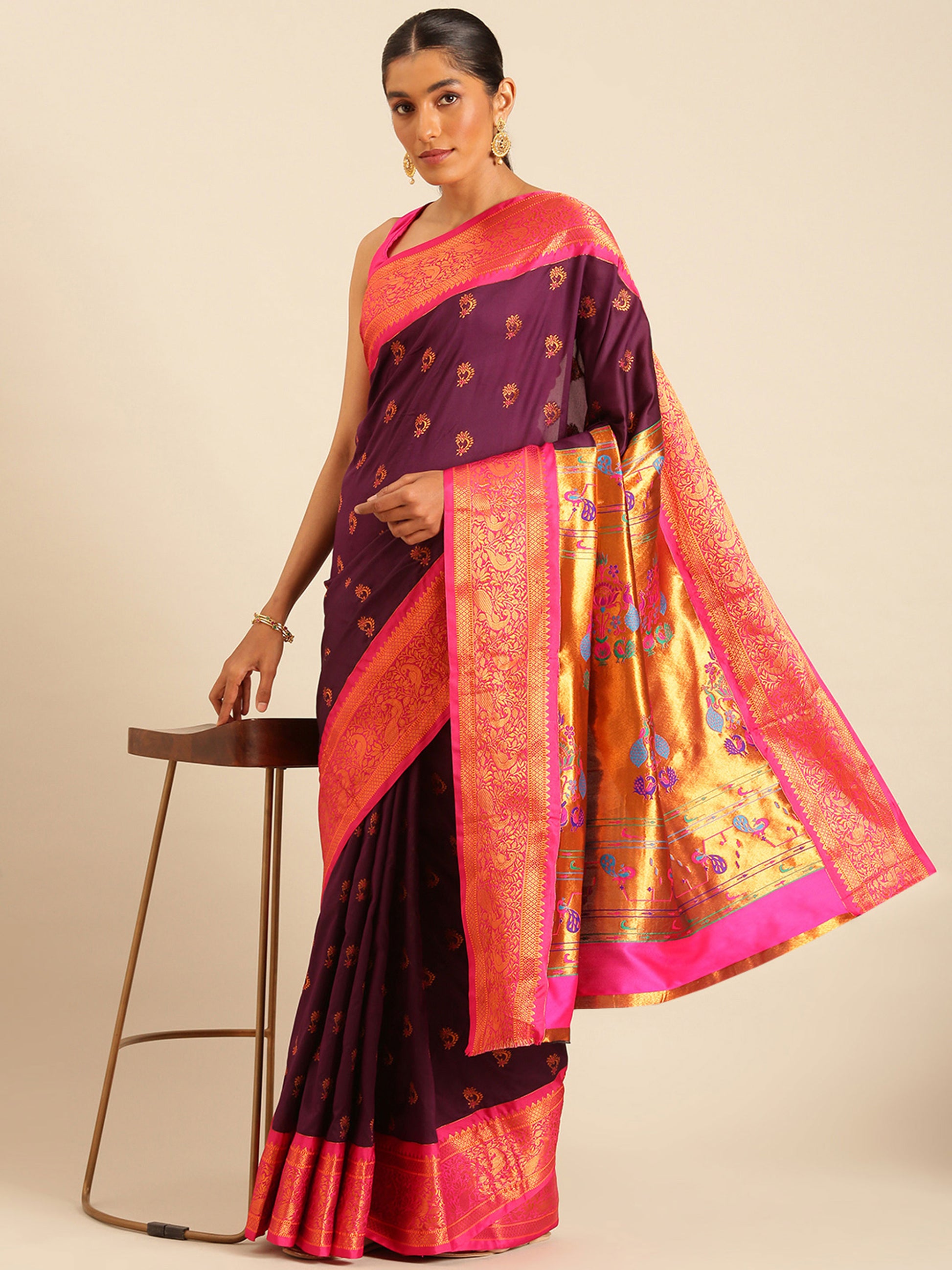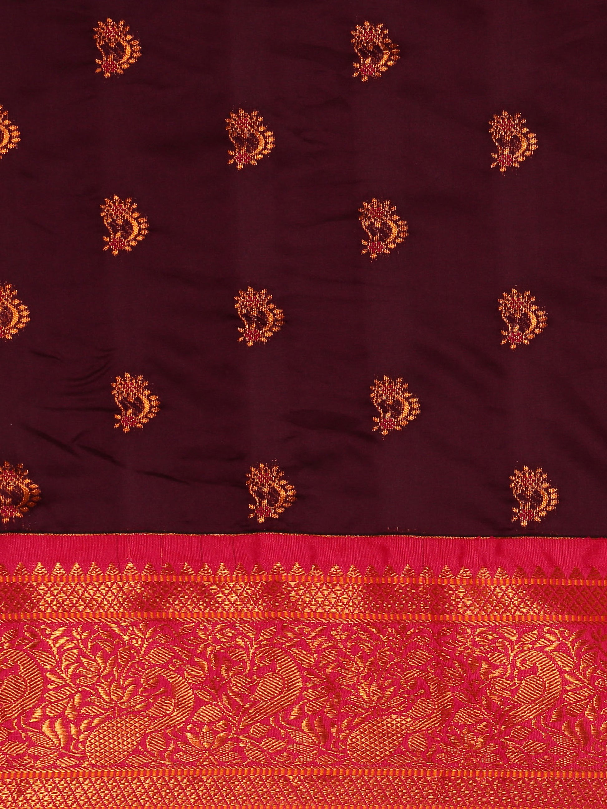 Explore The Collection Of Beautifully Designed Maroon & Pink Soft Silk Peshwai Nath Paithani Saree With Blouse Piece From Varkala Silk Sarees. Add A Touch Of Timeless Elegance To Your Wardrobe With The Peshwai Nath Paithani Saree, A Stunning Blend Of Tradition And Modern Grace. Made From Soft Silk Fabric With A Composition Of 70% Polyester And 30% Silk, This Saree Offers A Smooth Texture And Rich Drape. The 5.5-Meter Saree With A 0.8-Meter Blouse Piece Is Adorned With A Copper Zari Intricate Peacock Design Jacquard Border, Adding A Regal Charm. The Body Features Copper Zari Peshwai Nath Meena Butti, While The Pallu Showcases Copper Zari Woven Peacock Motifs, Symbolizing Prosperity And Beauty. Enhanced With Zari And Multicolor Resham Silk Thread Embellishments, This Woven Kadiyal Paithani Saree Is Perfect For Weddings, Parties, And Festive Occasions. It Comes With A Matching Blouse Piece To Complete Your Look. Dry Clean For The First Wash, Followed By Gentle Hand Wash. Elevate Your Ethnic Style With This Luxurious Paithani Masterpiece.