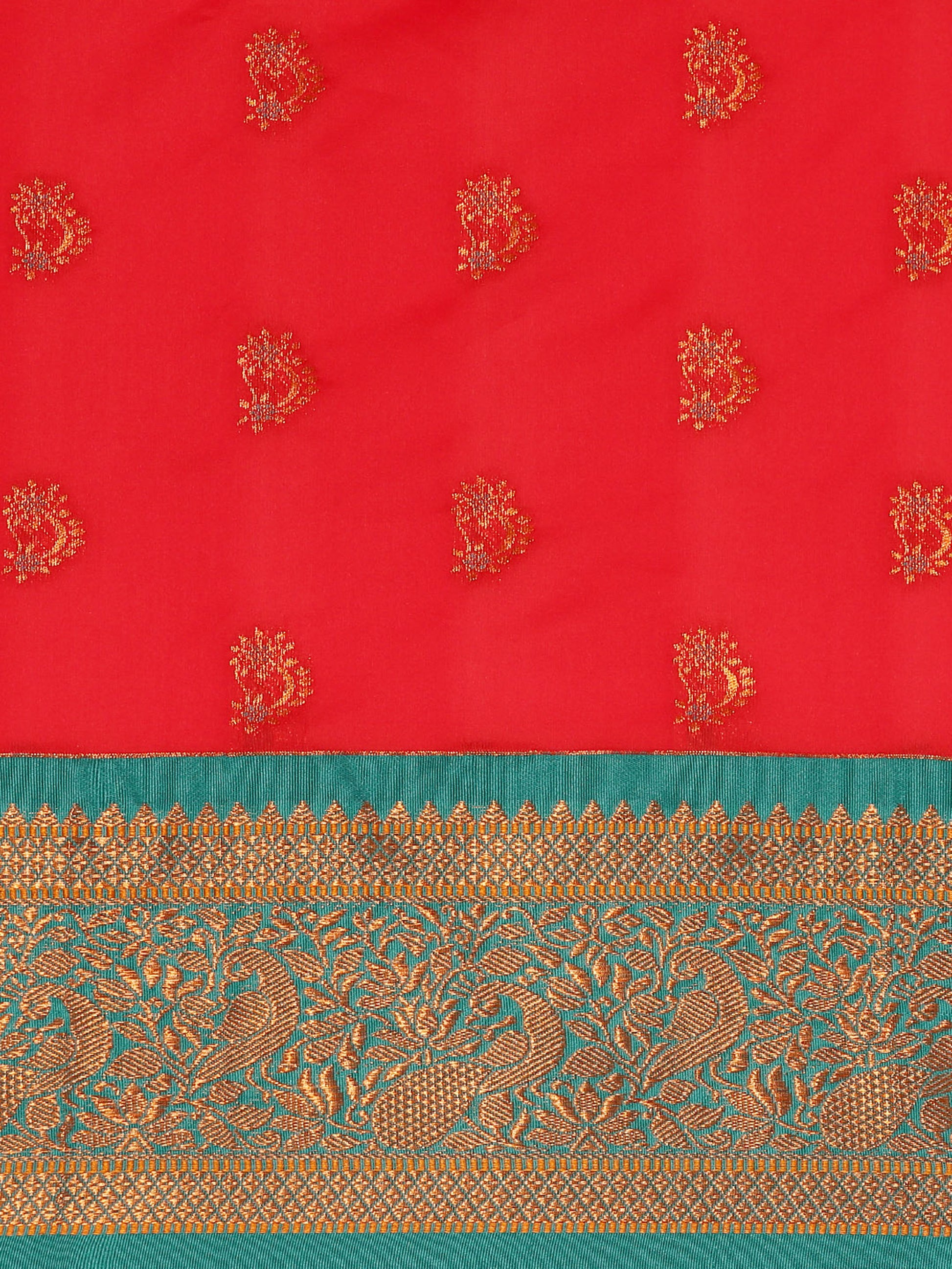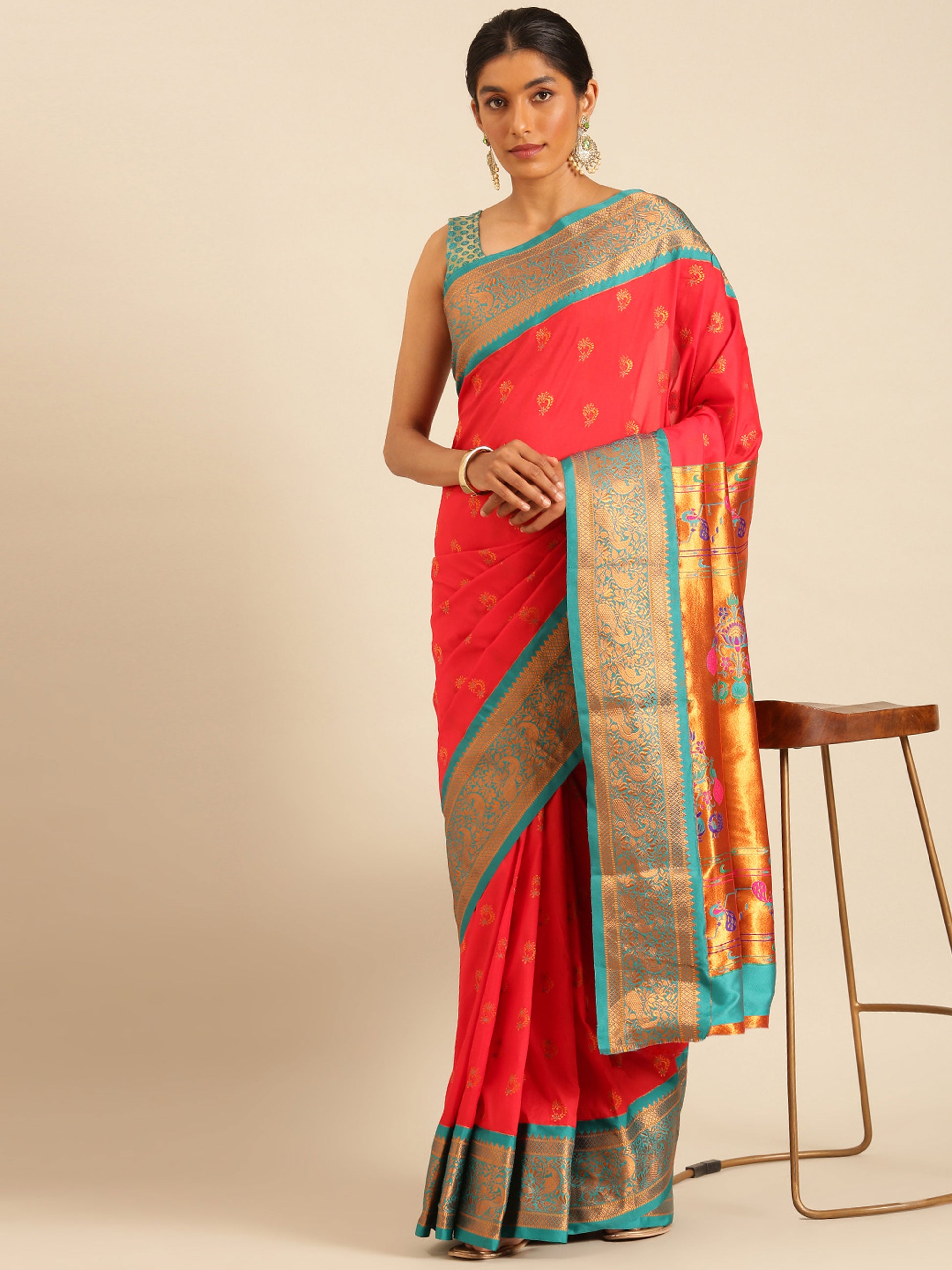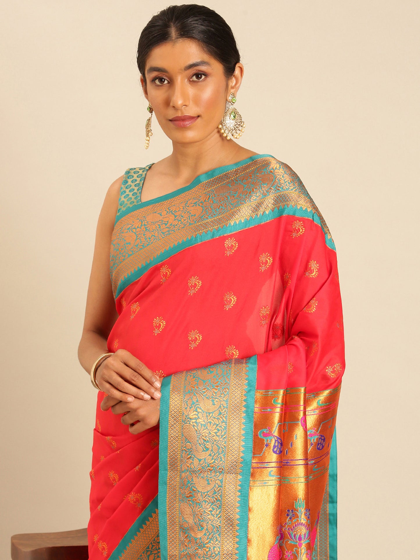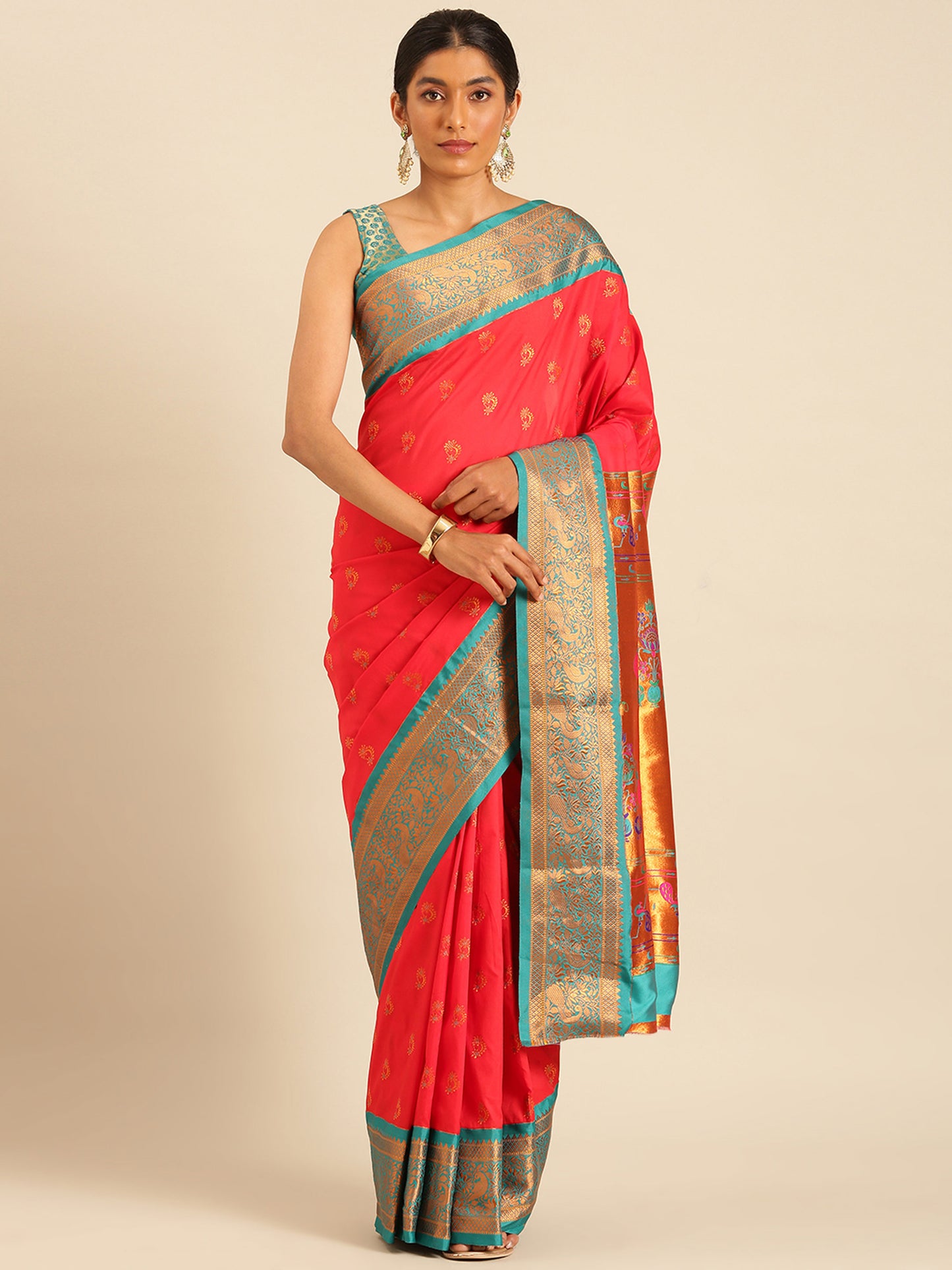 Explore The Collection Of Beautifully Designed Red & Rama Soft Silk Peshwai Nath Paithani Saree With Blouse Piece From Varkala Silk Sarees. Add A Touch Of Timeless Elegance To Your Wardrobe With The Peshwai Nath Paithani Saree, A Stunning Blend Of Tradition And Modern Grace. Made From Soft Silk Fabric With A Composition Of 70% Polyester And 30% Silk, This Saree Offers A Smooth Texture And Rich Drape. The 5.5-Meter Saree With A 0.8-Meter Blouse Piece Is Adorned With A Copper Zari Intricate Peacock Design Jacquard Border, Adding A Regal Charm. The Body Features Copper Zari Peshwai Nath Meena Butti, While The Pallu Showcases Copper Zari Woven Peacock Motifs, Symbolizing Prosperity And Beauty. Enhanced With Zari And Multicolor Resham Silk Thread Embellishments, This Woven Kadiyal Paithani Saree Is Perfect For Weddings, Parties, And Festive Occasions. It Comes With A Matching Blouse Piece To Complete Your Look. Dry Clean For The First Wash, Followed By Gentle Hand Wash. Elevate Your Ethnic Style With This Luxurious Paithani Masterpiece.