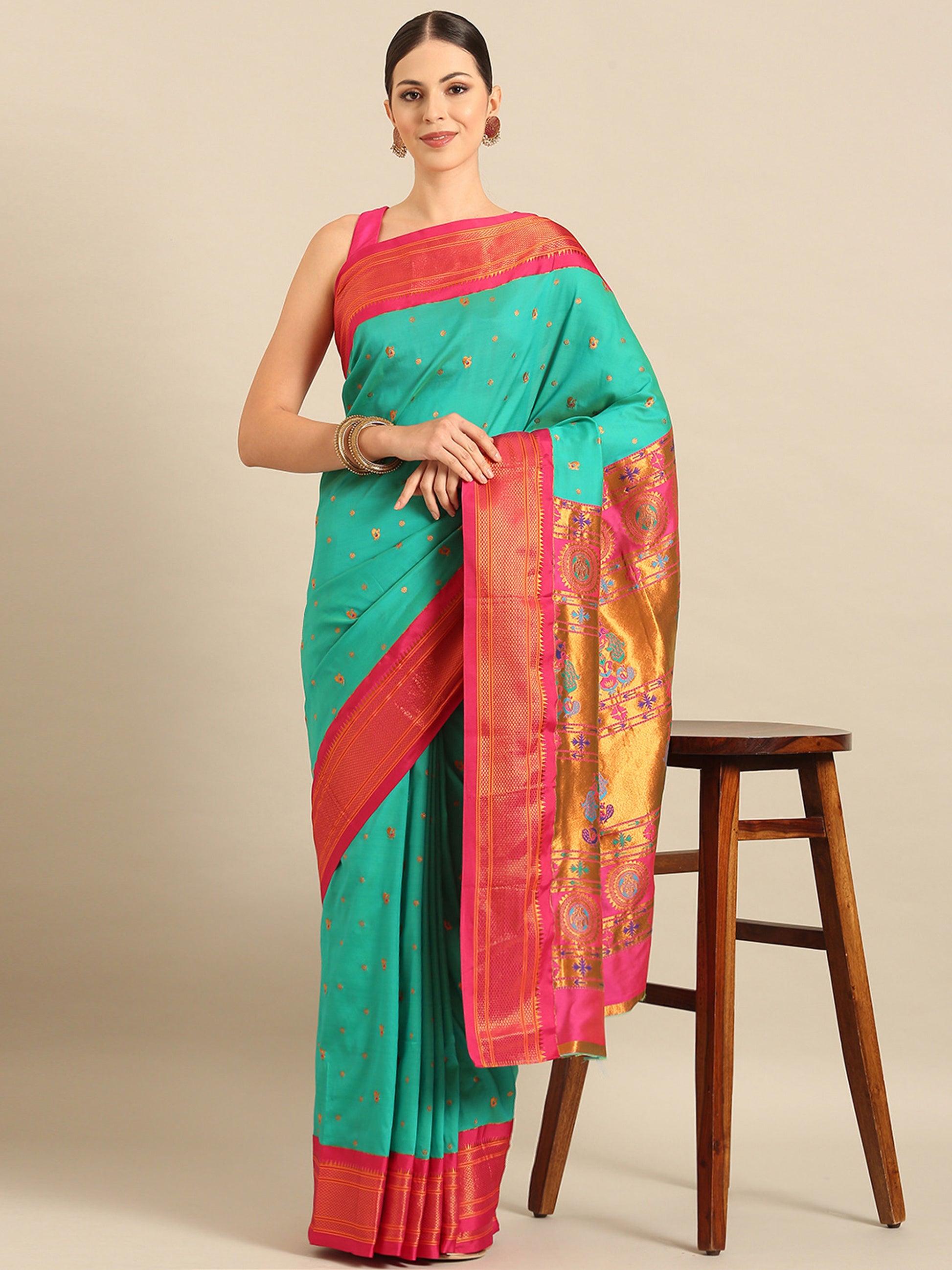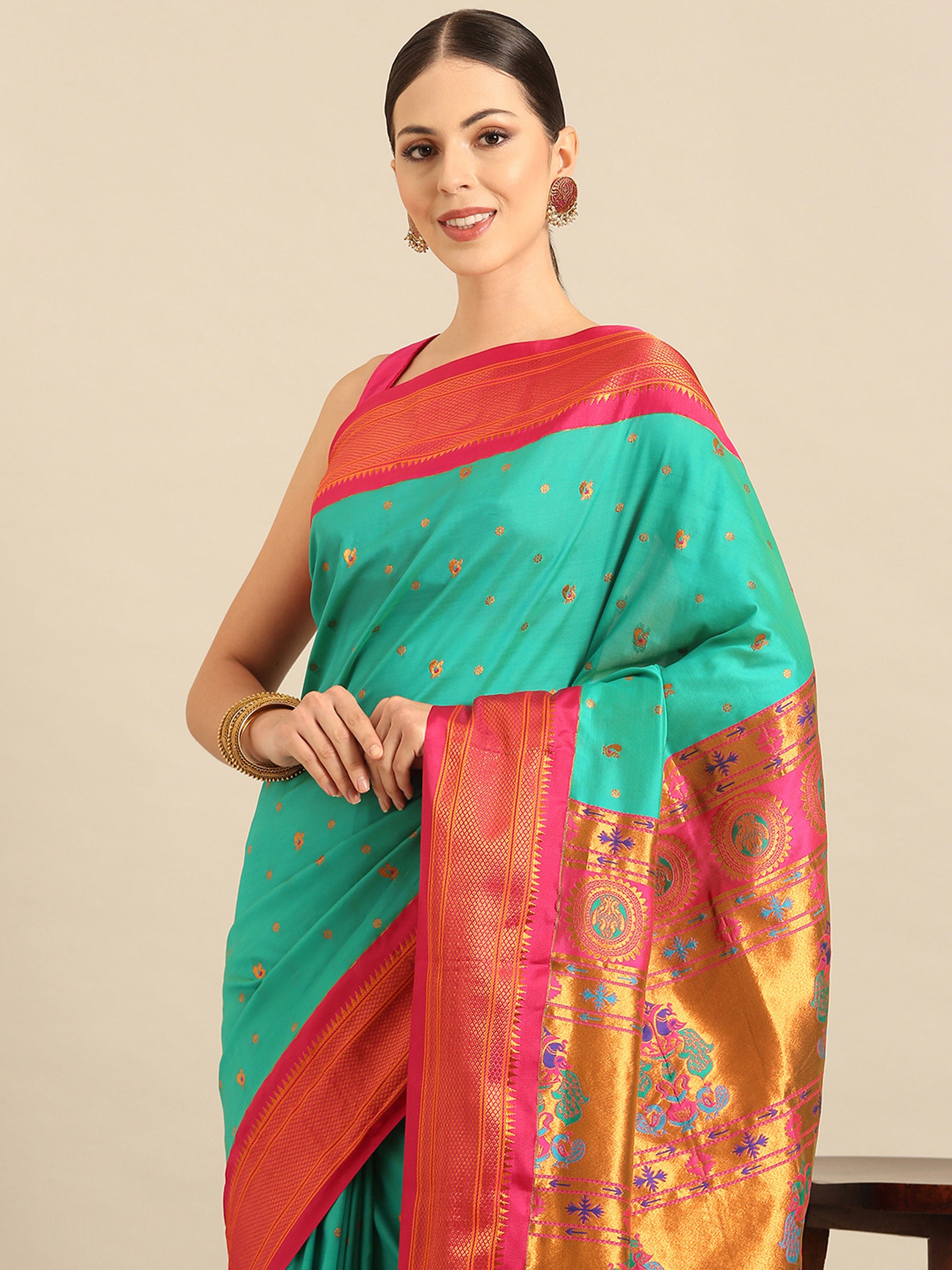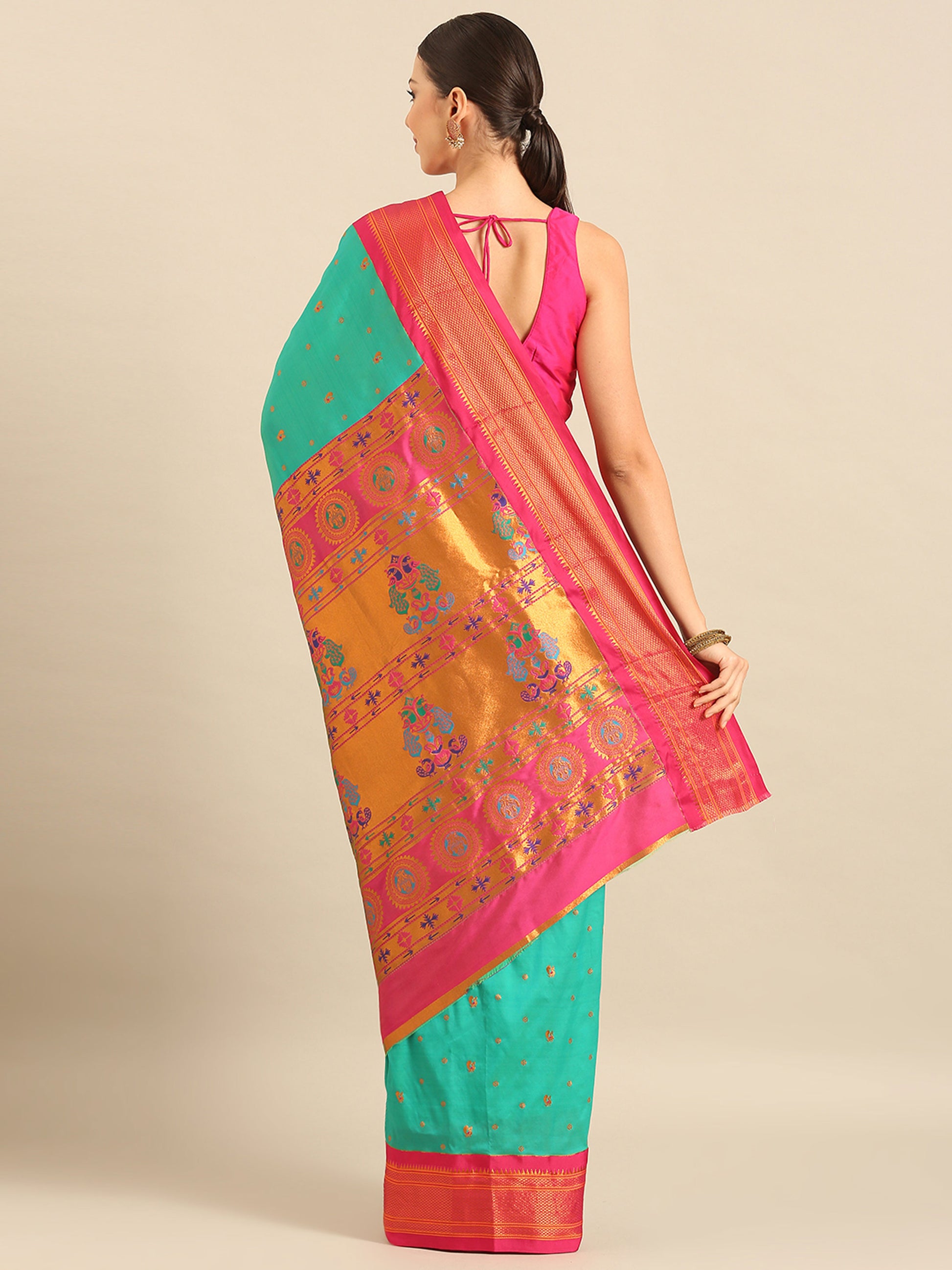 Mukta Sea Green & Pink Soft Silk Kadiyal Maharani Paithani Saree