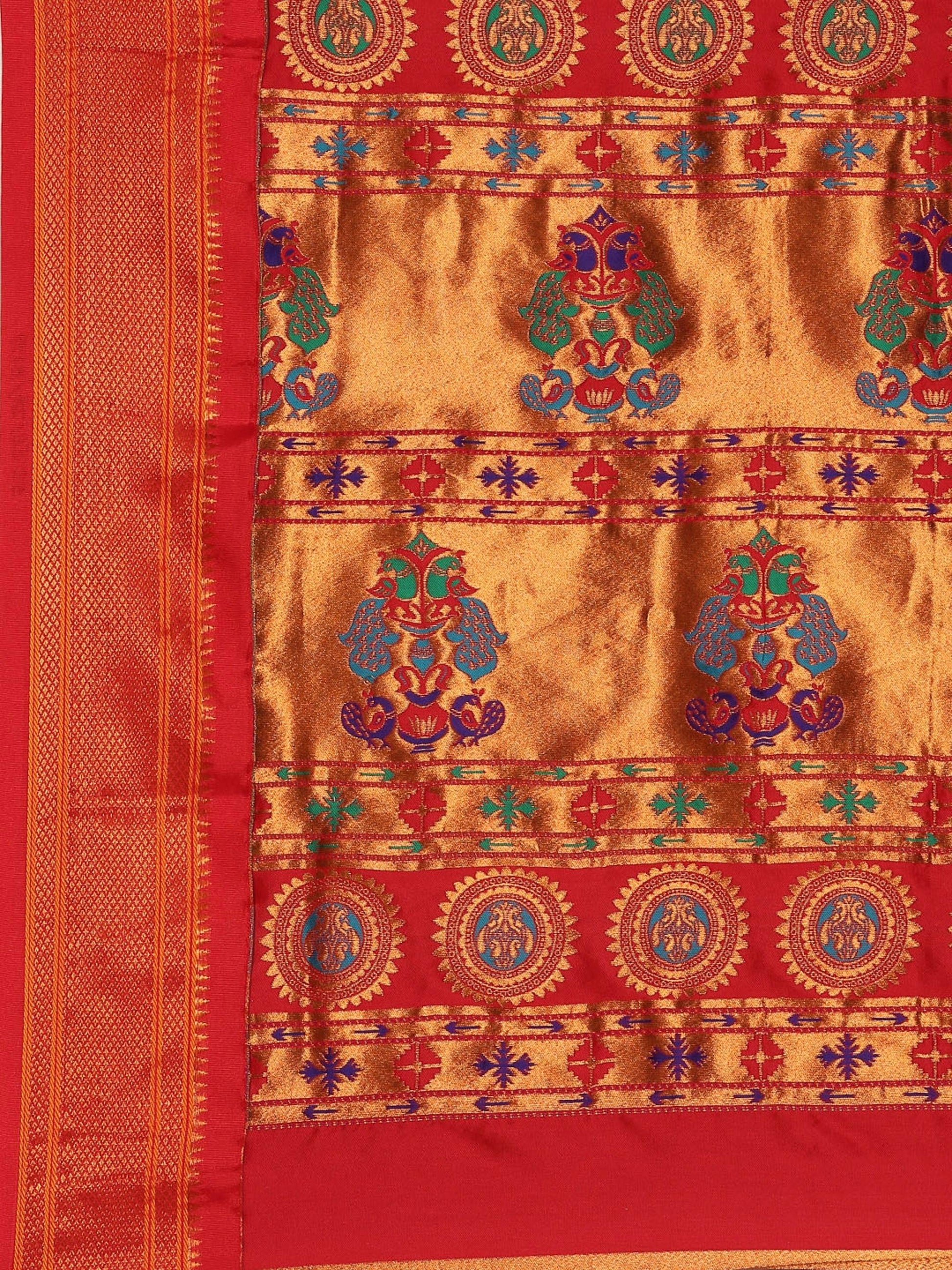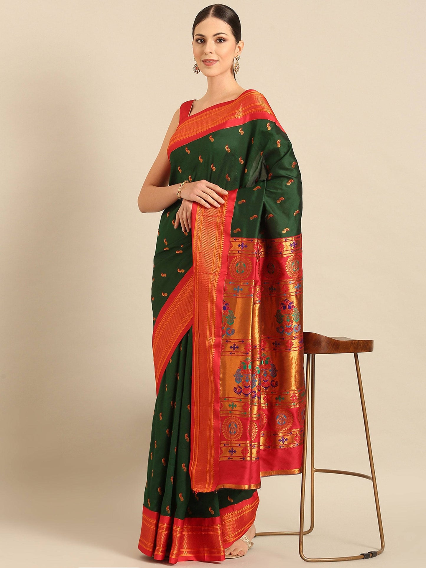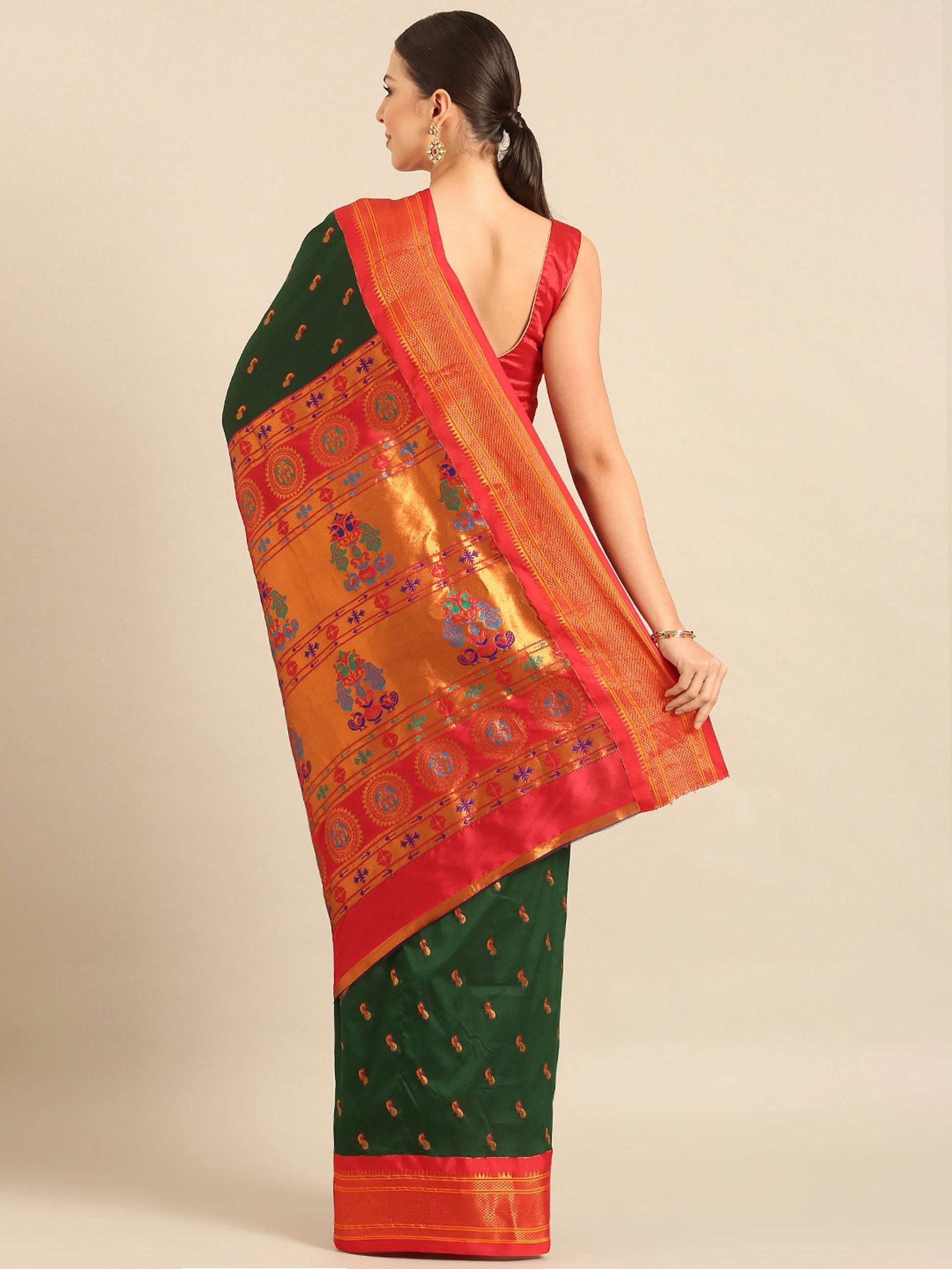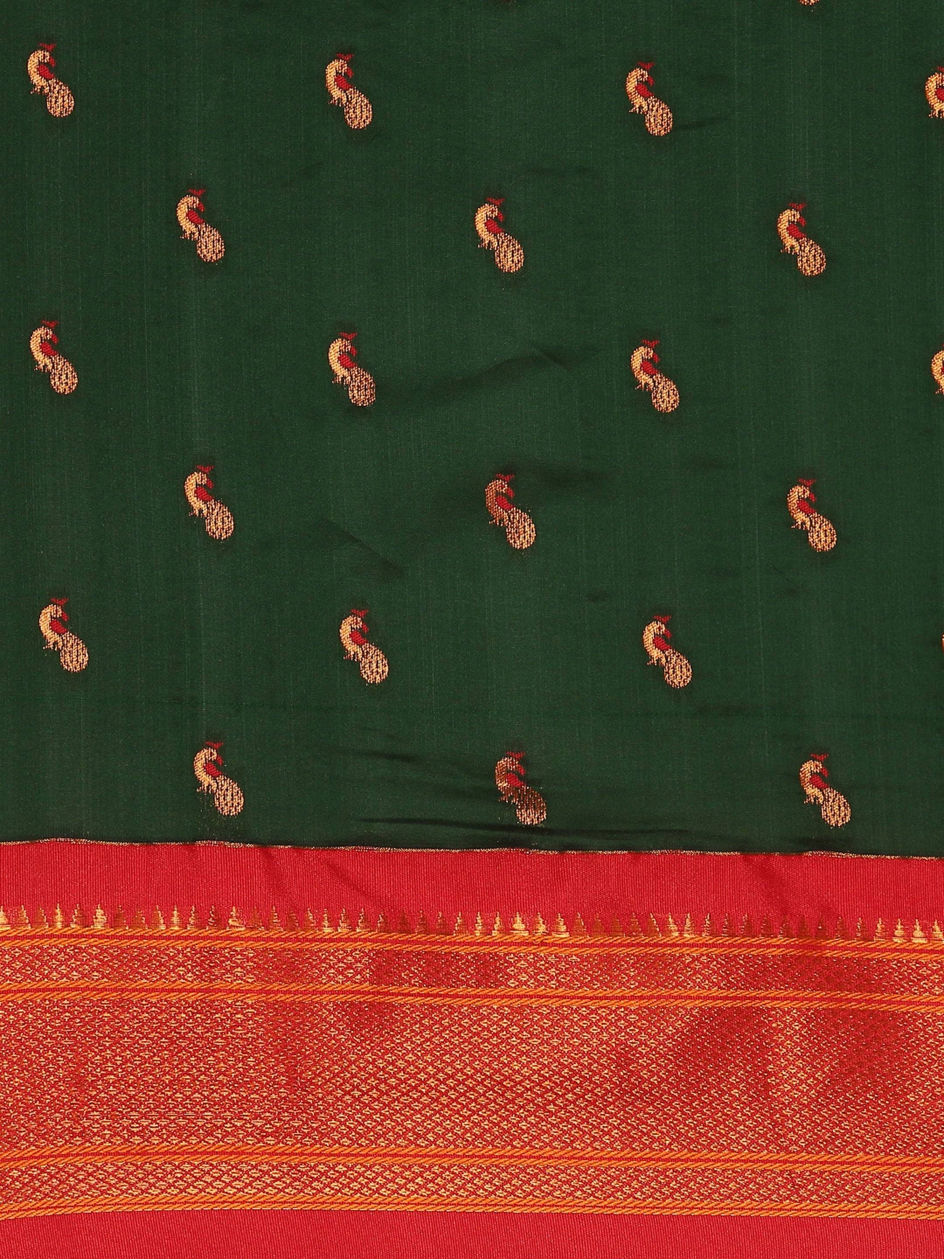 Myra Bottle Green & Red Soft Silk Kadiyal Maharani Paithani Saree