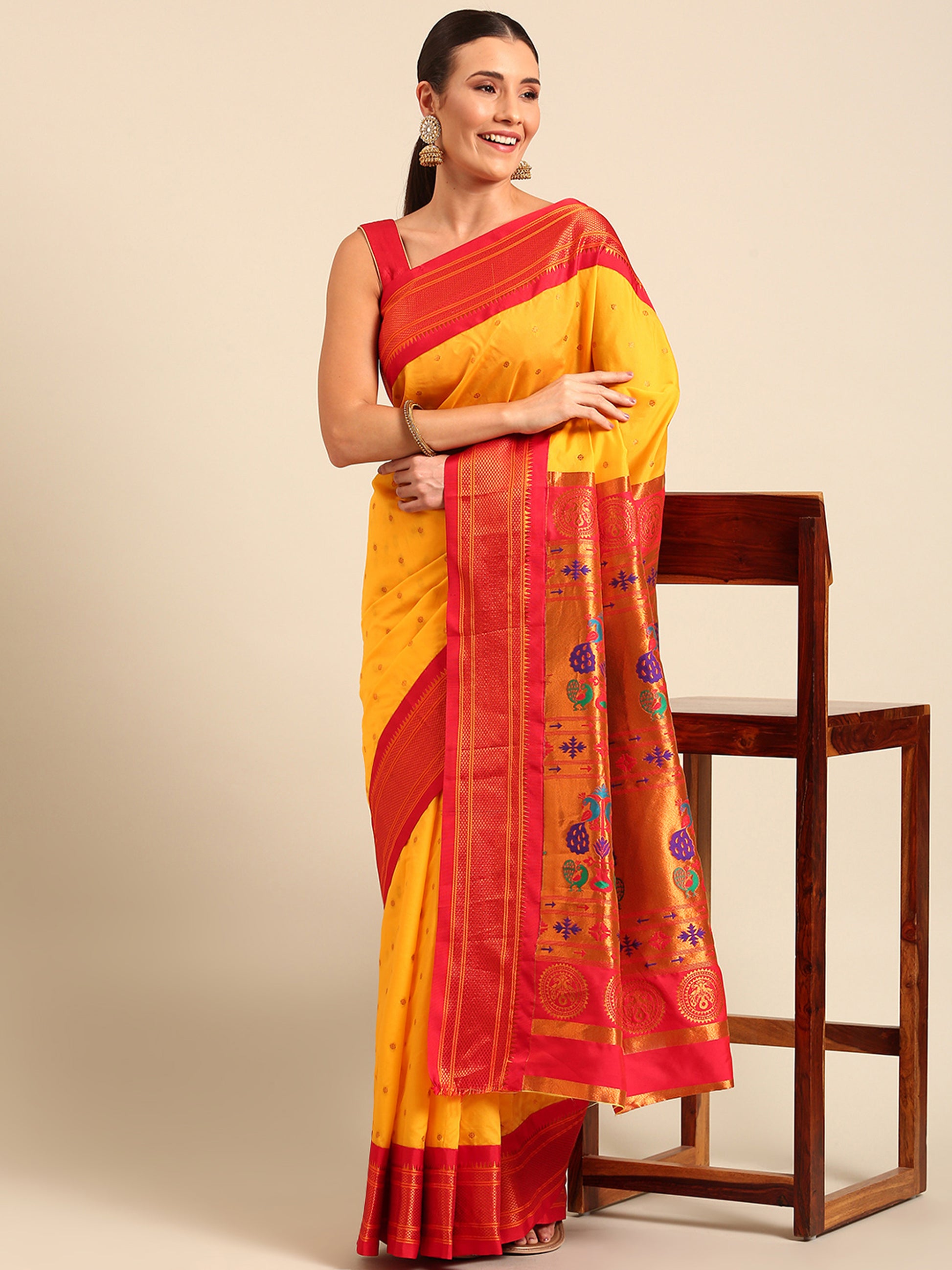 Explore The Collection Of Beautifully Designed Haldi & Red Soft Silk Maharani Paithani Saree From Varkala Silk Sarees. Exude regal elegance with this stunning Maharani Paithani saree, perfect for weddings, parties, and festivals. This saree features a rich border with intricate checks design and is adorned with delicate flower copper zari butti across the body. The luxurious pallu showcases elaborate copper zari woven floral & peacock motifs, adding a majestic touch. Complete with an unstitched blouse piece, this saree seamlessly blends traditional artistry with sophisticated style.