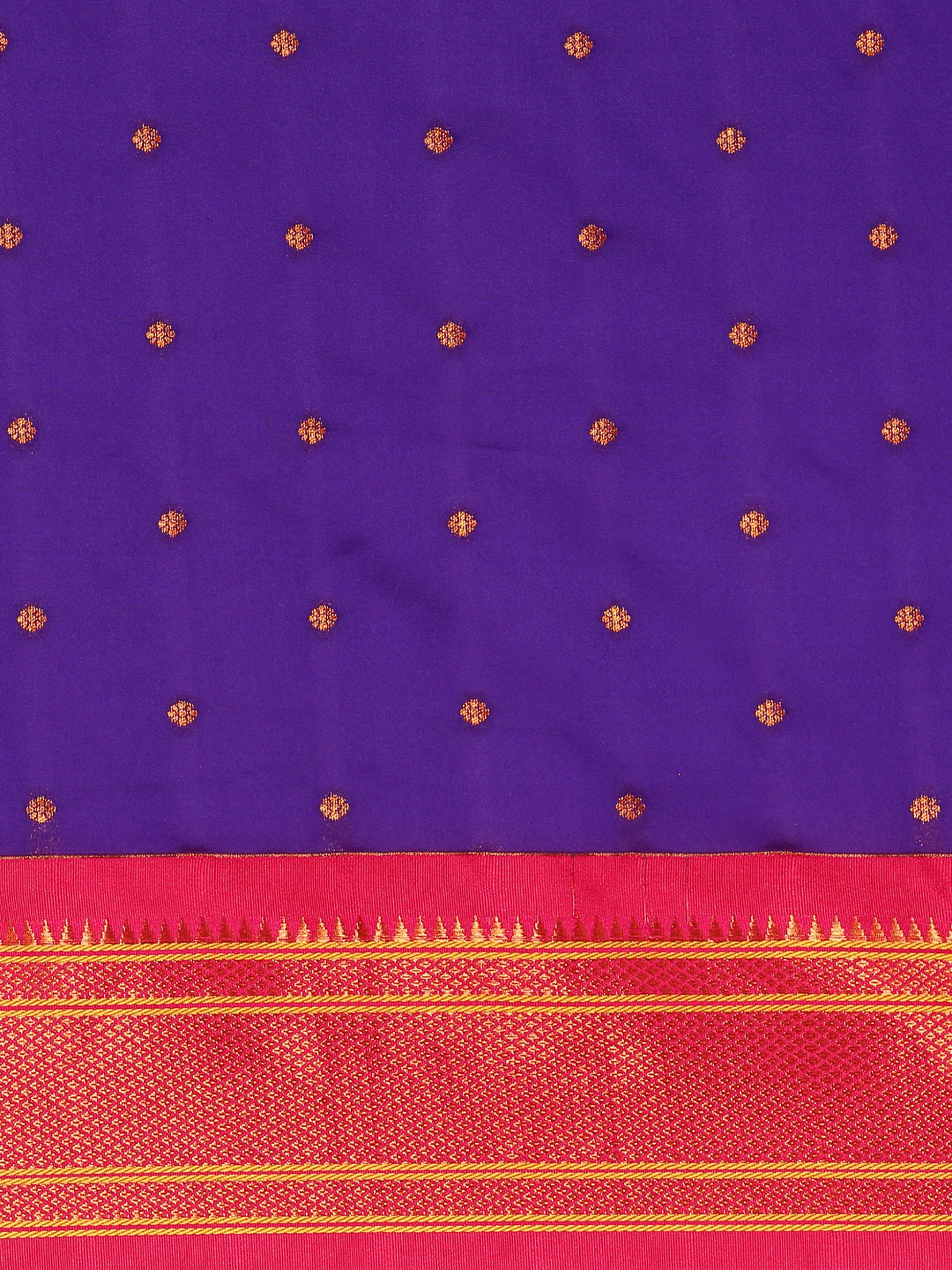 Explore The Collection Of Beautifully Designed Indigo Blue & Pink Soft Silk Maharani Paithani Saree From Varkala Silk Sarees. Exude regal elegance with this stunning Maharani Paithani saree, perfect for weddings, parties, and festivals. This saree features a rich border with intricate checks design and is adorned with delicate flower copper zari butti across the body. The luxurious pallu showcases elaborate copper zari woven floral & peacock motifs, adding a majestic touch. Complete with an unstitched blouse piece, this saree seamlessly blends traditional artistry with sophisticated style.