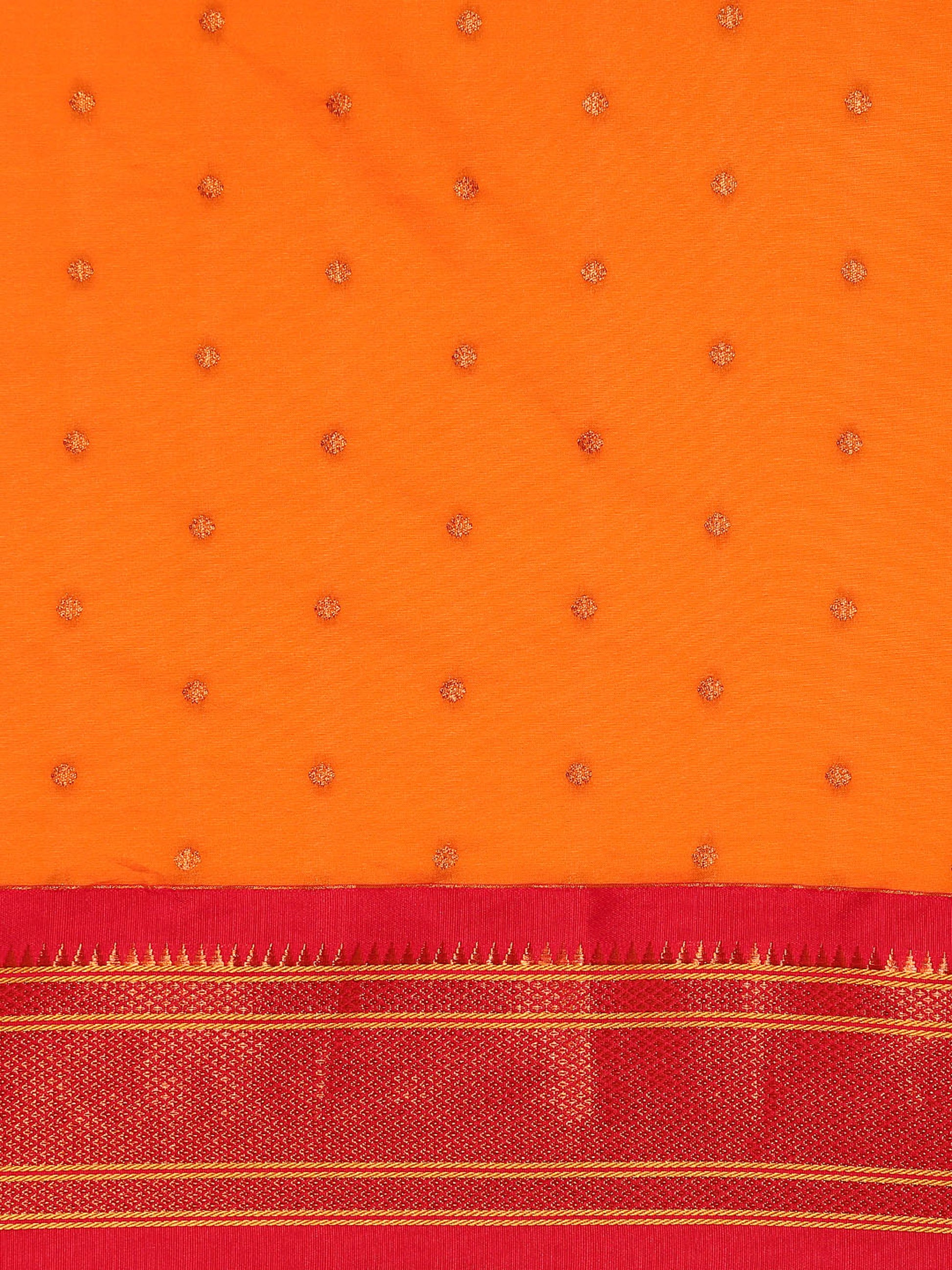 Explore The Collection Of Beautifully Designed Orange & Red Soft Silk Maharani Paithani Saree From Varkala Silk Sarees. Exude regal elegance with this stunning Maharani Paithani saree, perfect for weddings, parties, and festivals. This saree features a rich border with intricate checks design and is adorned with delicate flower copper zari butti across the body. The luxurious pallu showcases elaborate copper zari woven floral & peacock motifs, adding a majestic touch. Complete with an unstitched blouse piece, this saree seamlessly blends traditional artistry with sophisticated style.