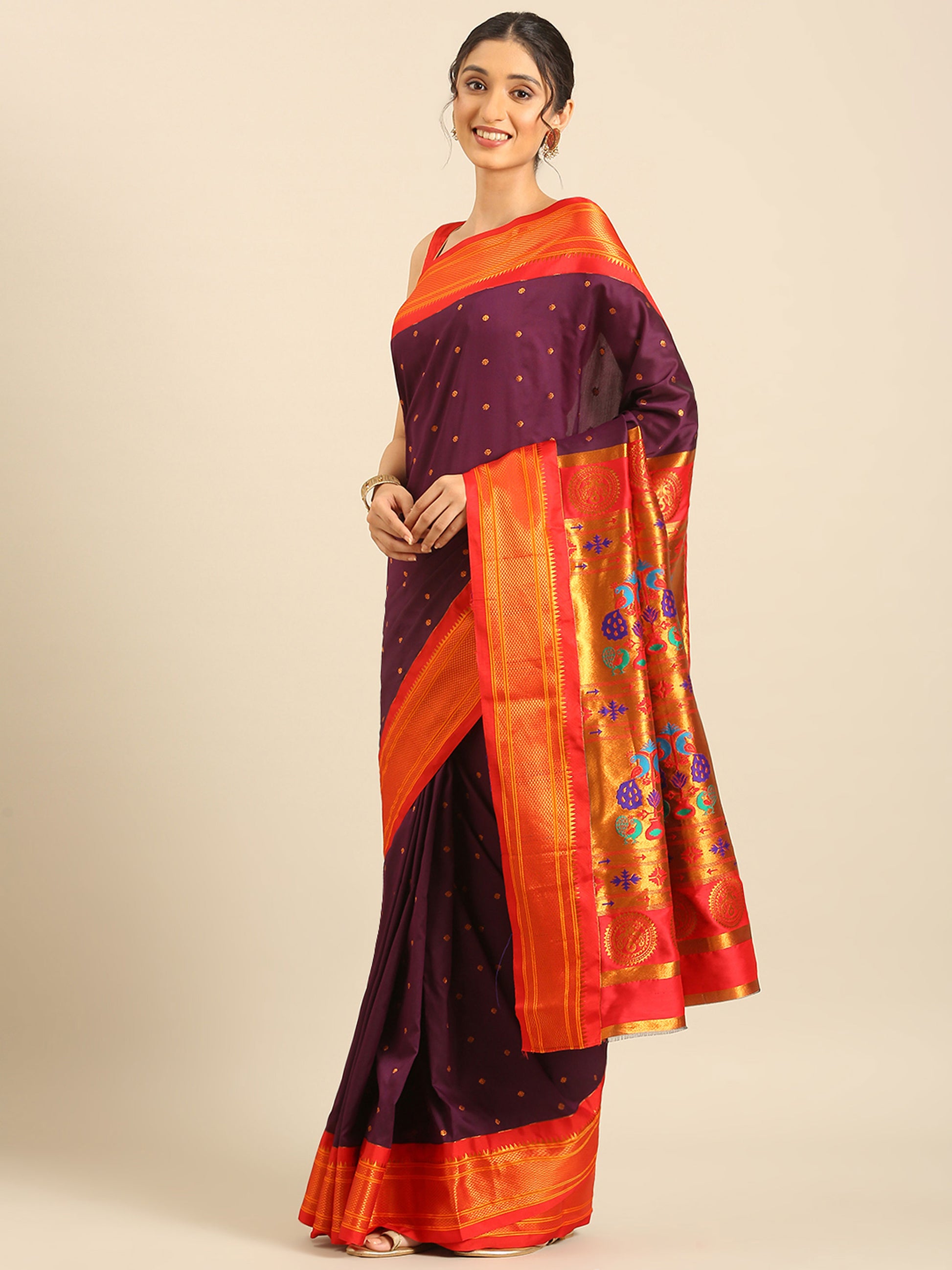 Explore The Collection Of Beautifully Designed Wine & Red Soft Silk Maharani Paithani Saree From Varkala Silk Sarees. Exude regal elegance with this stunning Maharani Paithani saree, perfect for weddings, parties, and festivals. This saree features a rich border with intricate checks design and is adorned with delicate flower copper zari butti across the body. The luxurious pallu showcases elaborate copper zari woven floral & peacock motifs, adding a majestic touch. Complete with an unstitched blouse piece, this saree seamlessly blends traditional artistry with sophisticated style.