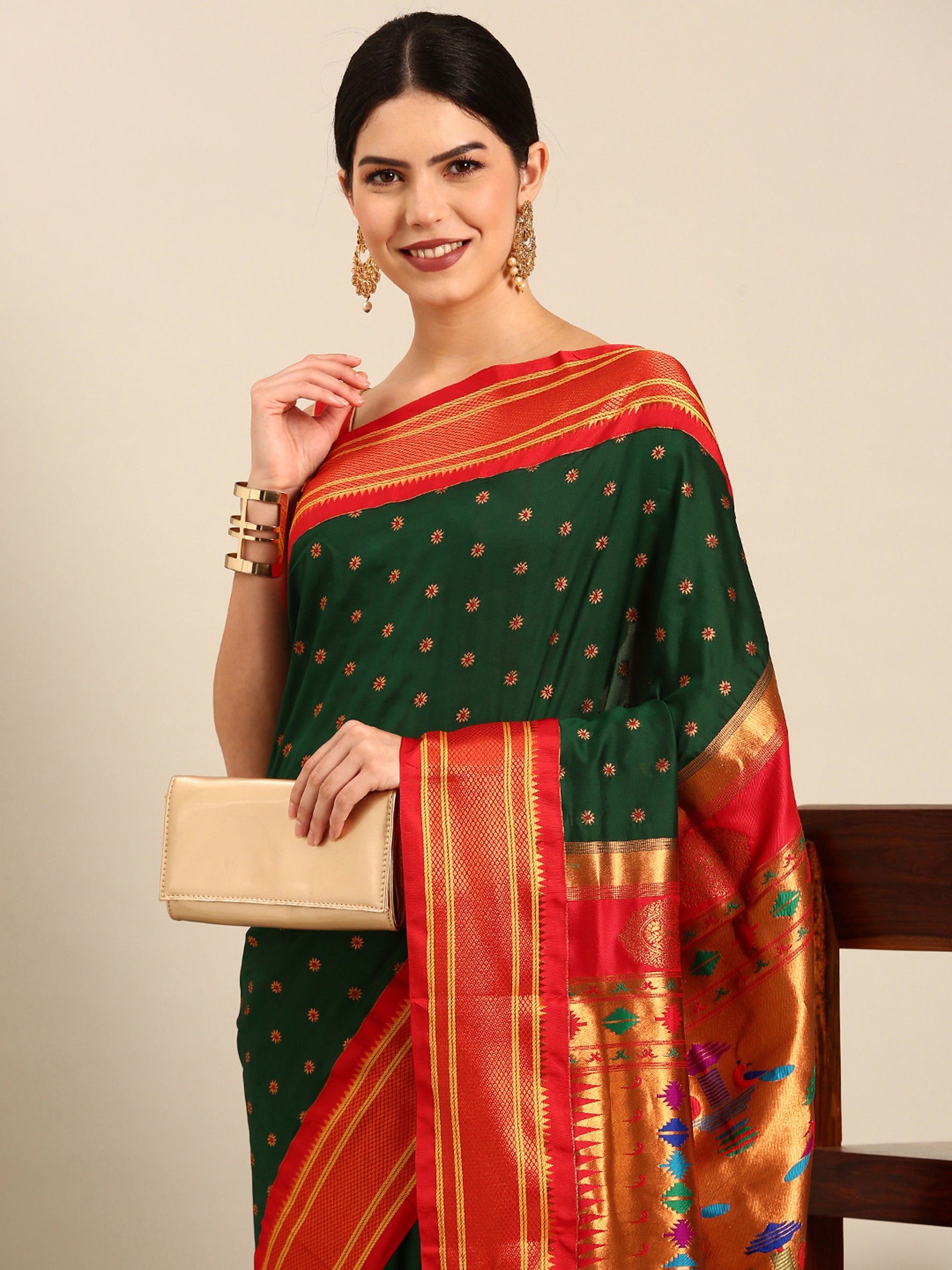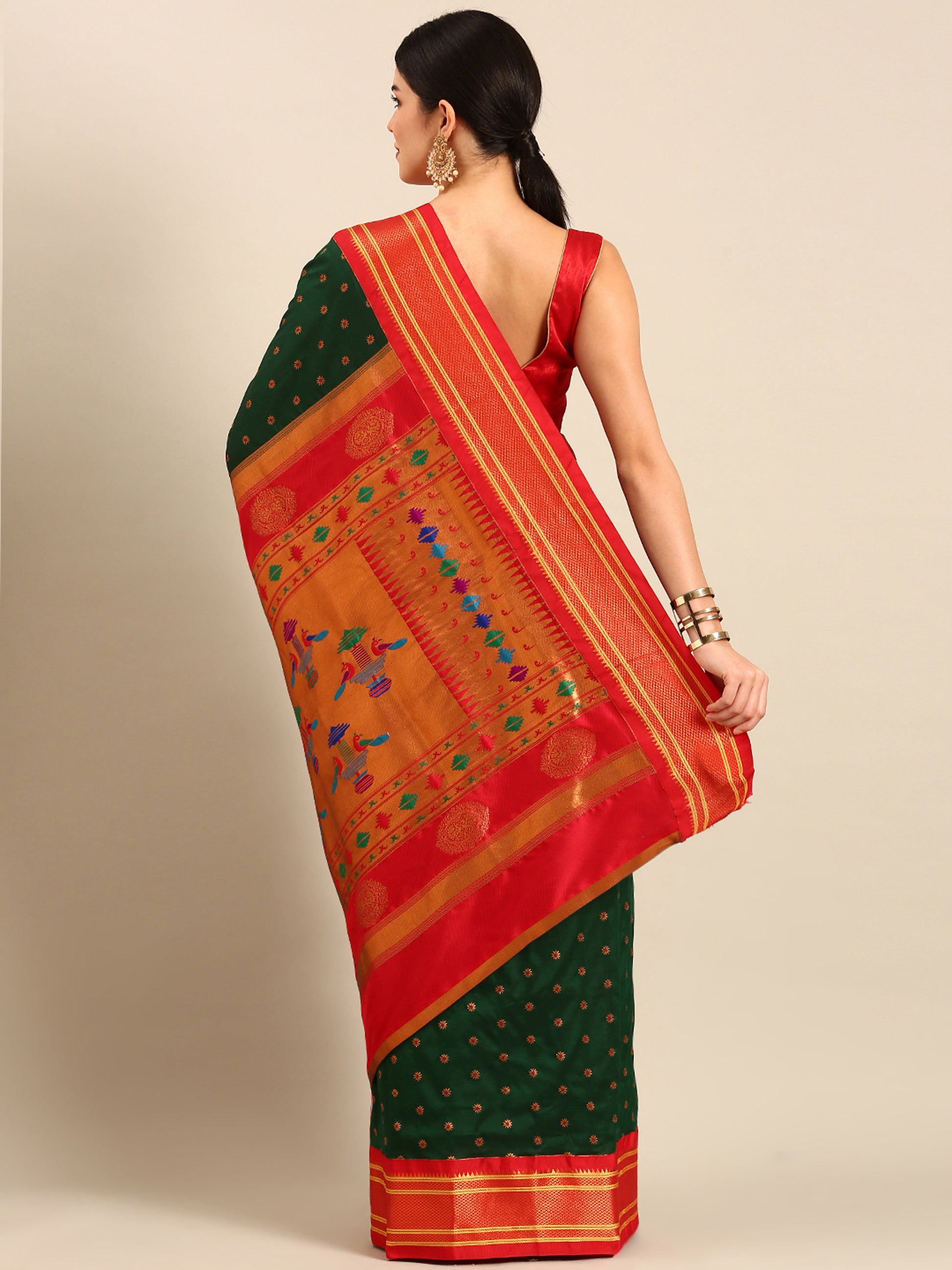 Raksha Bottle Green & Red Soft Silk Double Pallu Paithani Saree