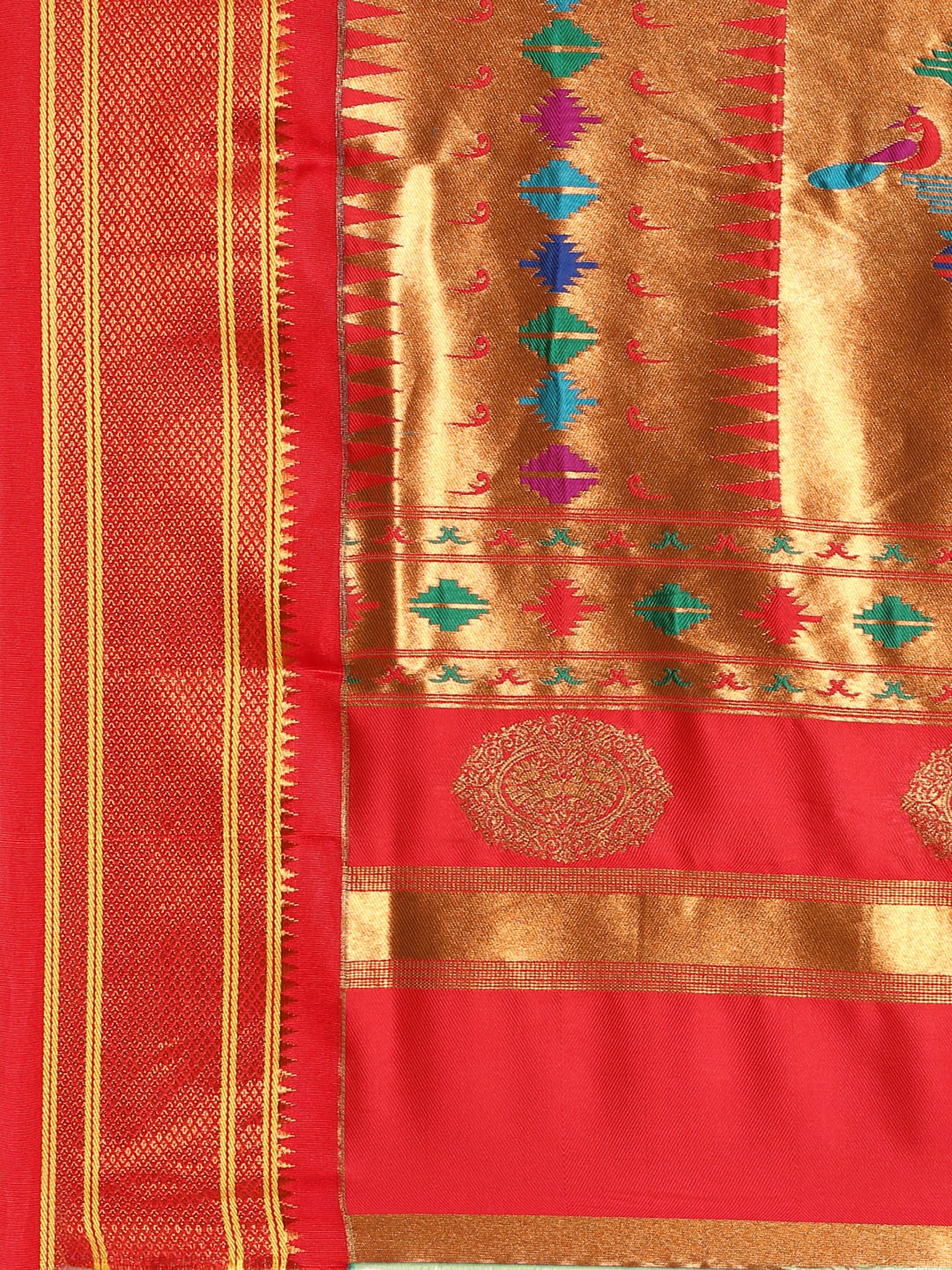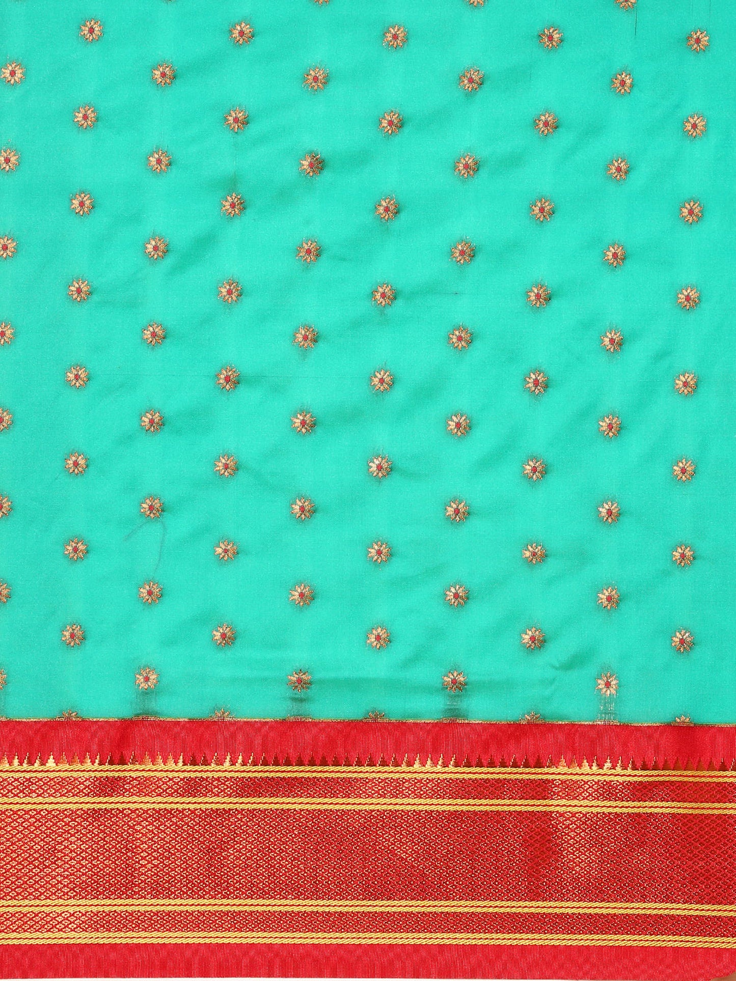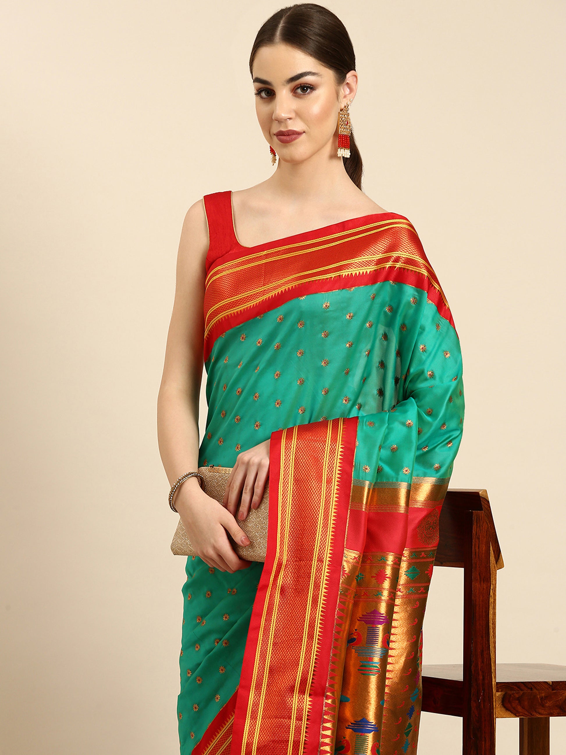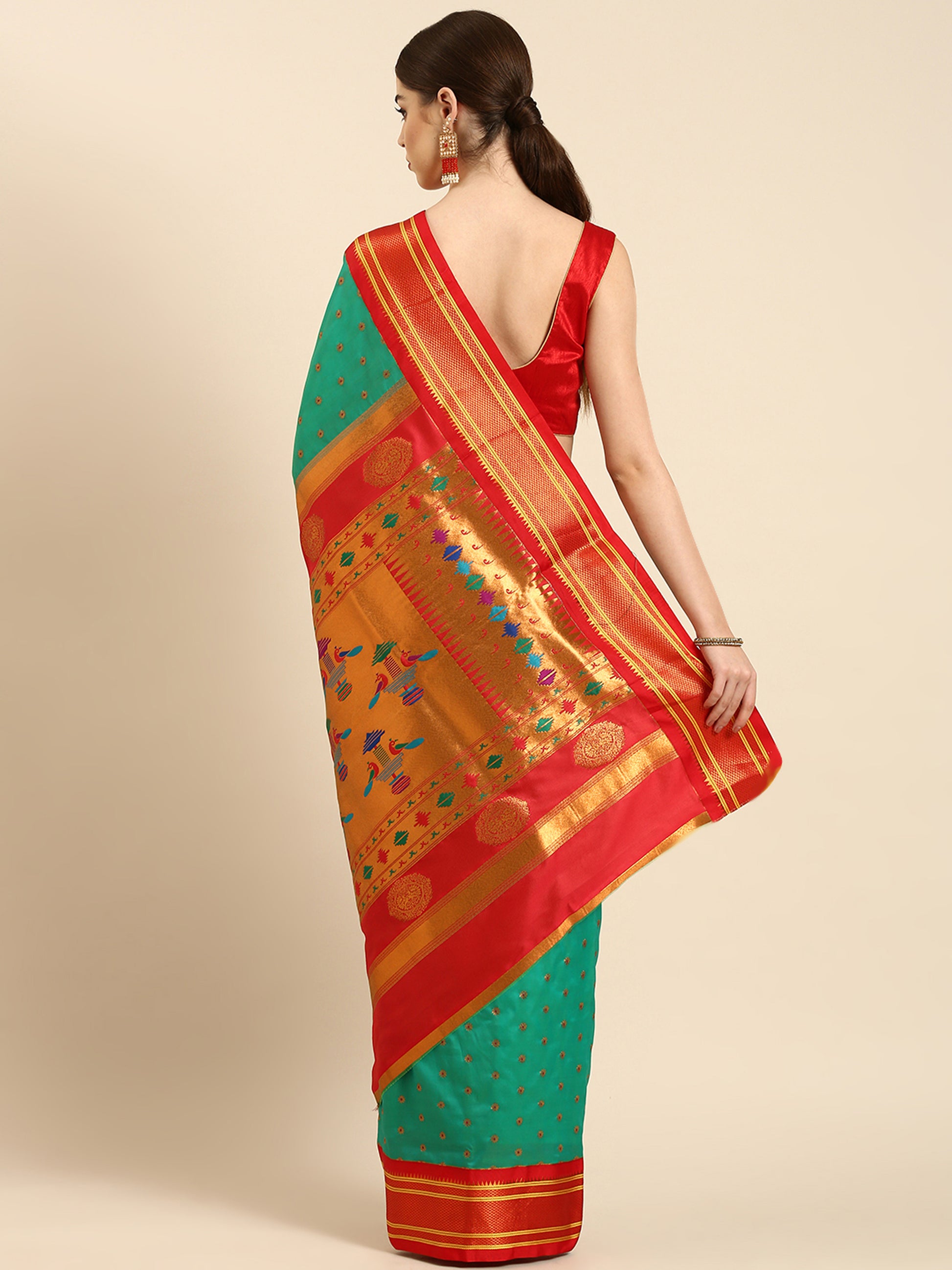 Raksha Sea Green & Red Soft Silk Double Pallu Paithani Saree