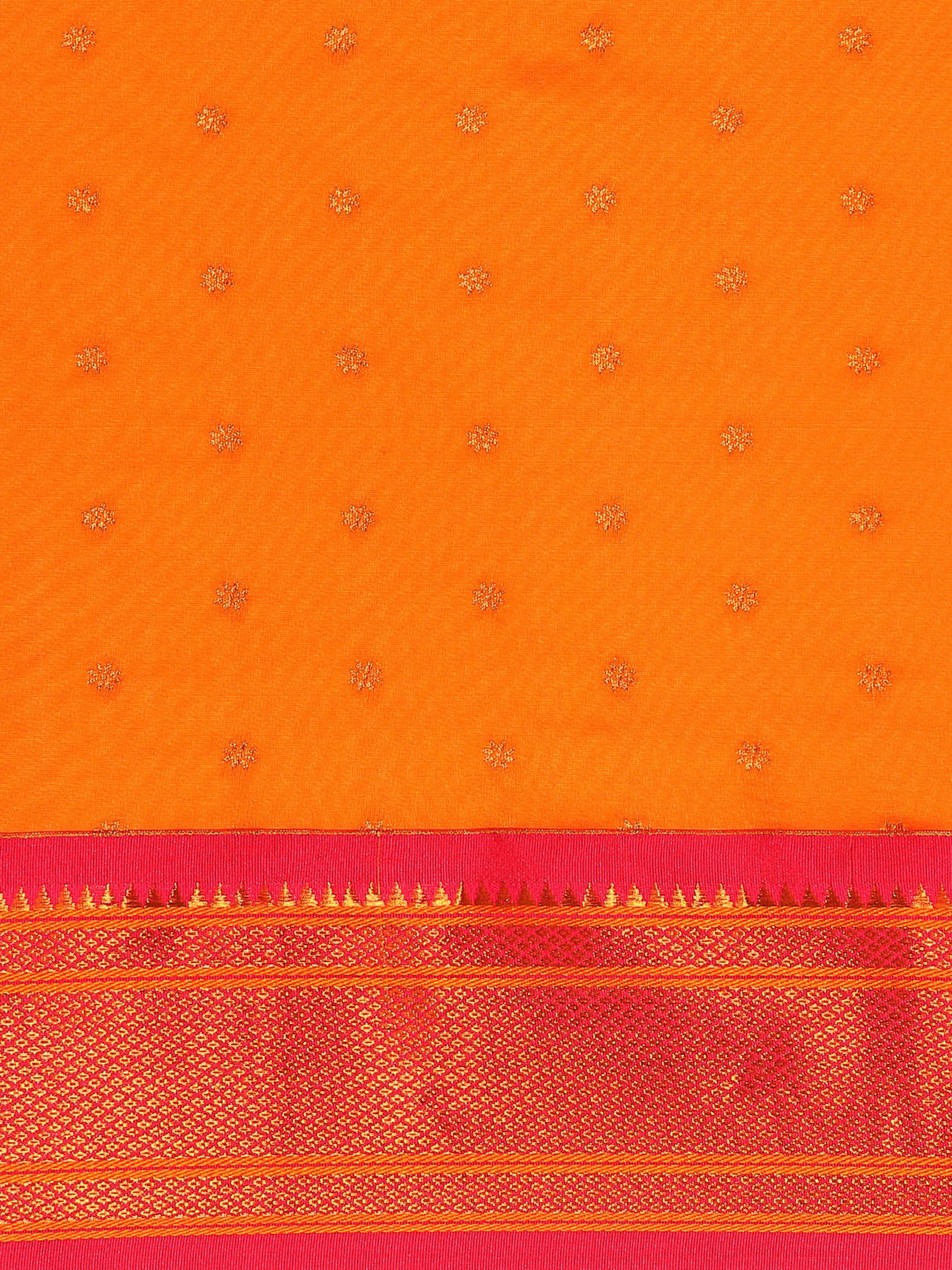 Explore The Collection Of Beautifully Designed Orange & Pink Soft Silk Double Pallu Paithani Saree From Varkala Silk Sarees. The Soft Silk Kadiyal Paithani Saree is a stunning choice for weddings, parties, and festivals. This exquisite saree features an intricate checks design on the border, accentuating its elegance. The body is adorned with delicate copper zari small star butti motifs, adding a touch of sophistication. The pallu showcases beautifully woven copper zari Muniya and Peacock motifs, enhancing its traditional appeal. Accompanied by an unstitched blouse piece, this saree effortlessly blends tradition with contemporary style, making it a perfect addition to your festive wardrobe