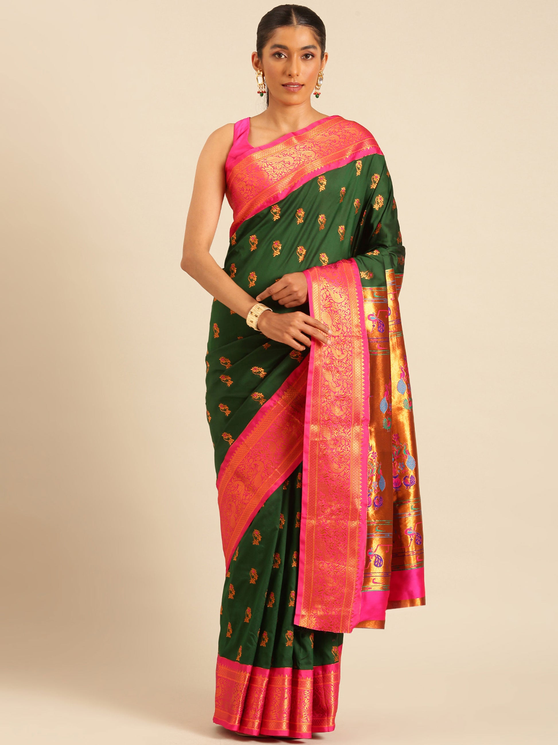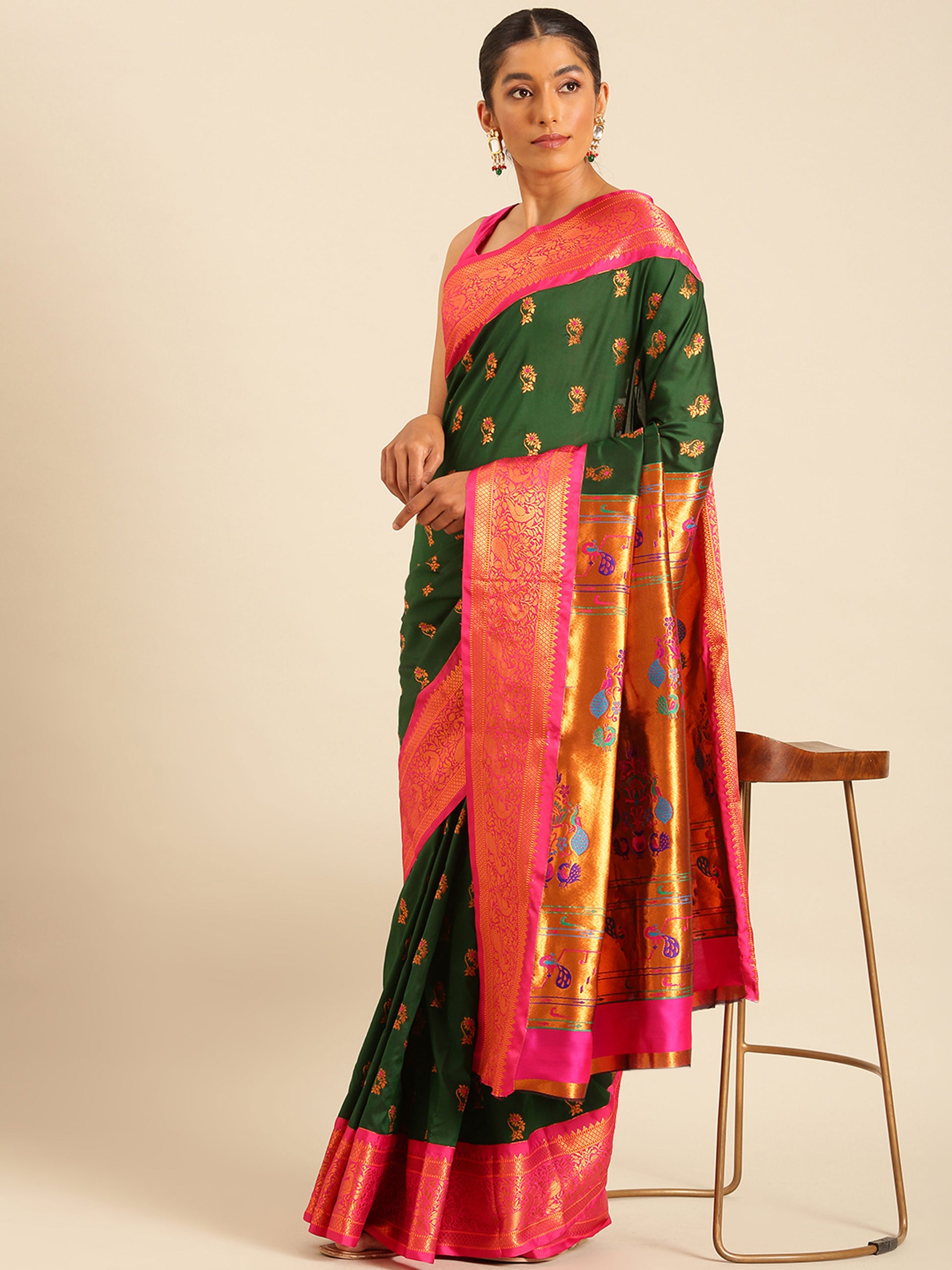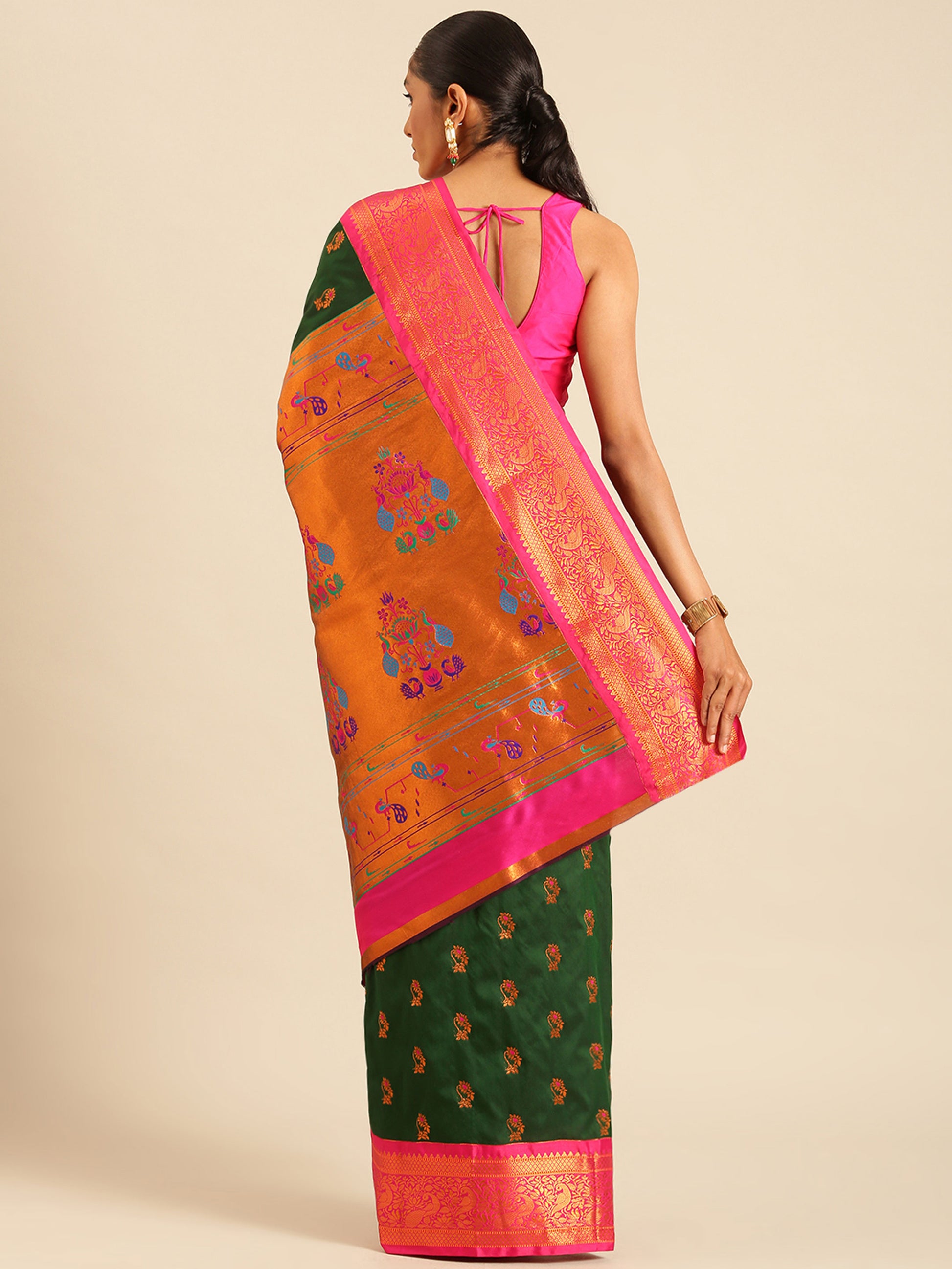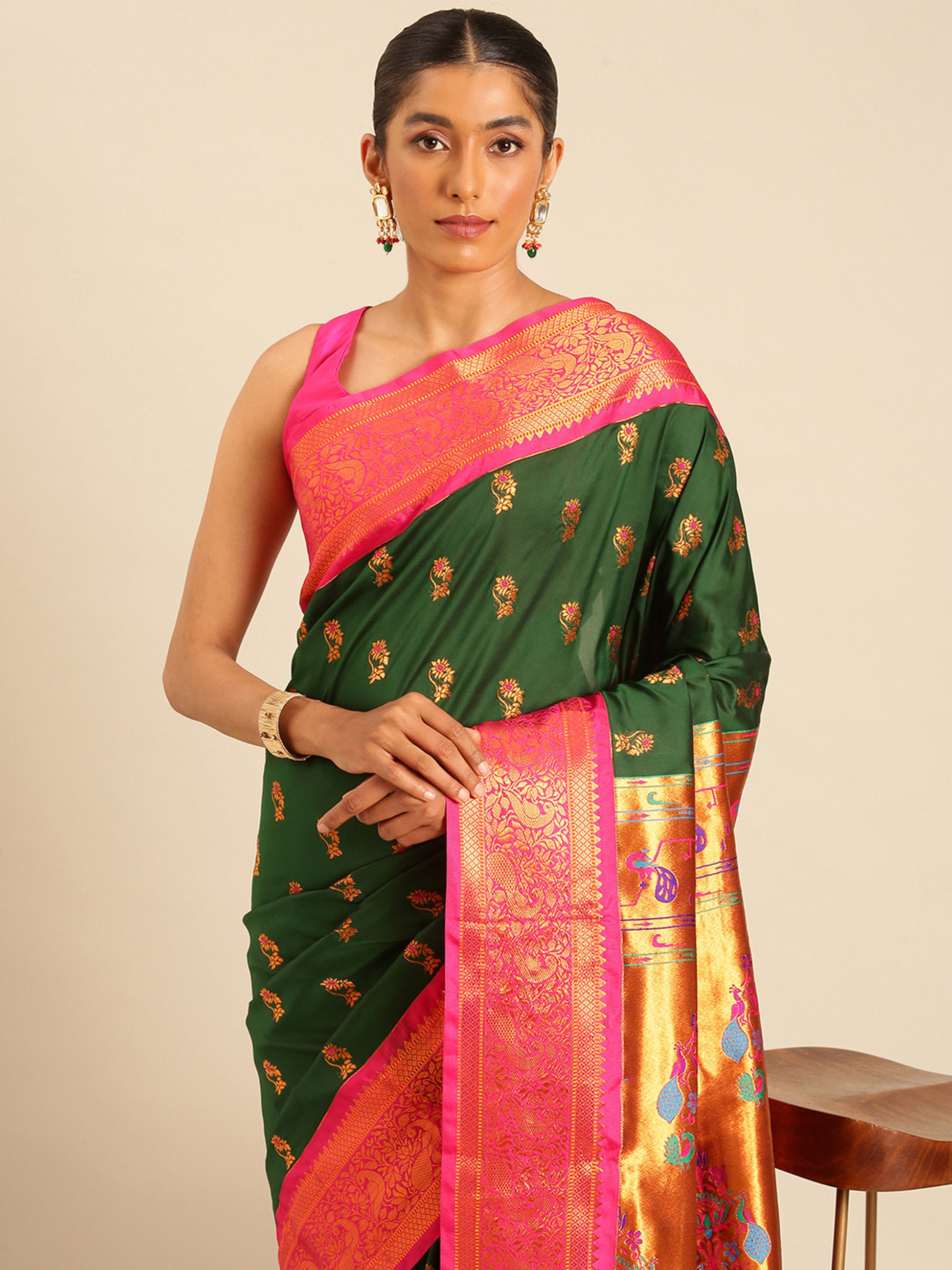 Sonkali Bottle Green & Pink Soft Silk Peshwai Nath Paithani Saree