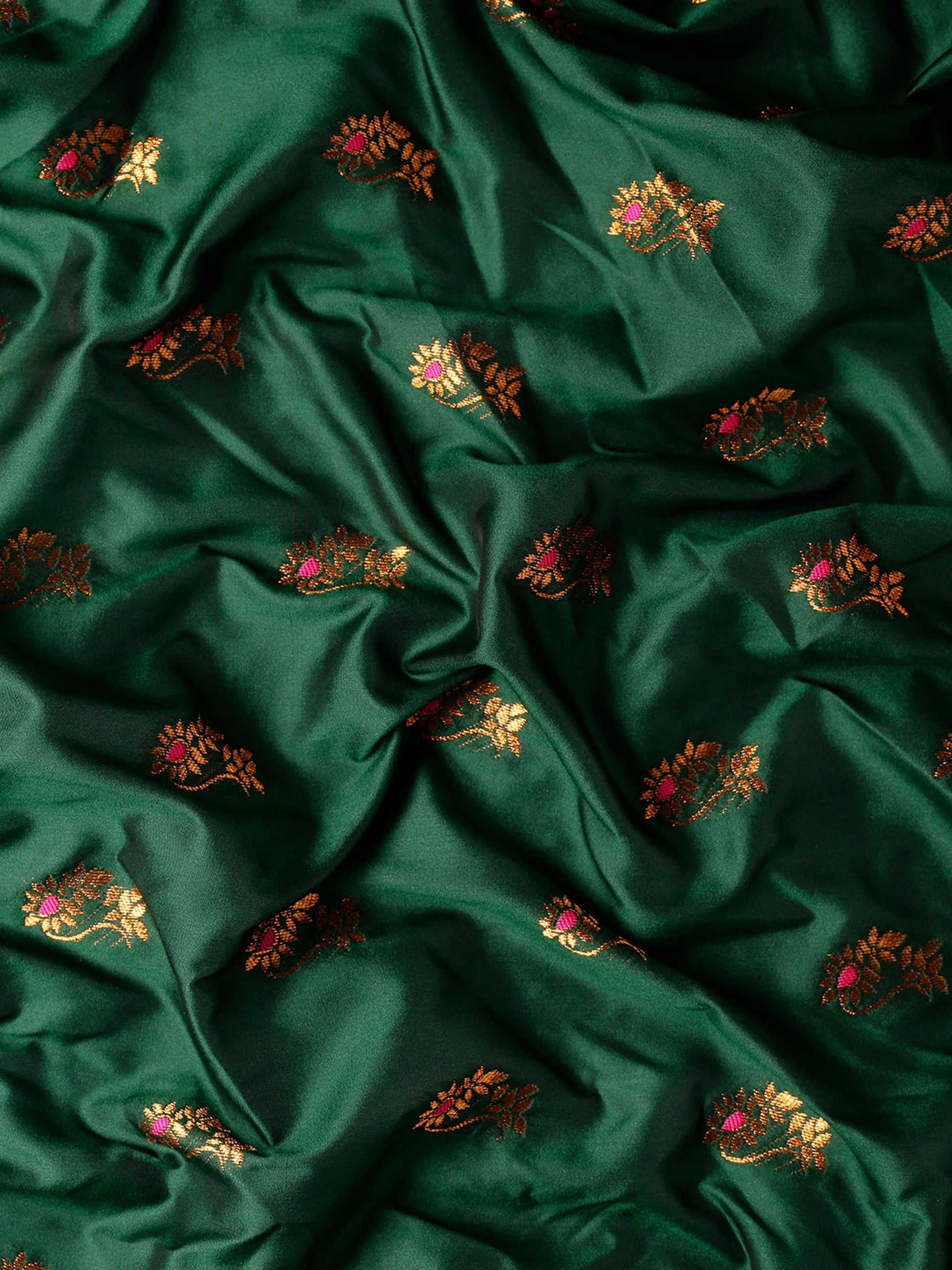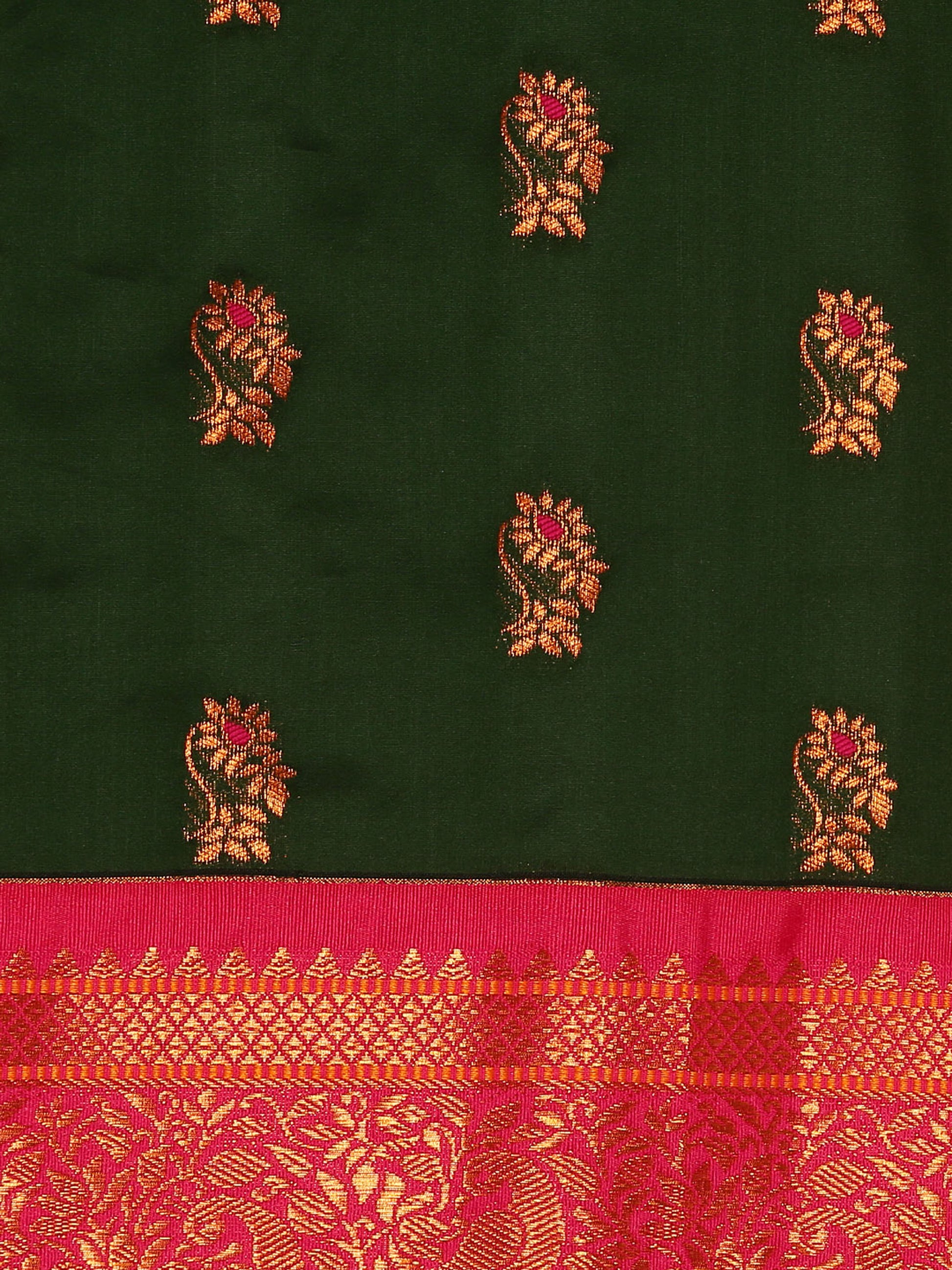 Explore The Collection Of Beautifully Designed Bottle Green & Pink Soft Silk Peshwai Nath Paithani Saree With Blouse Piece From Varkala Silk Sarees. Add A Touch Of Timeless Elegance To Your Wardrobe With The Peshwai Nath Paithani Saree, A Stunning Blend Of Tradition And Modern Grace. Made From Soft Silk Fabric With A Composition Of 70% Polyester And 30% Silk, This Saree Offers A Smooth Texture And Rich Drape. The 5.5-Meter Saree With A 0.8-Meter Blouse Piece Is Adorned With A Copper Zari Intricate Peacock Design Jacquard Border, Adding A Regal Charm. The Body Features Copper Zari Peshwai Nath Meena Butti, While The Pallu Showcases Copper Zari Woven Peacock Motifs, Symbolizing Prosperity And Beauty. Enhanced With Zari And Multicolor Resham Silk Thread Embellishments, This Woven Kadiyal Paithani Saree Is Perfect For Weddings, Parties, And Festive Occasions. It Comes With A Matching Blouse Piece To Complete Your Look. Dry Clean For The First Wash, Followed By Gentle Hand Wash. Elevate Your Ethnic Style With This Luxurious Paithani Masterpiece.