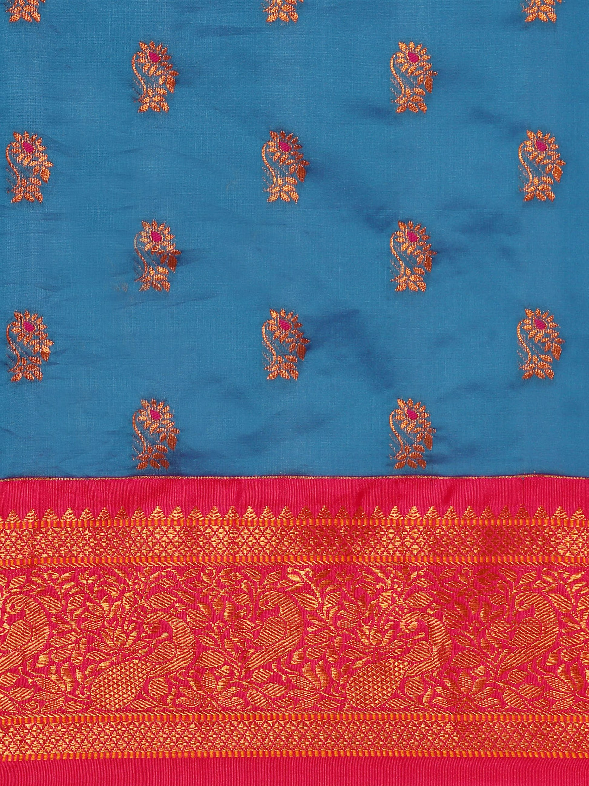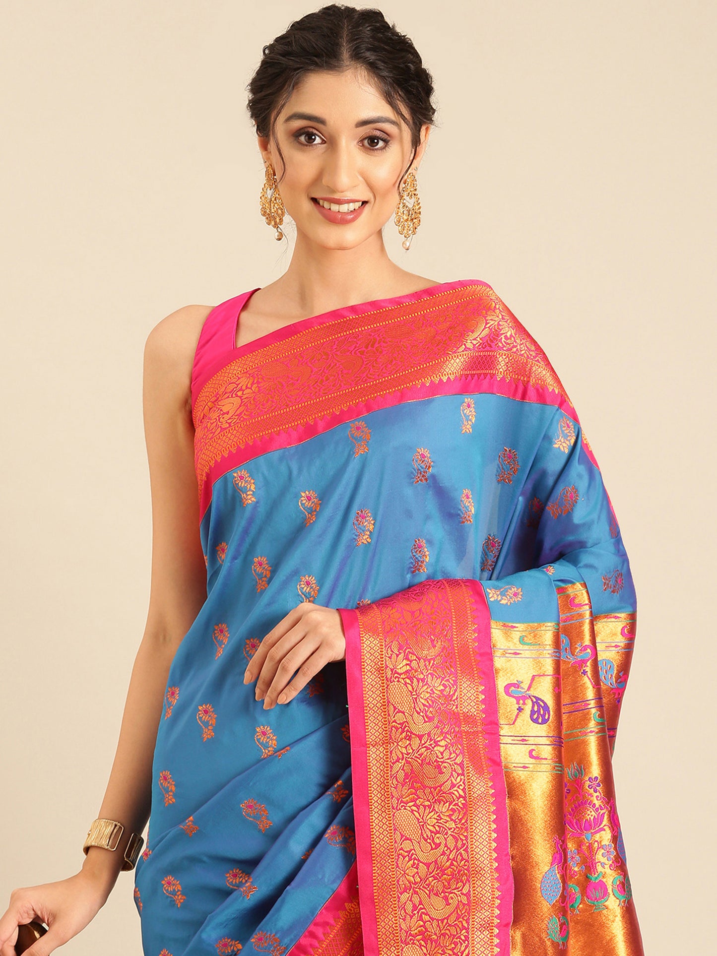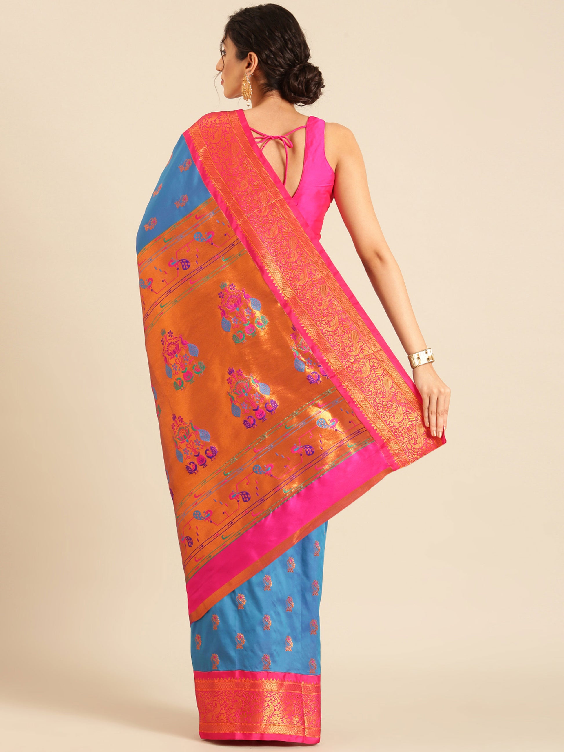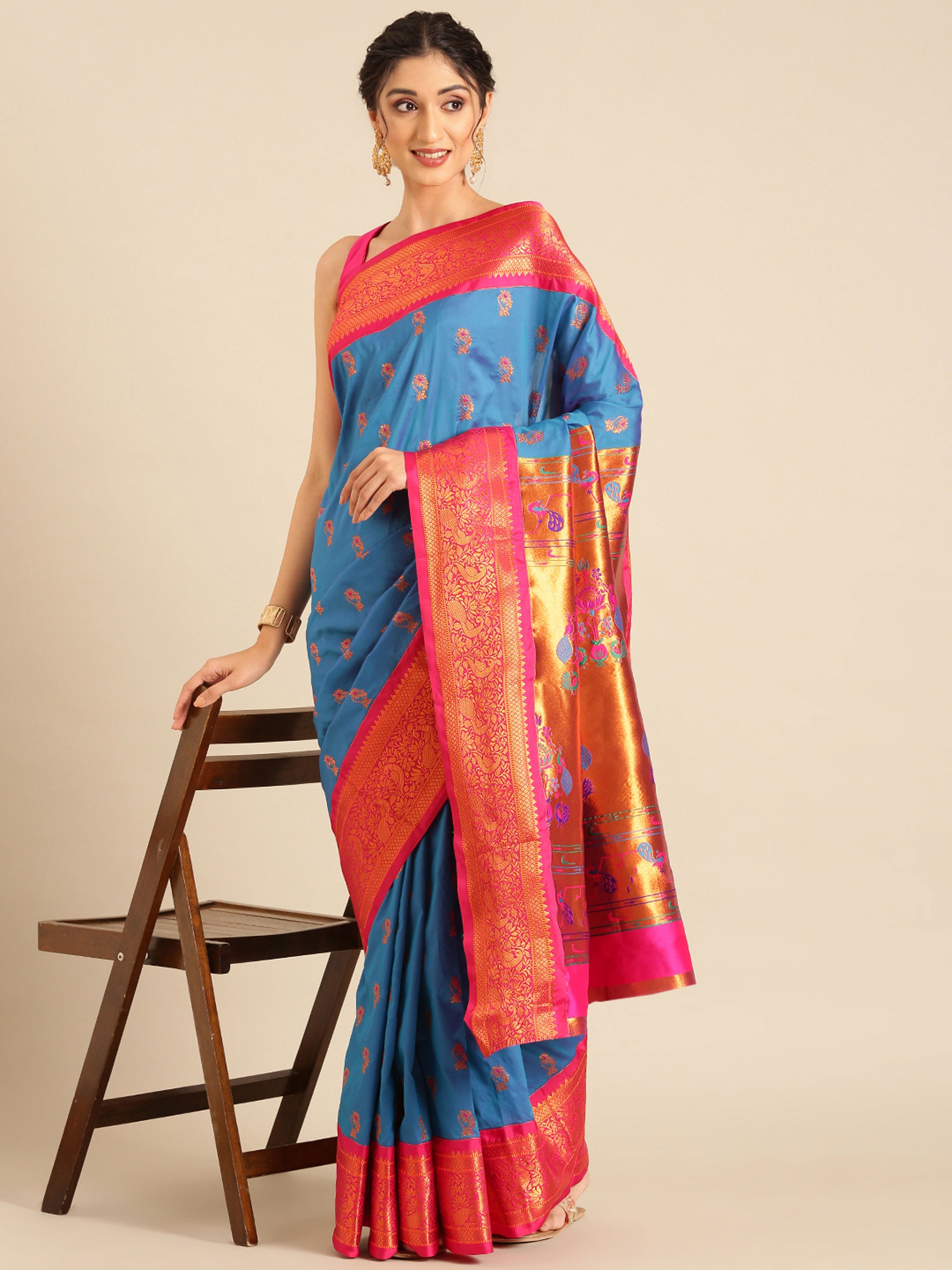 Explore The Collection Of Beautifully Designed Firozi & Pink Soft Silk Peshwai Nath Paithani Saree With Blouse Piece From Varkala Silk Sarees. Add A Touch Of Timeless Elegance To Your Wardrobe With The Peshwai Nath Paithani Saree, A Stunning Blend Of Tradition And Modern Grace. Made From Soft Silk Fabric With A Composition Of 70% Polyester And 30% Silk, This Saree Offers A Smooth Texture And Rich Drape. The 5.5-Meter Saree With A 0.8-Meter Blouse Piece Is Adorned With A Copper Zari Intricate Peacock Design Jacquard Border, Adding A Regal Charm. The Body Features Copper Zari Peshwai Nath Meena Butti, While The Pallu Showcases Copper Zari Woven Peacock Motifs, Symbolizing Prosperity And Beauty. Enhanced With Zari And Multicolor Resham Silk Thread Embellishments, This Woven Kadiyal Paithani Saree Is Perfect For Weddings, Parties, And Festive Occasions. It Comes With A Matching Blouse Piece To Complete Your Look. Dry Clean For The First Wash, Followed By Gentle Hand Wash. Elevate Your Ethnic Style With This Luxurious Paithani Masterpiece.