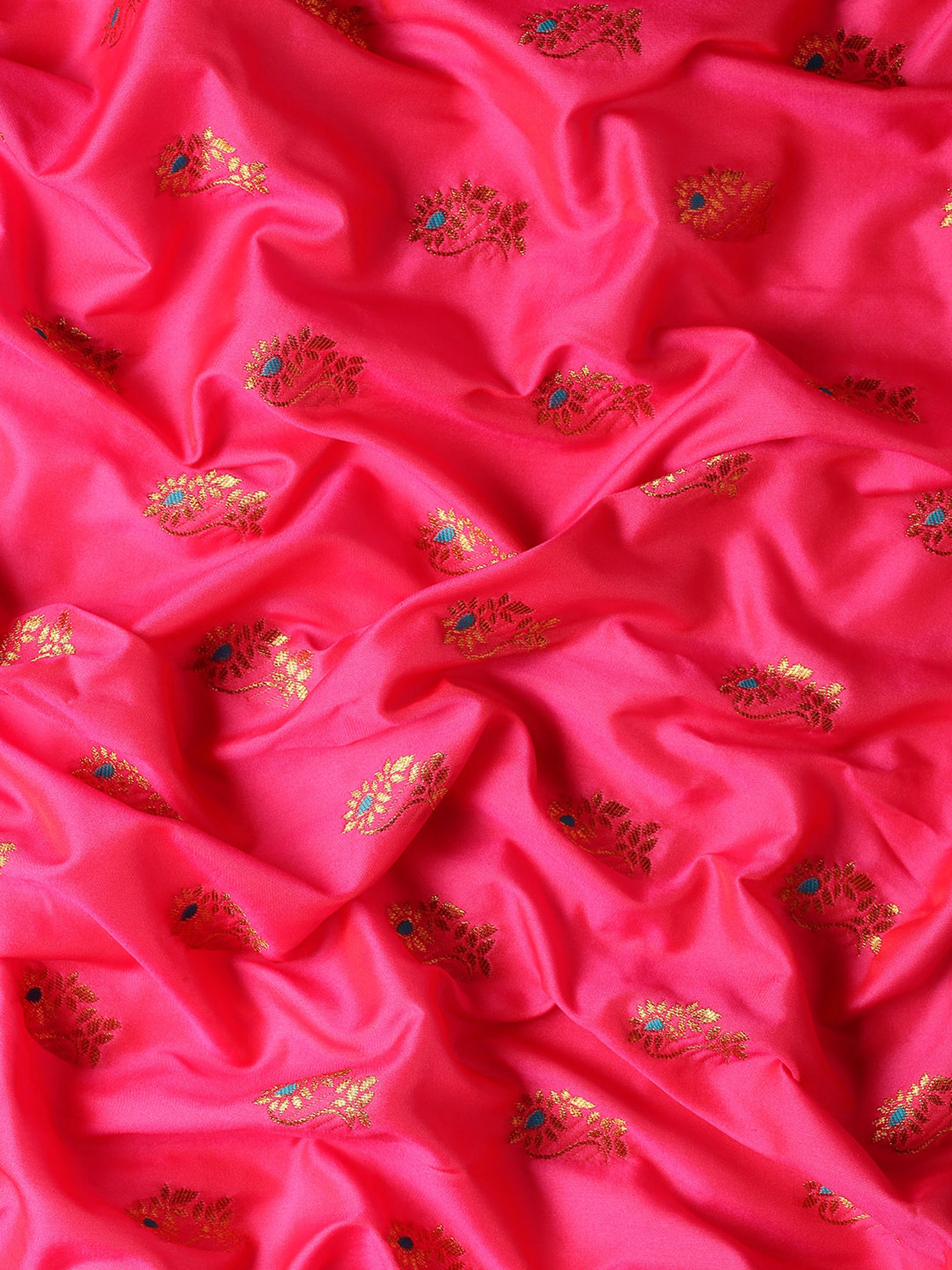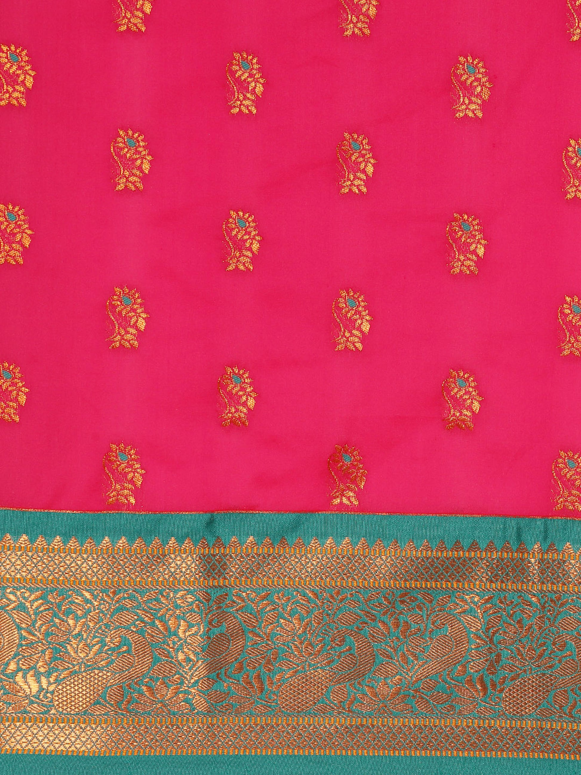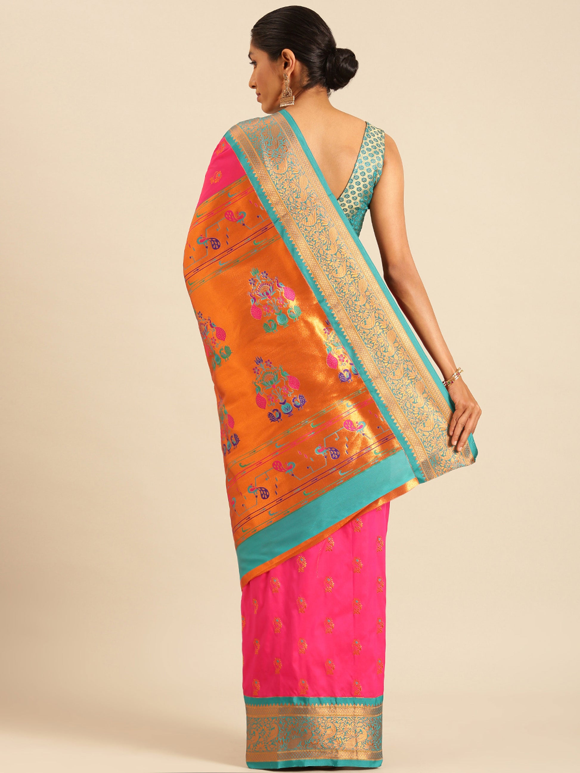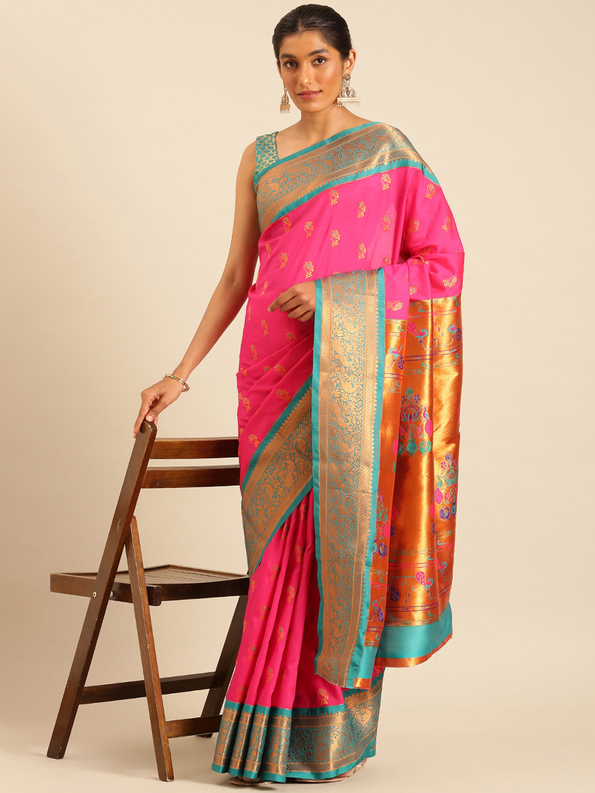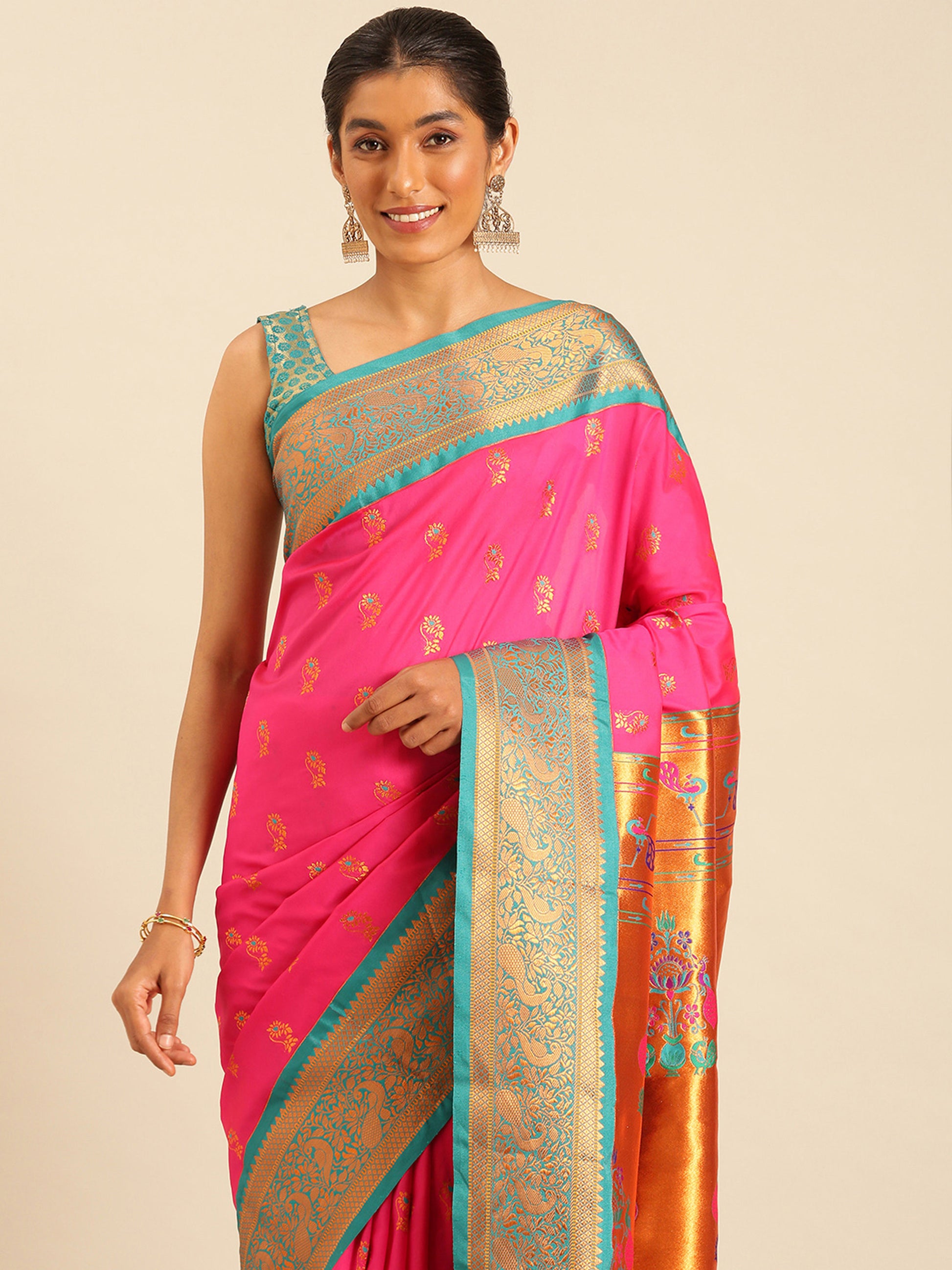 Explore The Collection Of Beautifully Designed Hot Pink & Rama Soft Silk Peshwai Nath Paithani Saree With Blouse Piece From Varkala Silk Sarees. Add A Touch Of Timeless Elegance To Your Wardrobe With The Peshwai Nath Paithani Saree, A Stunning Blend Of Tradition And Modern Grace. Made From Soft Silk Fabric With A Composition Of 70% Polyester And 30% Silk, This Saree Offers A Smooth Texture And Rich Drape. The 5.5-Meter Saree With A 0.8-Meter Blouse Piece Is Adorned With A Copper Zari Intricate Peacock Design Jacquard Border, Adding A Regal Charm. The Body Features Copper Zari Peshwai Nath Meena Butti, While The Pallu Showcases Copper Zari Woven Peacock Motifs, Symbolizing Prosperity And Beauty. Enhanced With Zari And Multicolor Resham Silk Thread Embellishments, This Woven Kadiyal Paithani Saree Is Perfect For Weddings, Parties, And Festive Occasions. It Comes With A Matching Blouse Piece To Complete Your Look. Dry Clean For The First Wash, Followed By Gentle Hand Wash. Elevate Your Ethnic Style With This Luxurious Paithani Masterpiece.