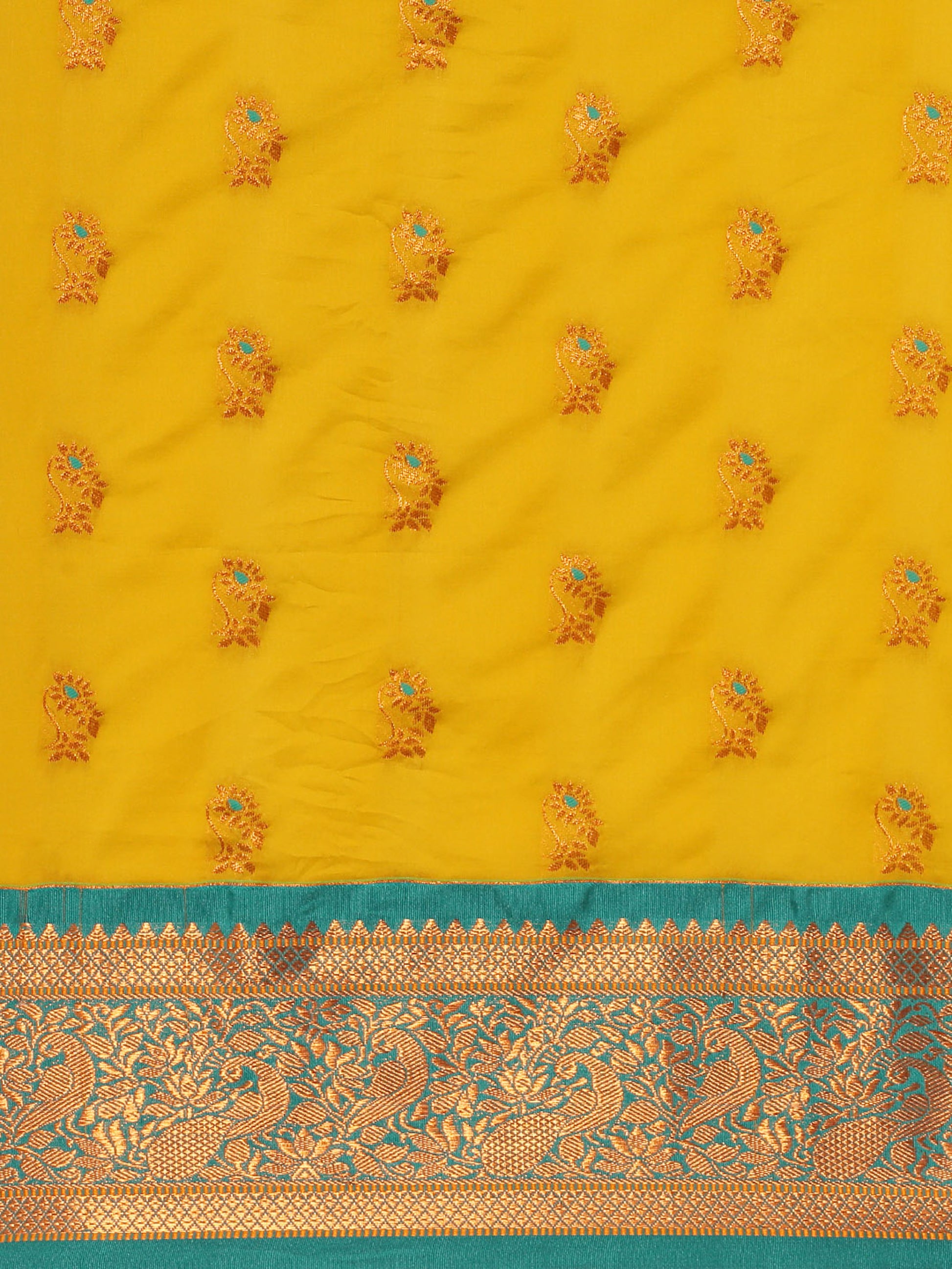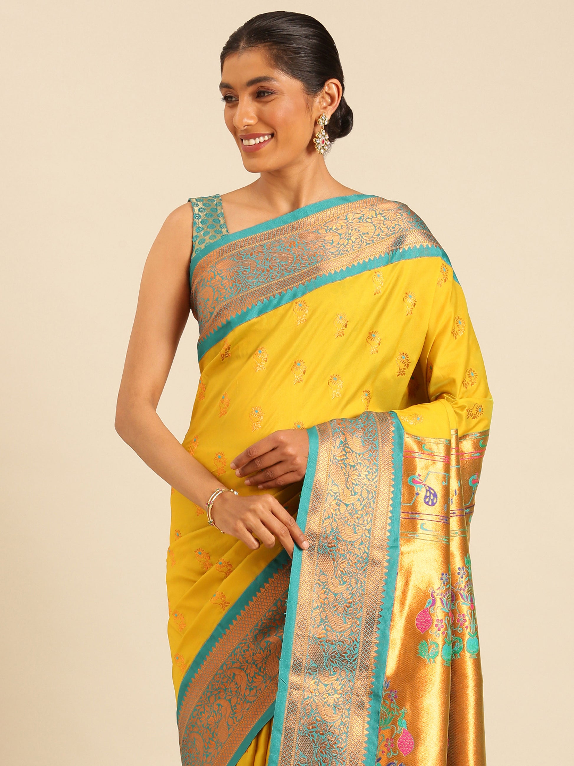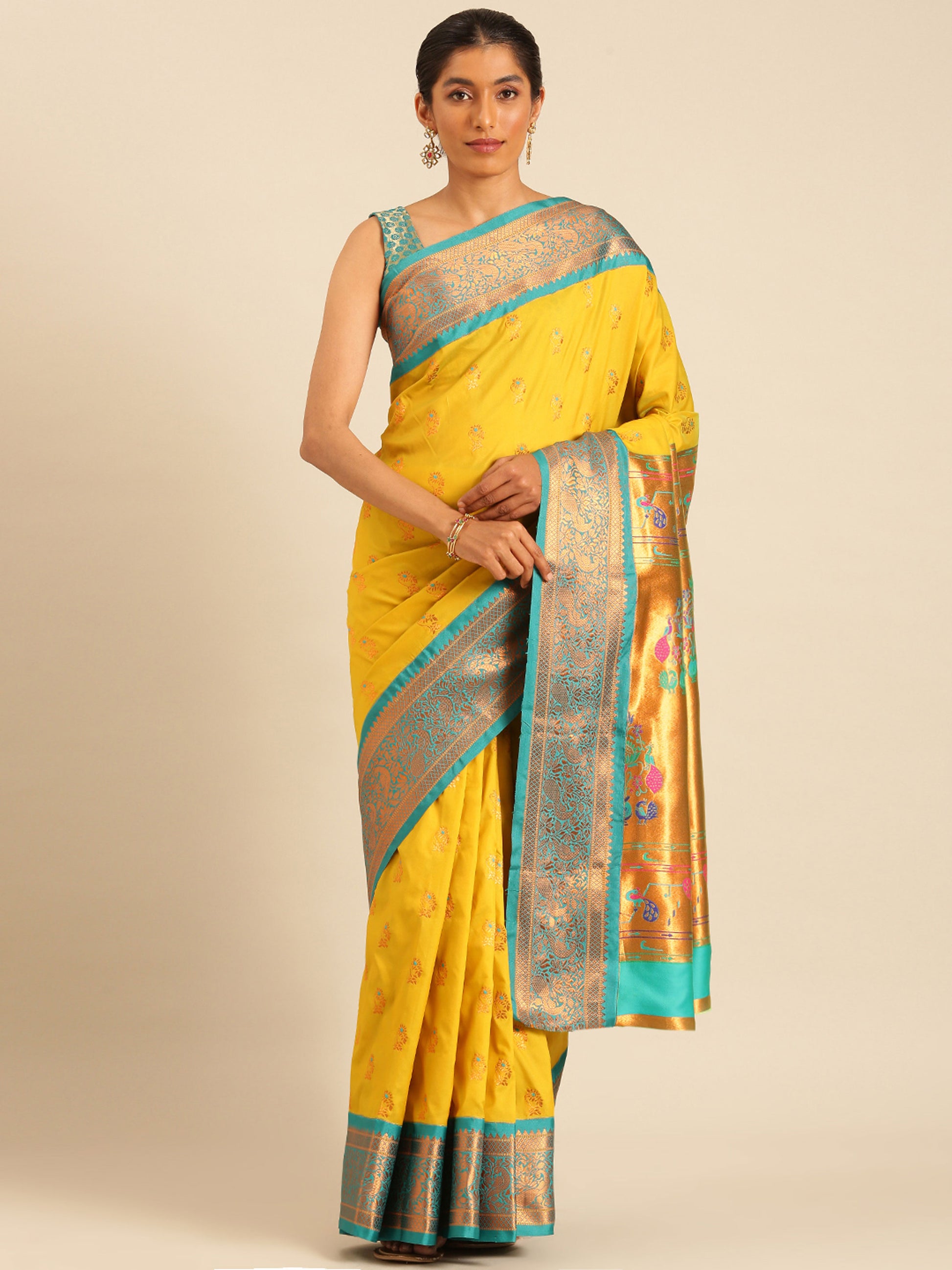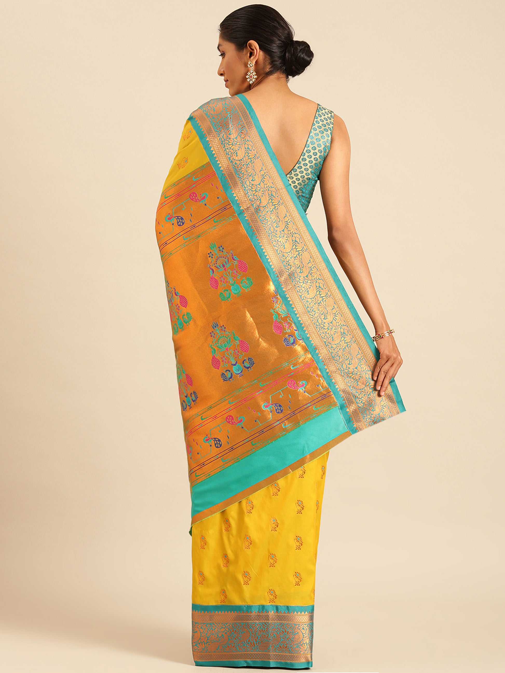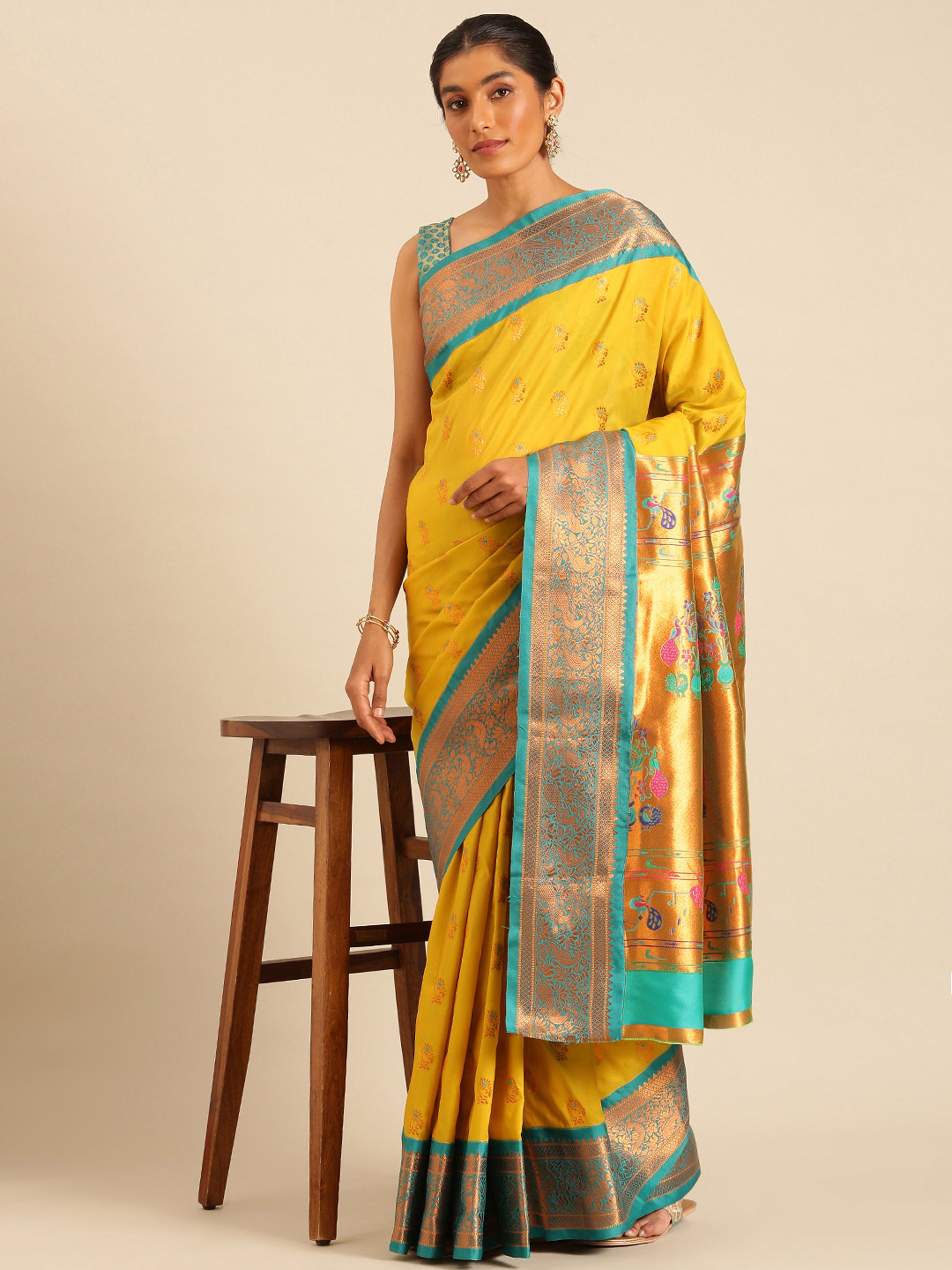 Explore The Collection Of Beautifully Designed Mustard & Rama Soft Silk Peshwai Nath Paithani Saree With Blouse Piece From Varkala Silk Sarees. Add A Touch Of Timeless Elegance To Your Wardrobe With The Peshwai Nath Paithani Saree, A Stunning Blend Of Tradition And Modern Grace. Made From Soft Silk Fabric With A Composition Of 70% Polyester And 30% Silk, This Saree Offers A Smooth Texture And Rich Drape. The 5.5-Meter Saree With A 0.8-Meter Blouse Piece Is Adorned With A Copper Zari Intricate Peacock Design Jacquard Border, Adding A Regal Charm. The Body Features Copper Zari Peshwai Nath Meena Butti, While The Pallu Showcases Copper Zari Woven Peacock Motifs, Symbolizing Prosperity And Beauty. Enhanced With Zari And Multicolor Resham Silk Thread Embellishments, This Woven Kadiyal Paithani Saree Is Perfect For Weddings, Parties, And Festive Occasions. It Comes With A Matching Blouse Piece To Complete Your Look. Dry Clean For The First Wash, Followed By Gentle Hand Wash. Elevate Your Ethnic Style With This Luxurious Paithani Masterpiece.