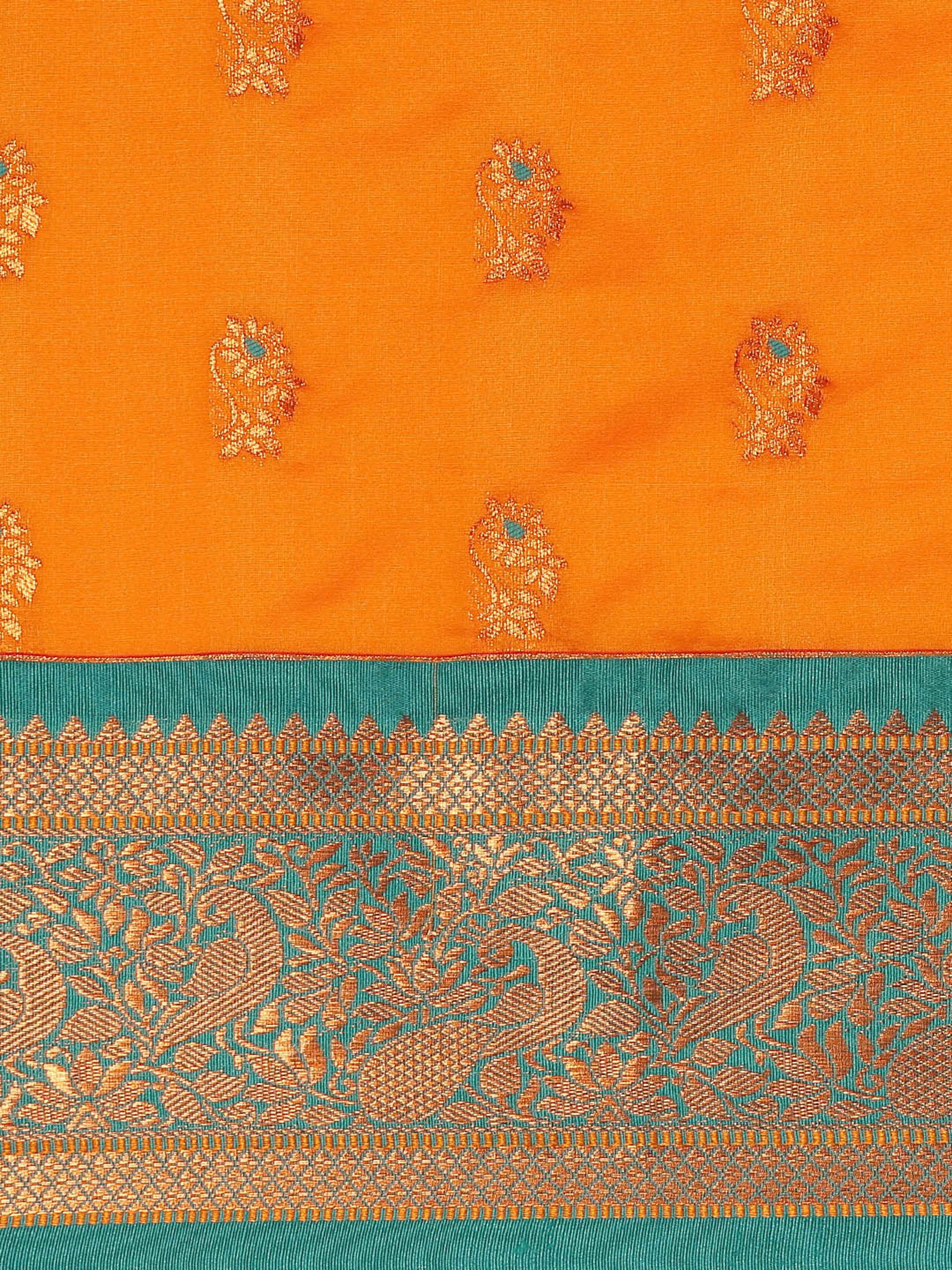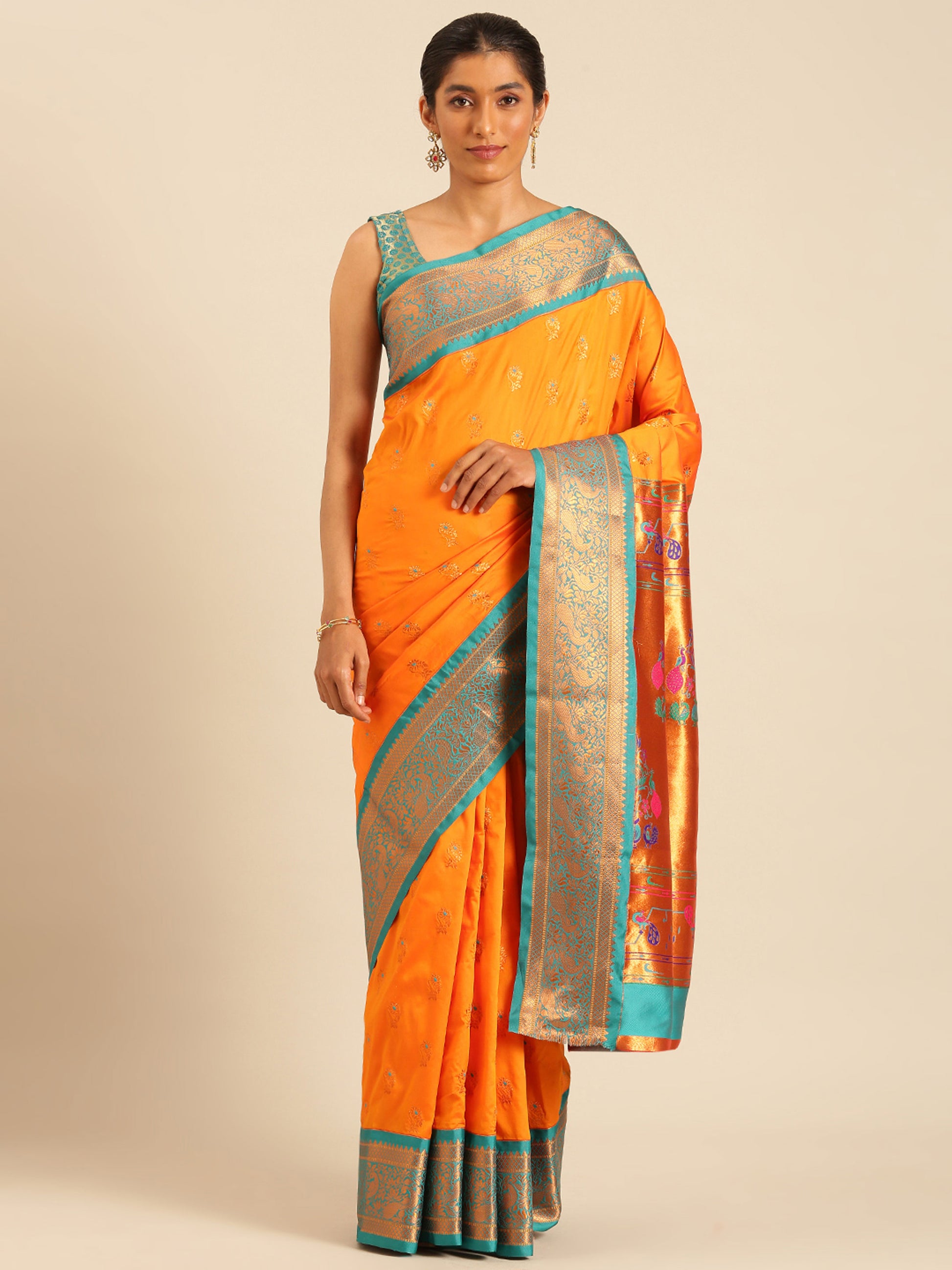 Explore The Collection Of Beautifully Designed Orange & Rama Soft Silk Peshwai Nath Paithani Saree With Blouse Piece From Varkala Silk Sarees. Add A Touch Of Timeless Elegance To Your Wardrobe With The Peshwai Nath Paithani Saree, A Stunning Blend Of Tradition And Modern Grace. Made From Soft Silk Fabric With A Composition Of 70% Polyester And 30% Silk, This Saree Offers A Smooth Texture And Rich Drape. The 5.5-Meter Saree With A 0.8-Meter Blouse Piece Is Adorned With A Copper Zari Intricate Peacock Design Jacquard Border, Adding A Regal Charm. The Body Features Copper Zari Peshwai Nath Meena Butti, While The Pallu Showcases Copper Zari Woven Peacock Motifs, Symbolizing Prosperity And Beauty. Enhanced With Zari And Multicolor Resham Silk Thread Embellishments, This Woven Kadiyal Paithani Saree Is Perfect For Weddings, Parties, And Festive Occasions. It Comes With A Matching Blouse Piece To Complete Your Look. Dry Clean For The First Wash, Followed By Gentle Hand Wash. Elevate Your Ethnic Style With This Luxurious Paithani Masterpiece.