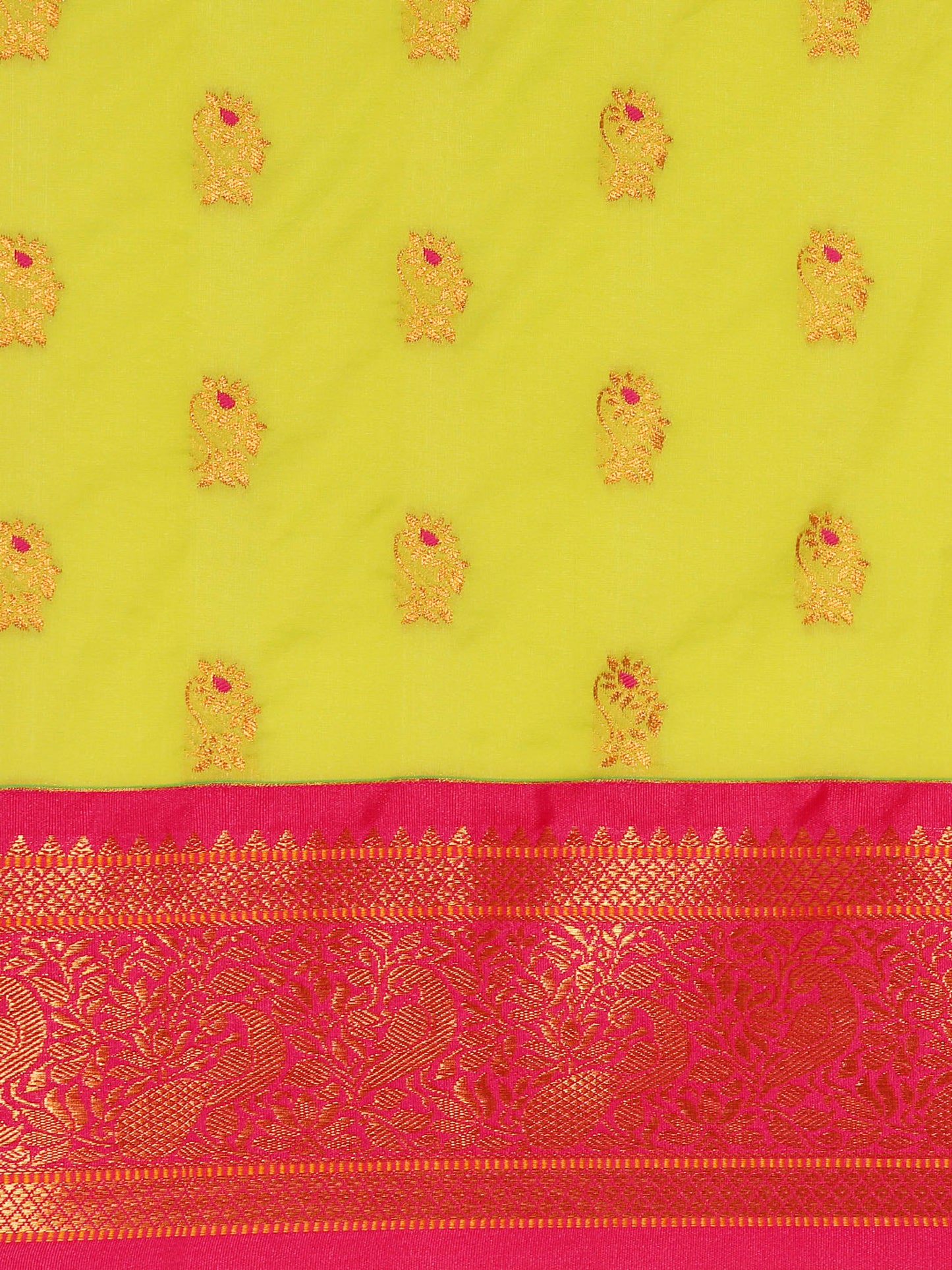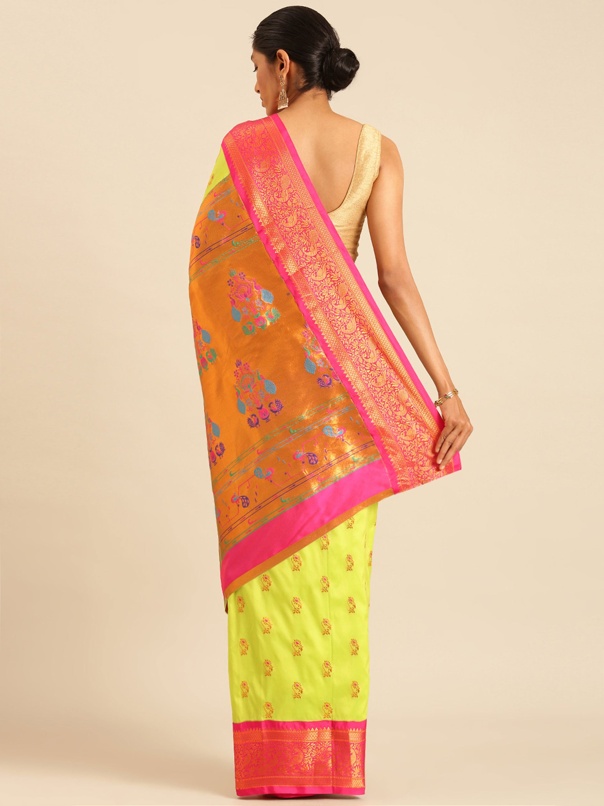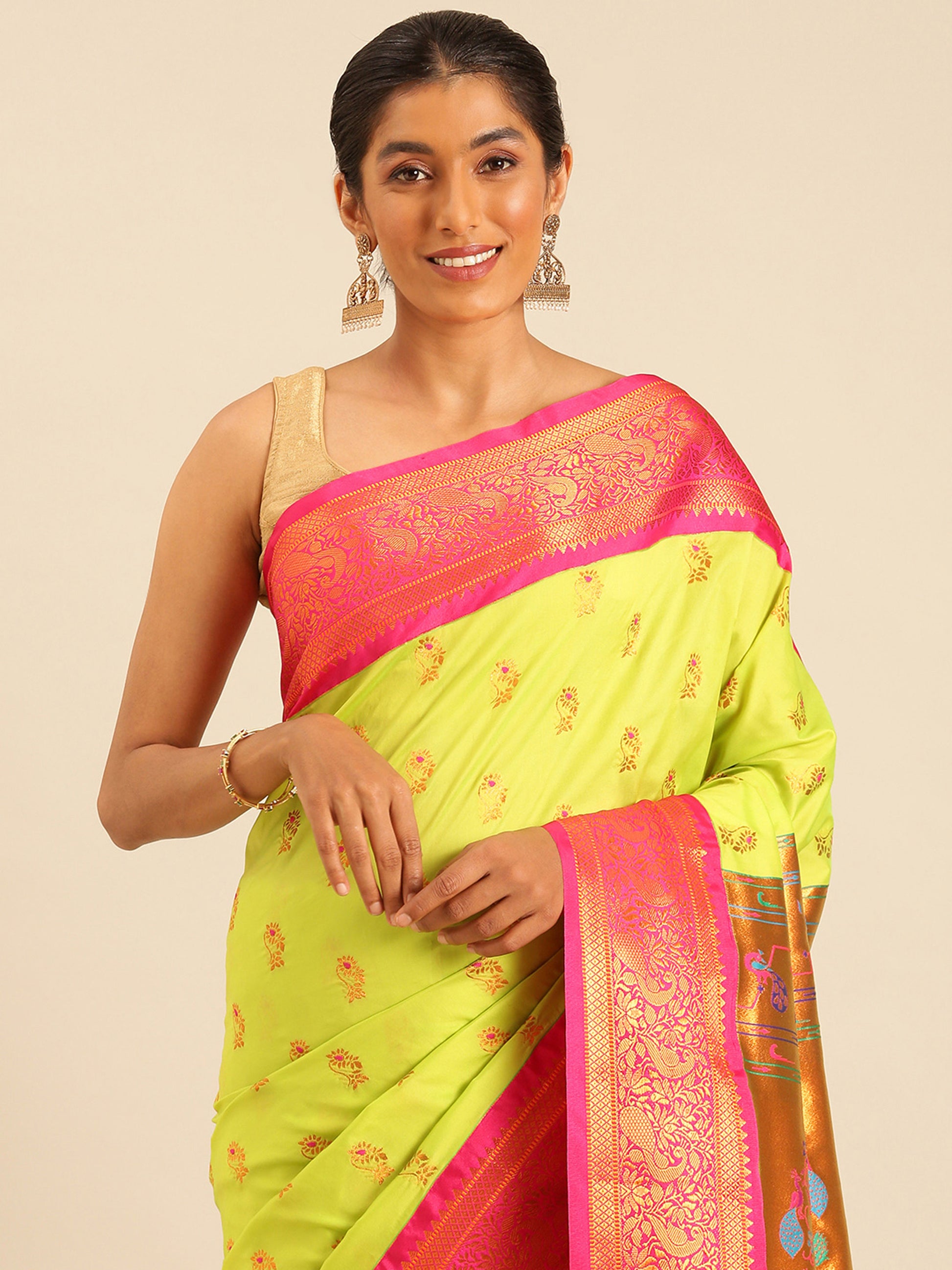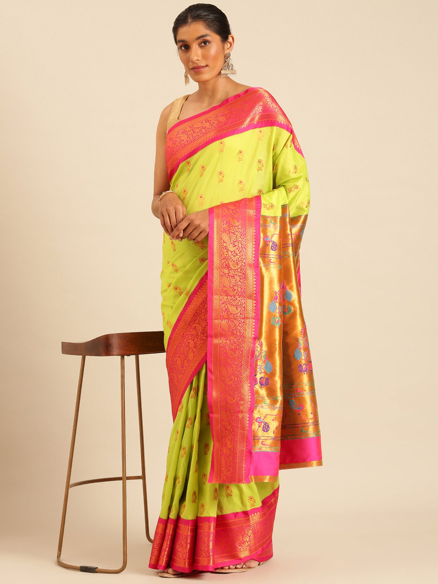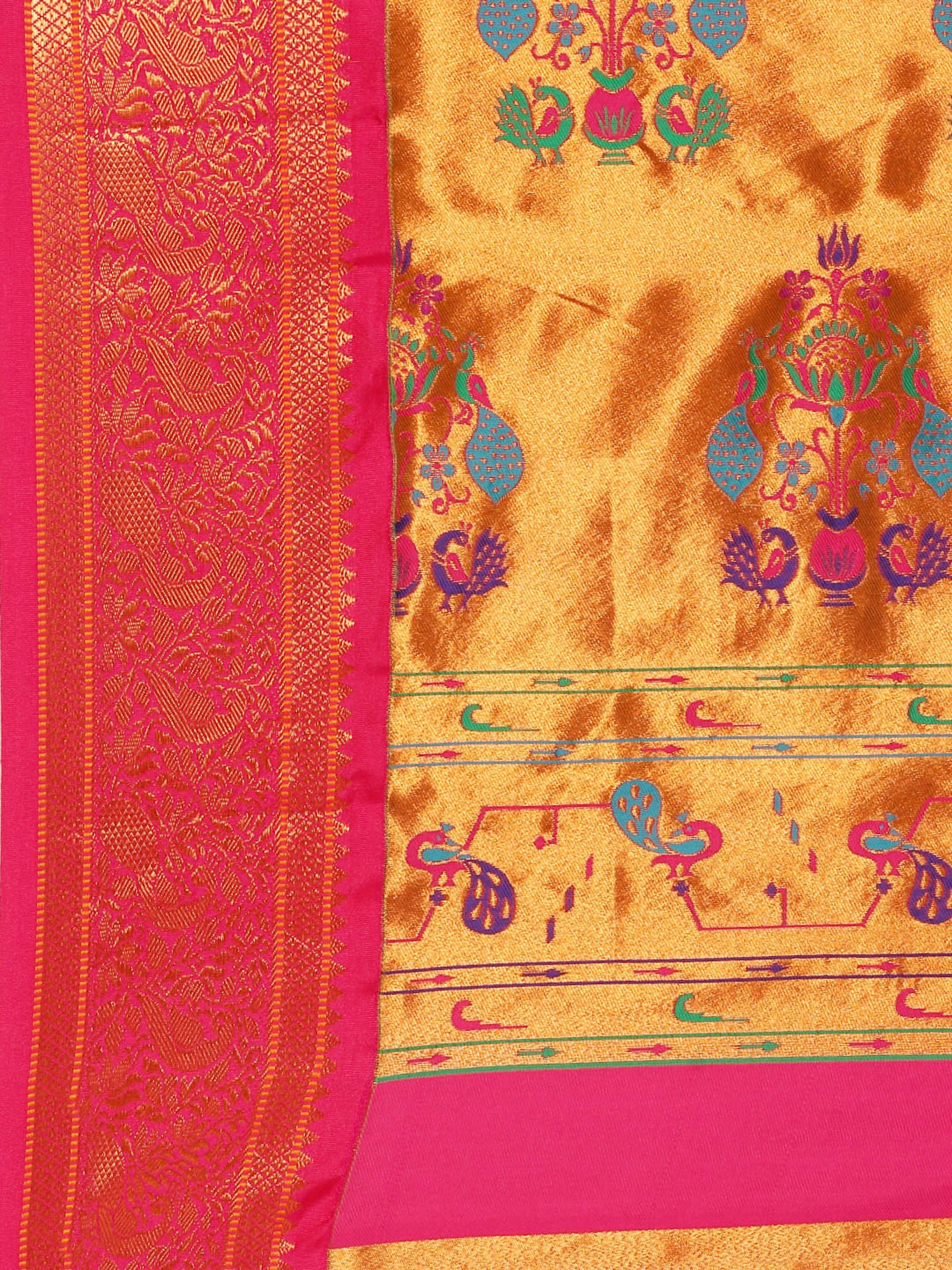 Explore The Collection Of Beautifully Designed Popati & Pink Soft Silk Peshwai Nath Paithani Saree With Blouse Piece From Varkala Silk Sarees. Add A Touch Of Timeless Elegance To Your Wardrobe With The Peshwai Nath Paithani Saree, A Stunning Blend Of Tradition And Modern Grace. Made From Soft Silk Fabric With A Composition Of 70% Polyester And 30% Silk, This Saree Offers A Smooth Texture And Rich Drape. The 5.5-Meter Saree With A 0.8-Meter Blouse Piece Is Adorned With A Copper Zari Intricate Peacock Design Jacquard Border, Adding A Regal Charm. The Body Features Copper Zari Peshwai Nath Meena Butti, While The Pallu Showcases Copper Zari Woven Peacock Motifs, Symbolizing Prosperity And Beauty. Enhanced With Zari And Multicolor Resham Silk Thread Embellishments, This Woven Kadiyal Paithani Saree Is Perfect For Weddings, Parties, And Festive Occasions. It Comes With A Matching Blouse Piece To Complete Your Look. Dry Clean For The First Wash, Followed By Gentle Hand Wash. Elevate Your Ethnic Style With This Luxurious Paithani Masterpiece.