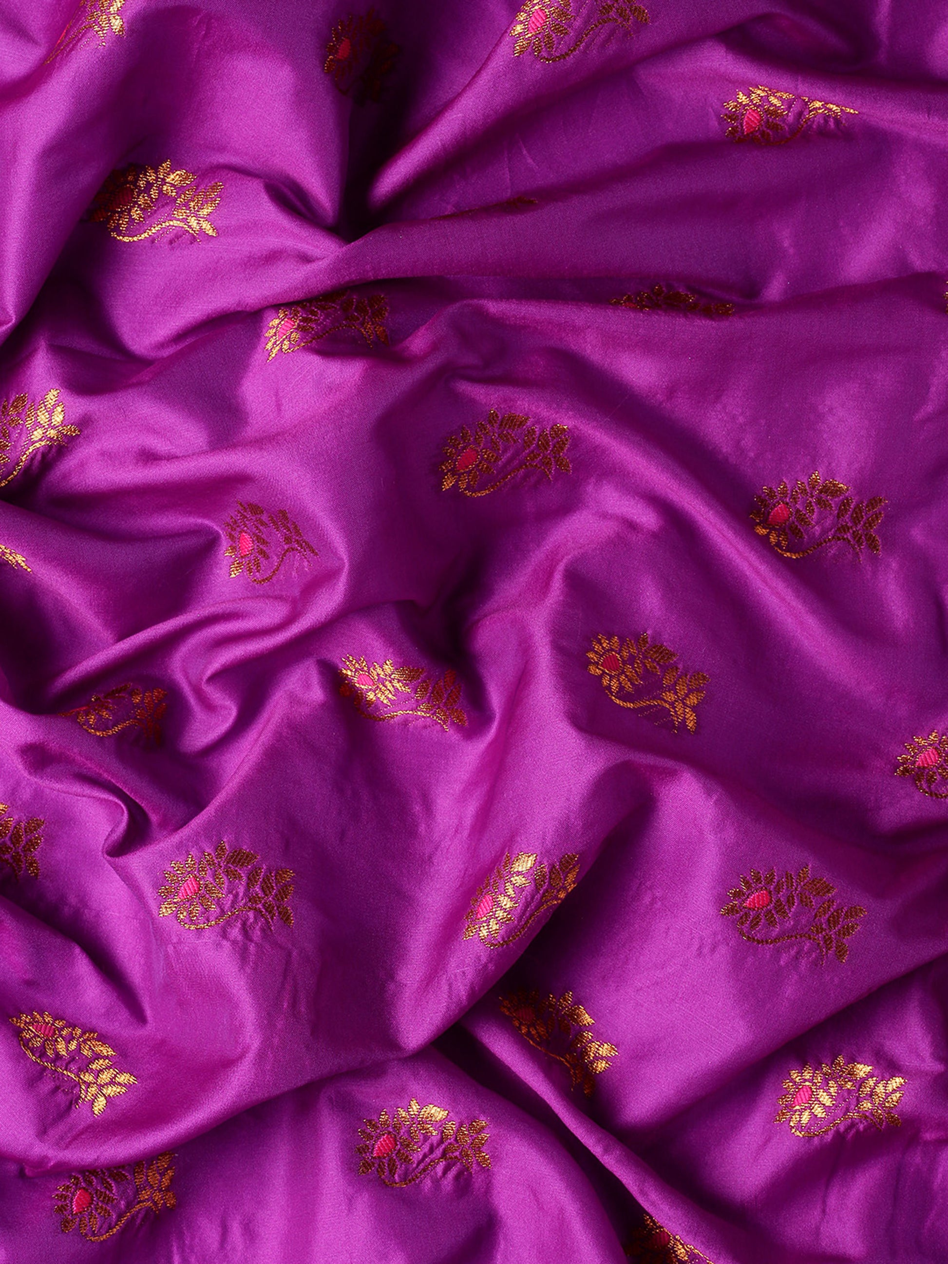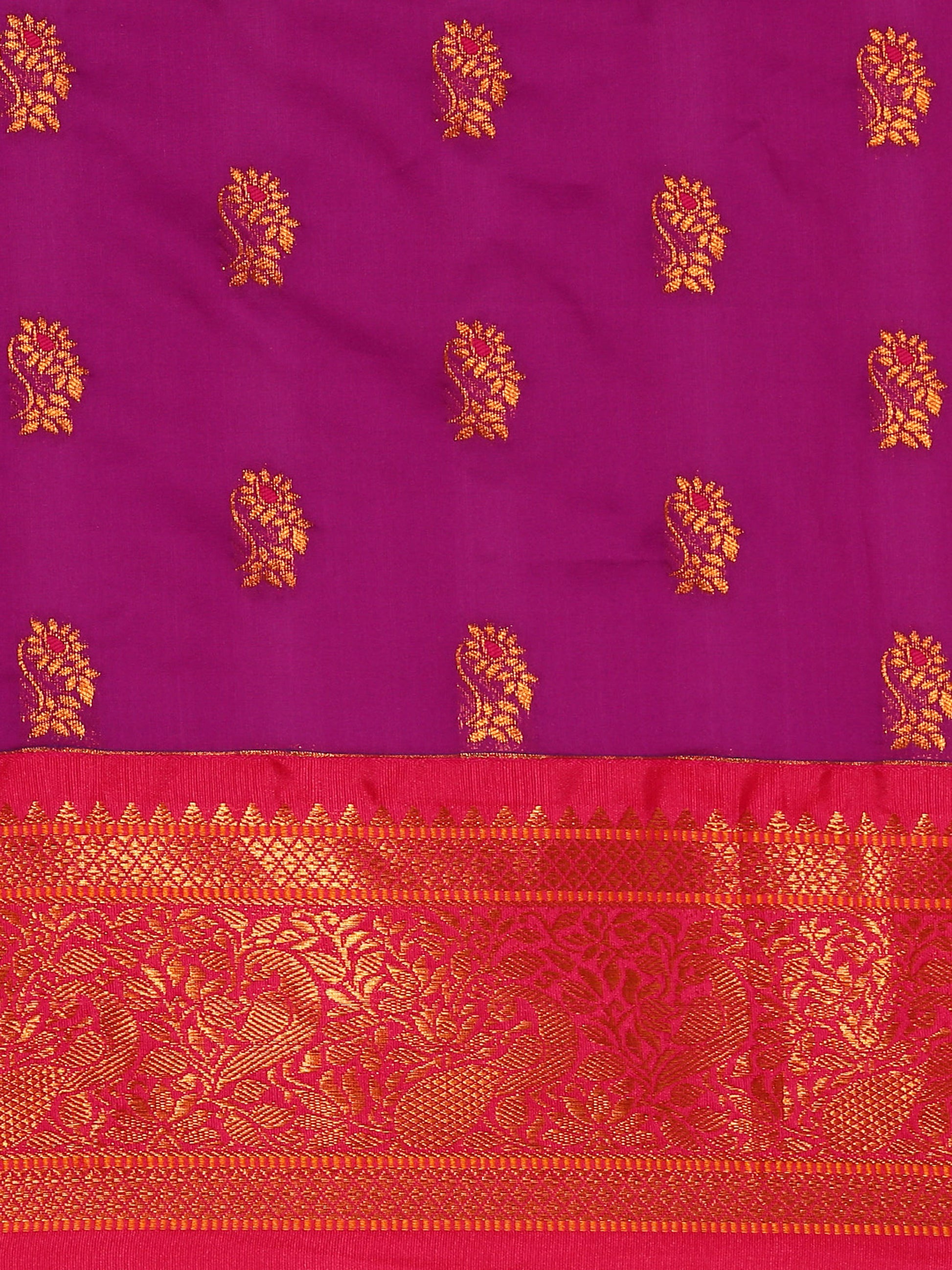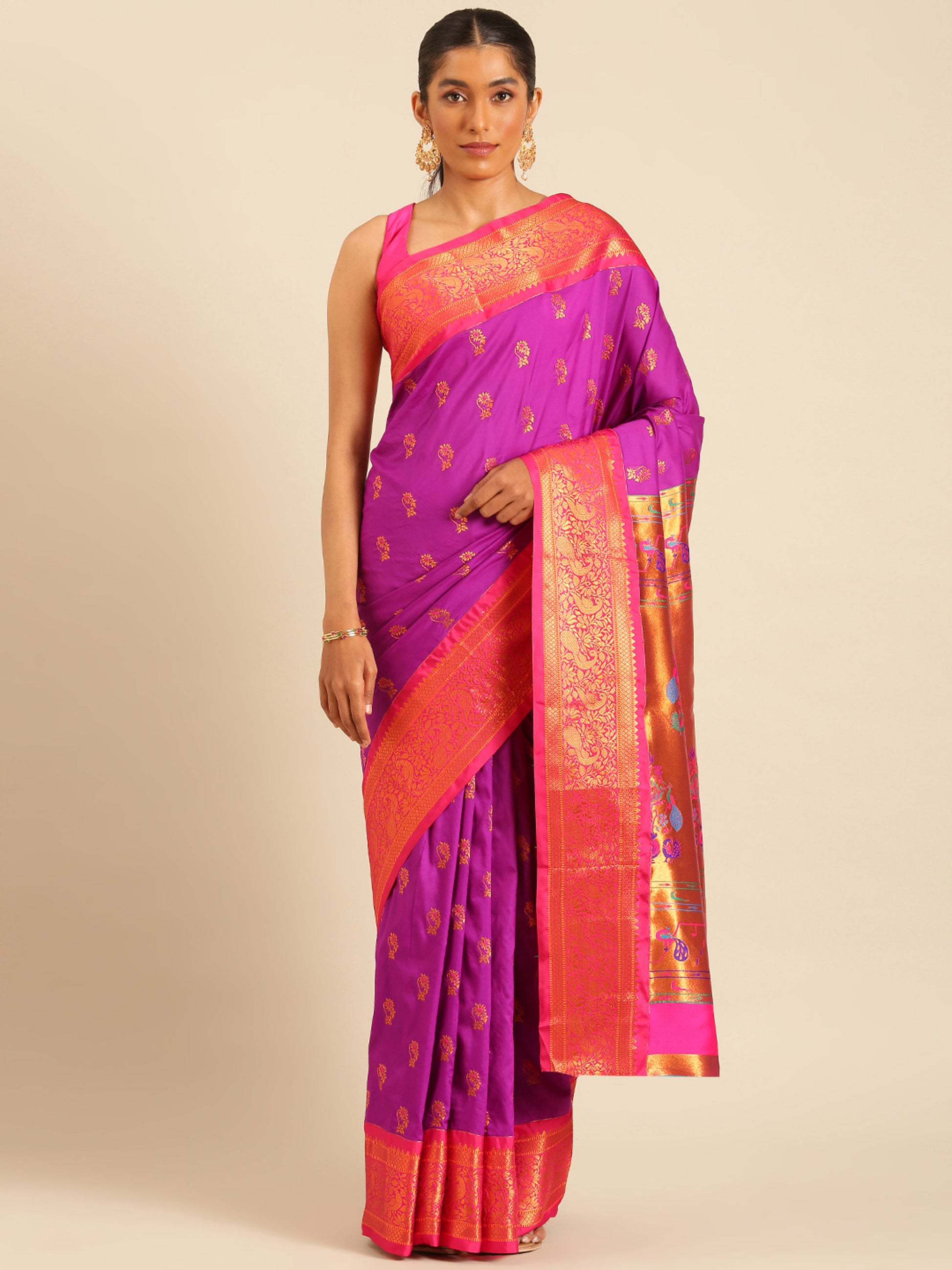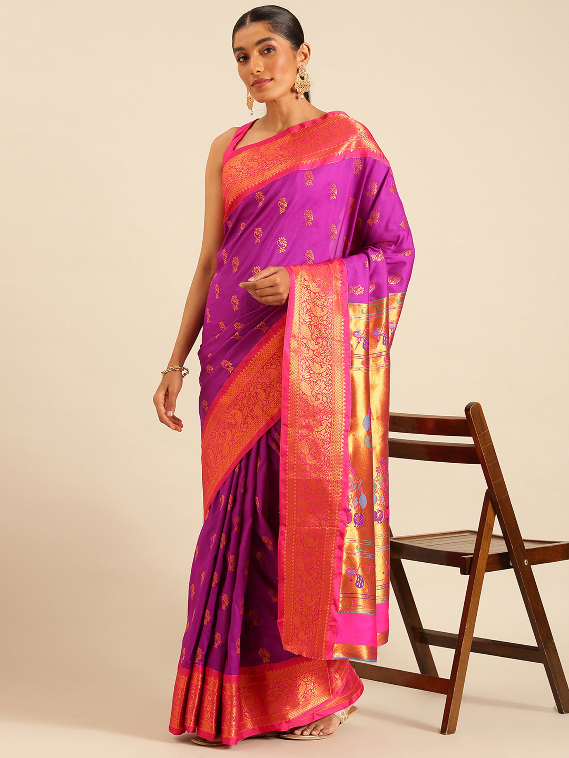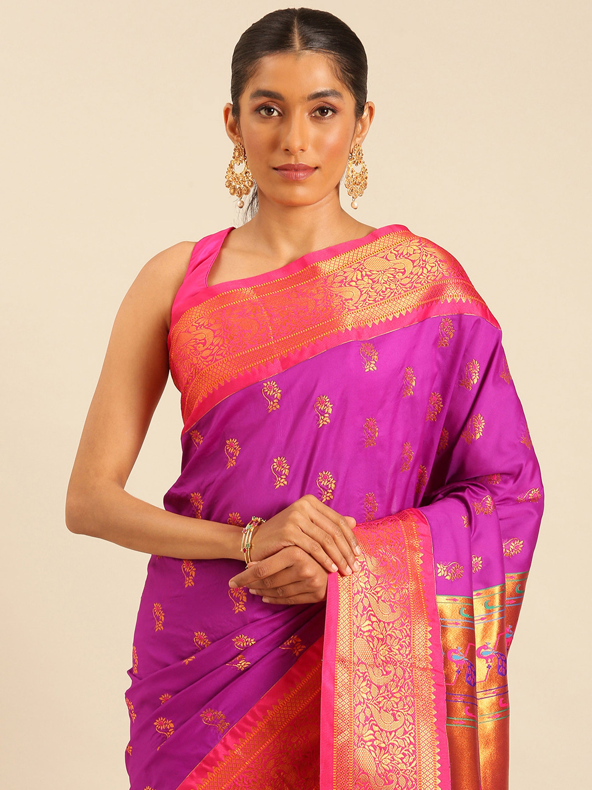 Explore The Collection Of Beautifully Designed Purple & Pink Soft Silk Peshwai Nath Paithani Saree With Blouse Piece From Varkala Silk Sarees. Add A Touch Of Timeless Elegance To Your Wardrobe With The Peshwai Nath Paithani Saree, A Stunning Blend Of Tradition And Modern Grace. Made From Soft Silk Fabric With A Composition Of 70% Polyester And 30% Silk, This Saree Offers A Smooth Texture And Rich Drape. The 5.5-Meter Saree With A 0.8-Meter Blouse Piece Is Adorned With A Copper Zari Intricate Peacock Design Jacquard Border, Adding A Regal Charm. The Body Features Copper Zari Peshwai Nath Meena Butti, While The Pallu Showcases Copper Zari Woven Peacock Motifs, Symbolizing Prosperity And Beauty. Enhanced With Zari And Multicolor Resham Silk Thread Embellishments, This Woven Kadiyal Paithani Saree Is Perfect For Weddings, Parties, And Festive Occasions. It Comes With A Matching Blouse Piece To Complete Your Look. Dry Clean For The First Wash, Followed By Gentle Hand Wash. Elevate Your Ethnic Style With This Luxurious Paithani Masterpiece.
