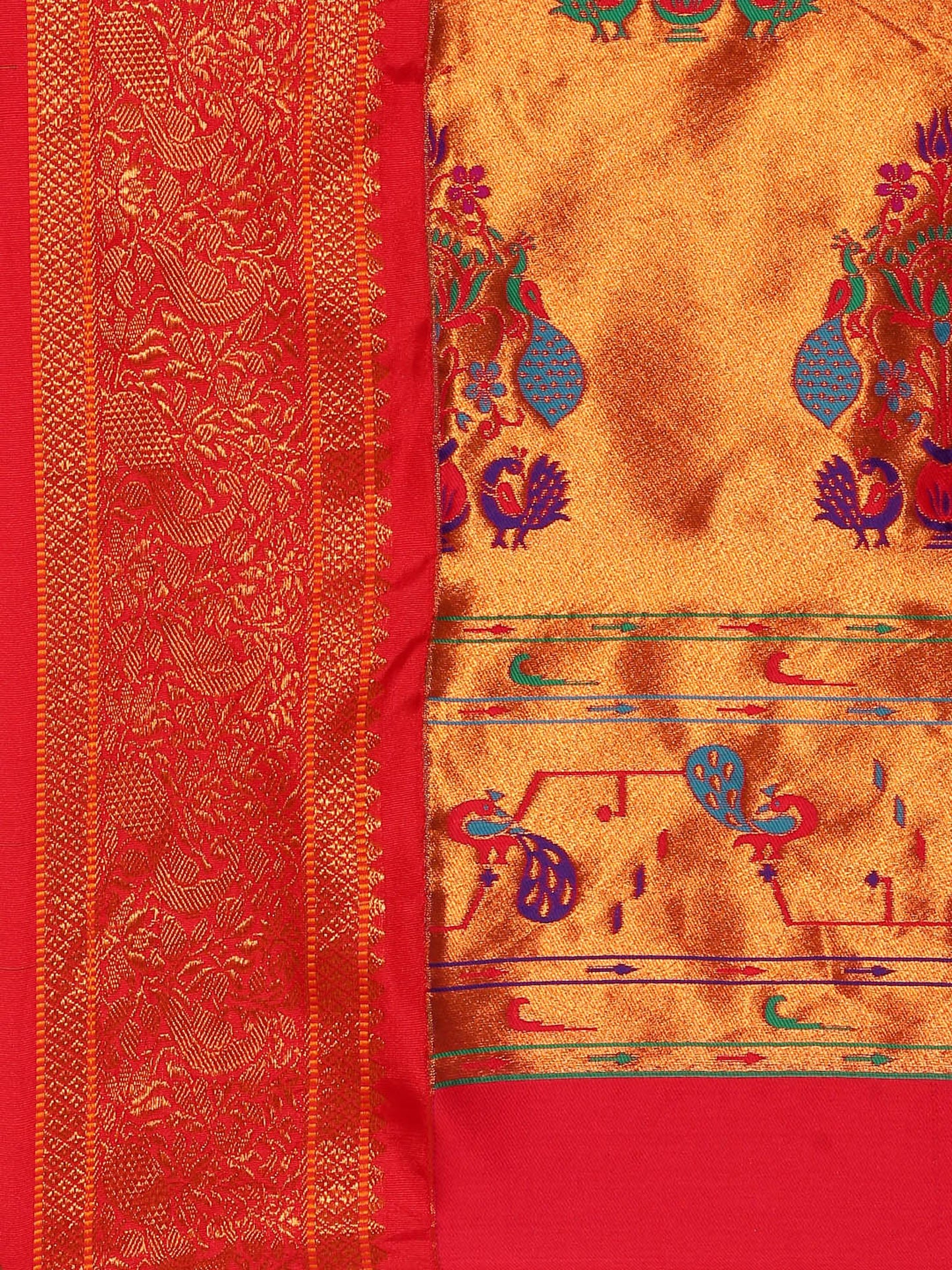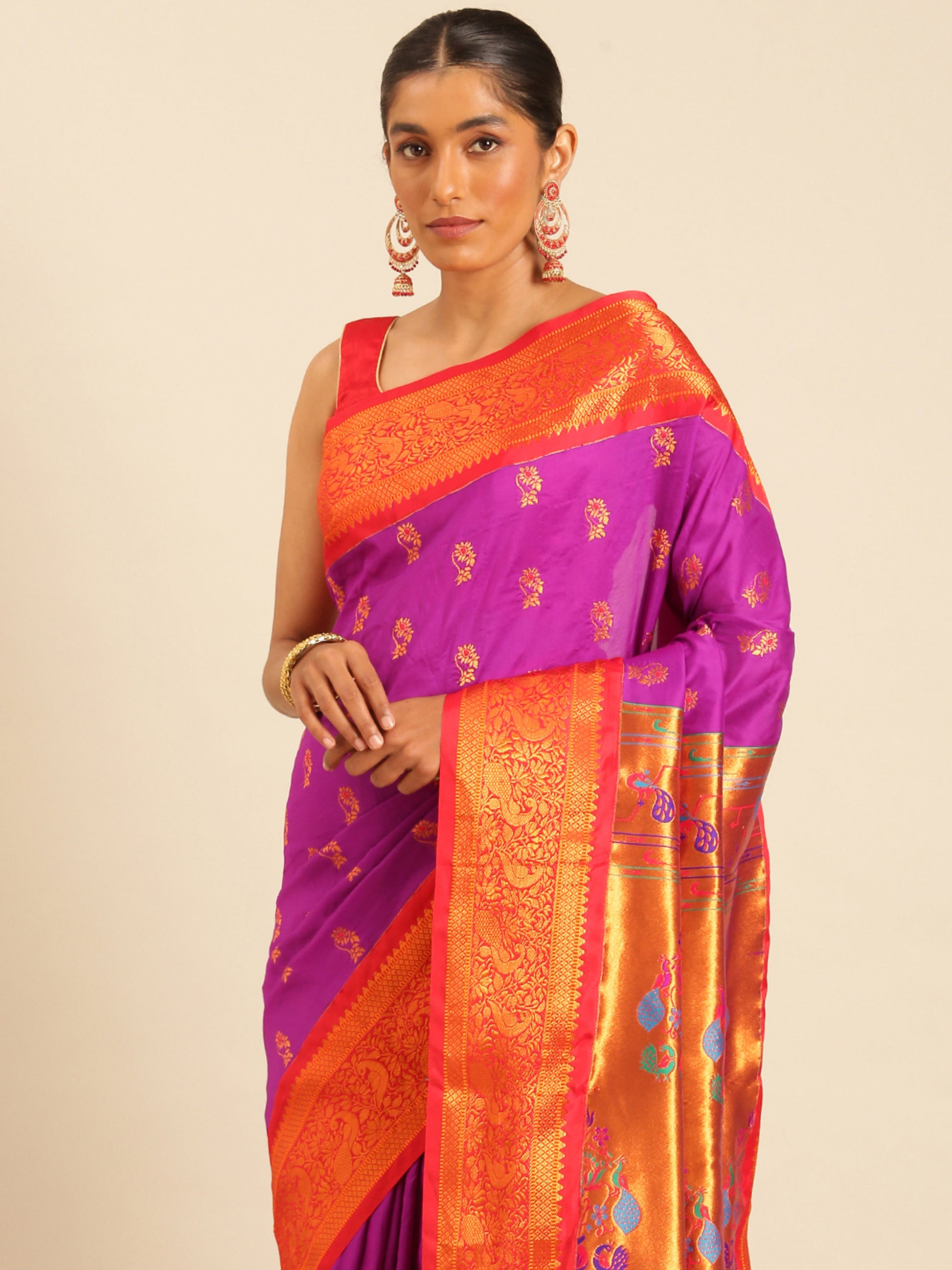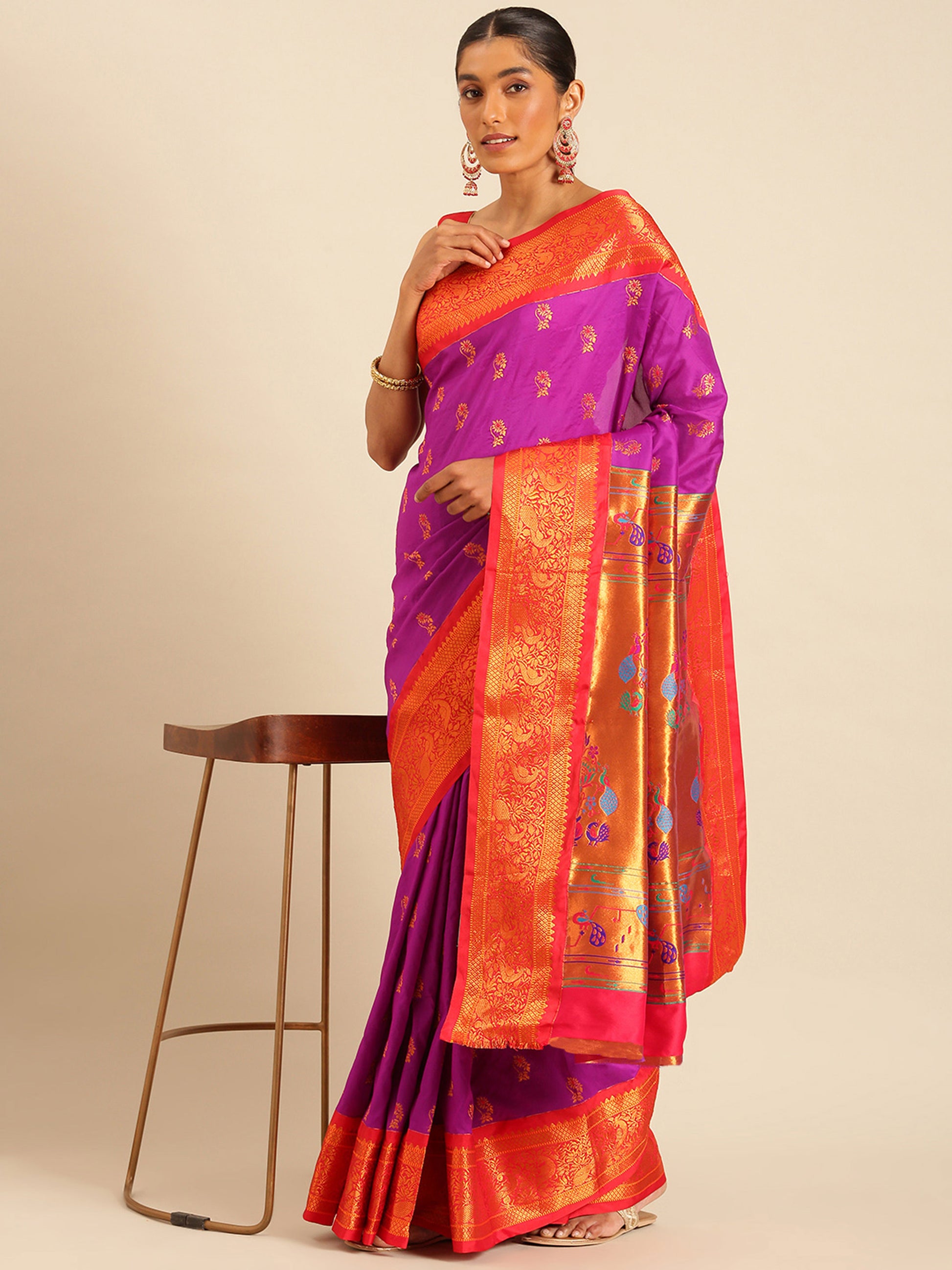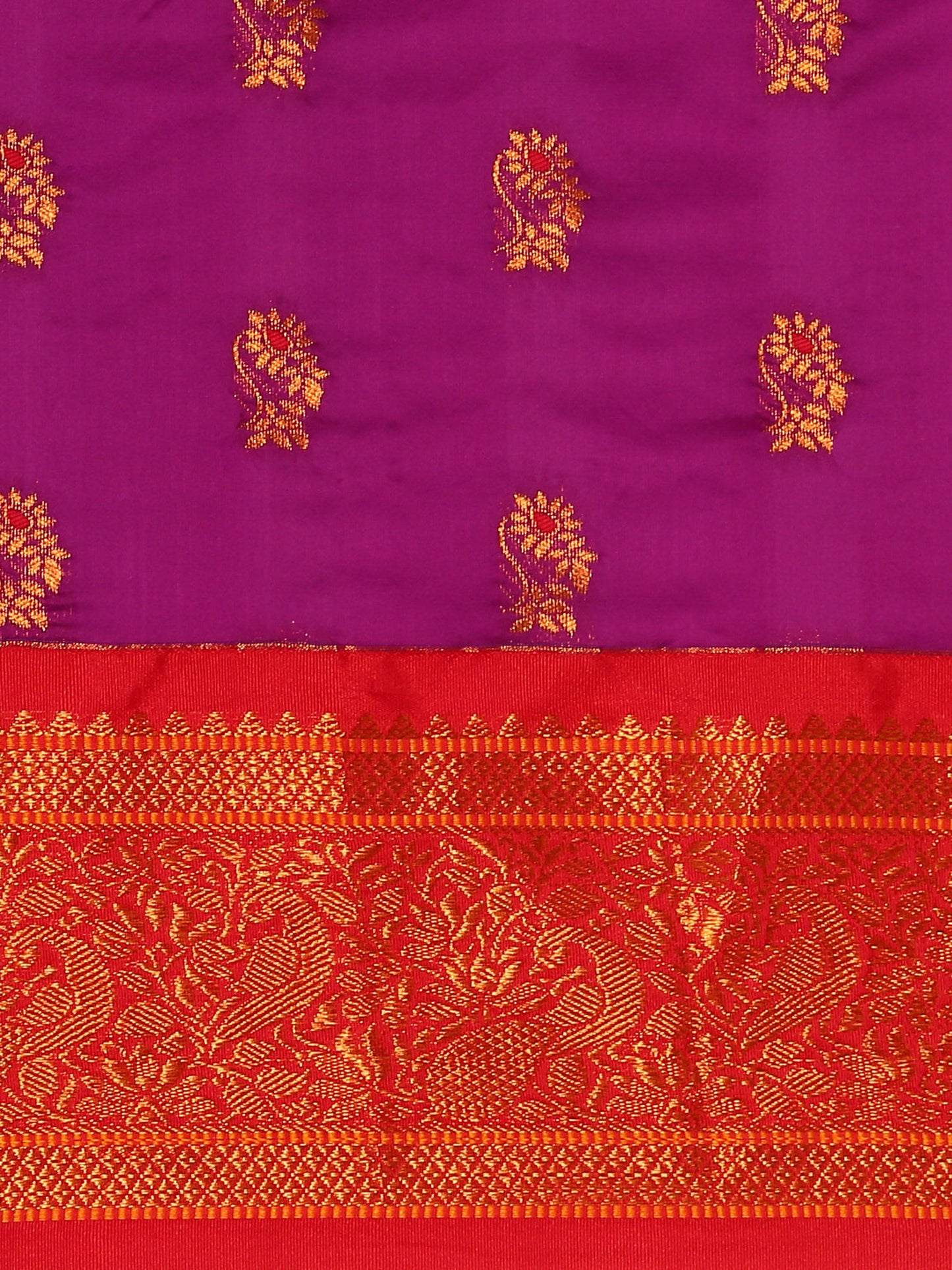Explore The Collection Of Beautifully Designed Purple & Red Soft Silk Peshwai Nath Paithani Saree With Blouse Piece From Varkala Silk Sarees. Add A Touch Of Timeless Elegance To Your Wardrobe With The Peshwai Nath Paithani Saree, A Stunning Blend Of Tradition And Modern Grace. Made From Soft Silk Fabric With A Composition Of 70% Polyester And 30% Silk, This Saree Offers A Smooth Texture And Rich Drape. The 5.5-Meter Saree With A 0.8-Meter Blouse Piece Is Adorned With A Copper Zari Intricate Peacock Design Jacquard Border, Adding A Regal Charm. The Body Features Copper Zari Peshwai Nath Meena Butti, While The Pallu Showcases Copper Zari Woven Peacock Motifs, Symbolizing Prosperity And Beauty. Enhanced With Zari And Multicolor Resham Silk Thread Embellishments, This Woven Kadiyal Paithani Saree Is Perfect For Weddings, Parties, And Festive Occasions. It Comes With A Matching Blouse Piece To Complete Your Look. Dry Clean For The First Wash, Followed By Gentle Hand Wash. Elevate Your Ethnic Style With This Luxurious Paithani Masterpiece.