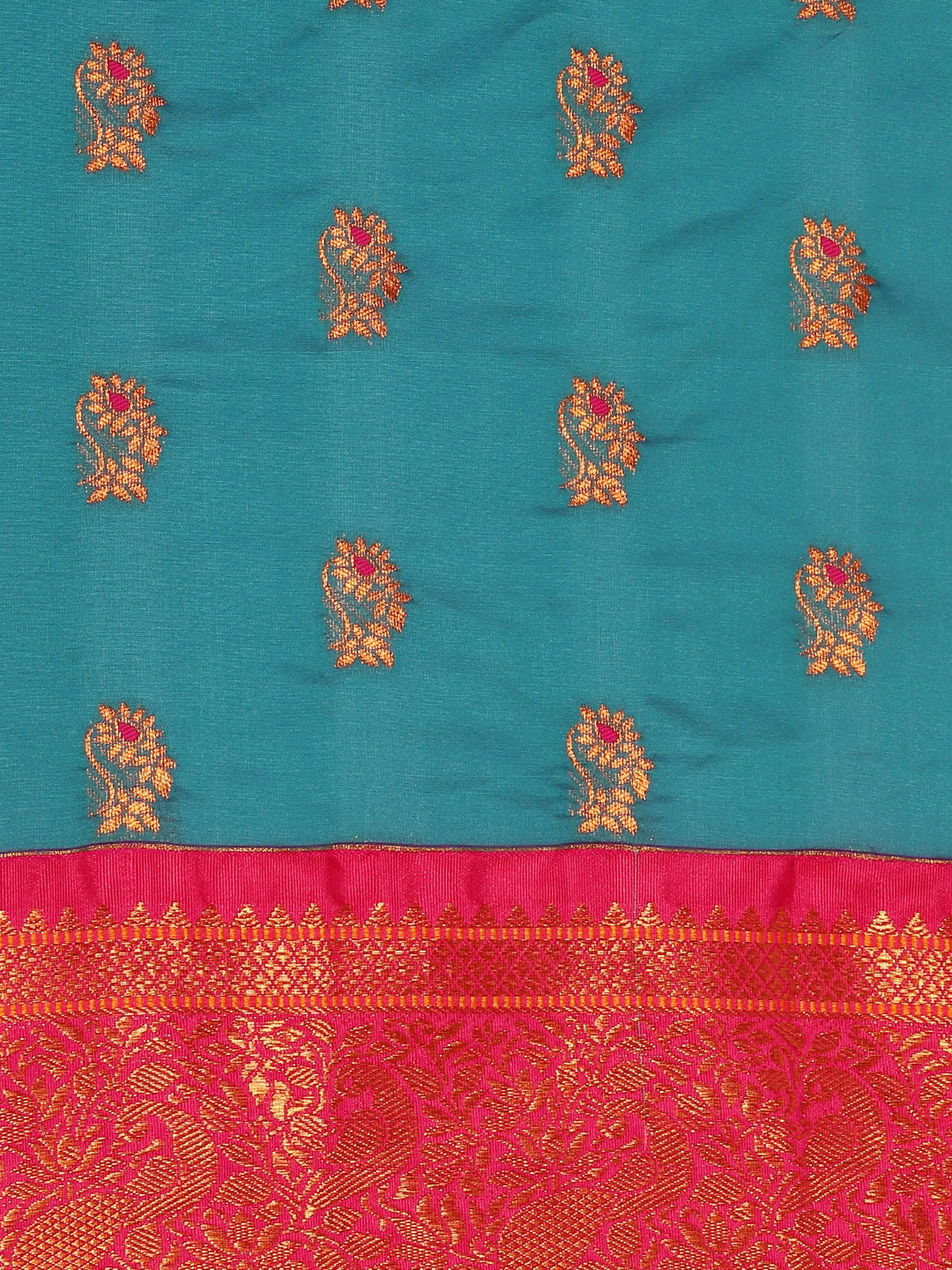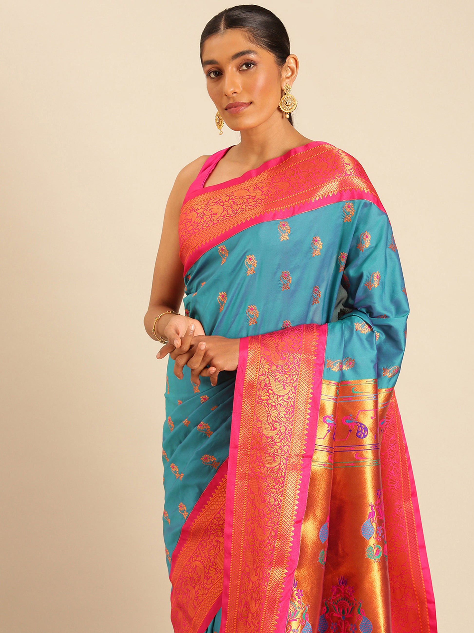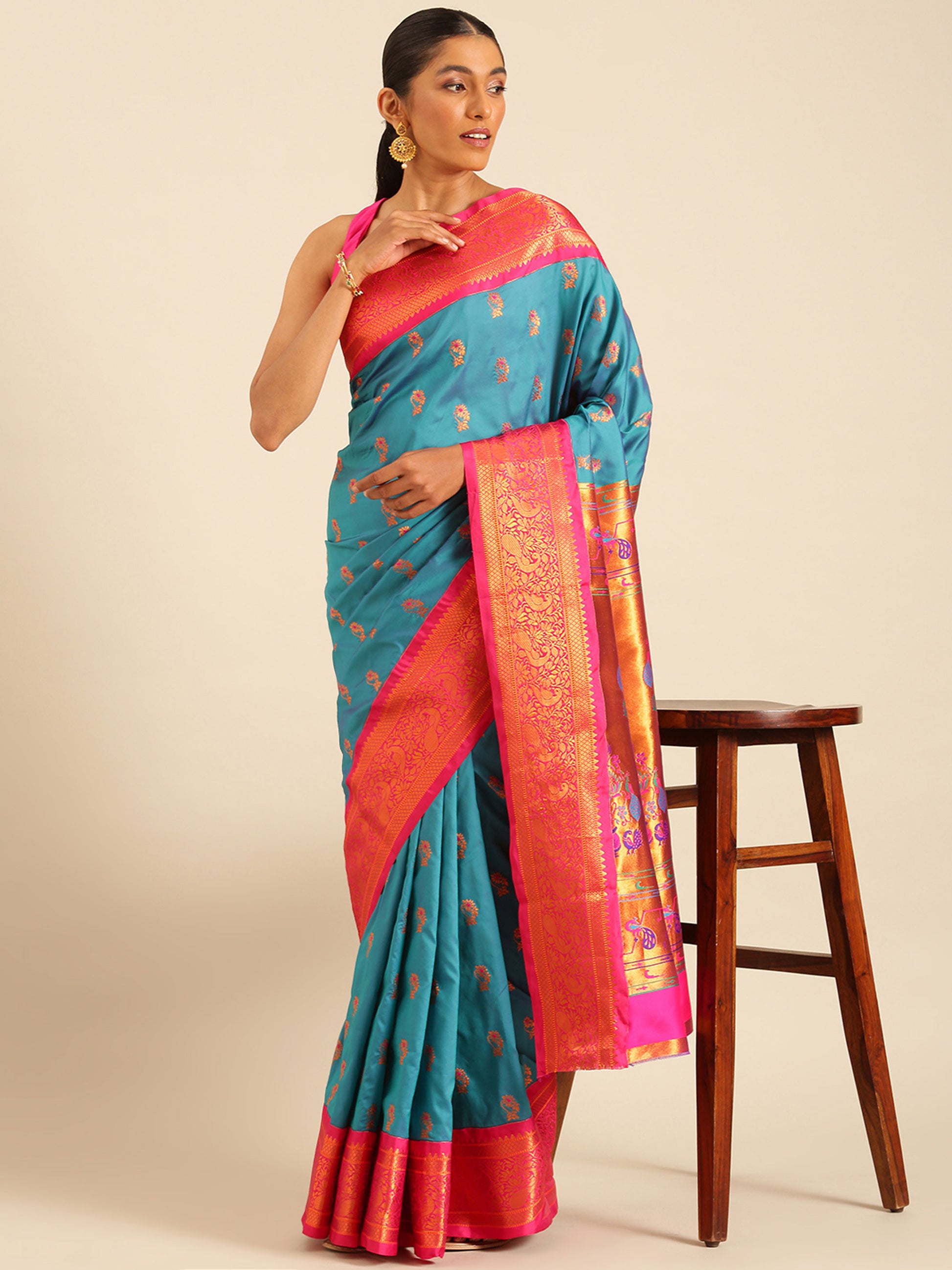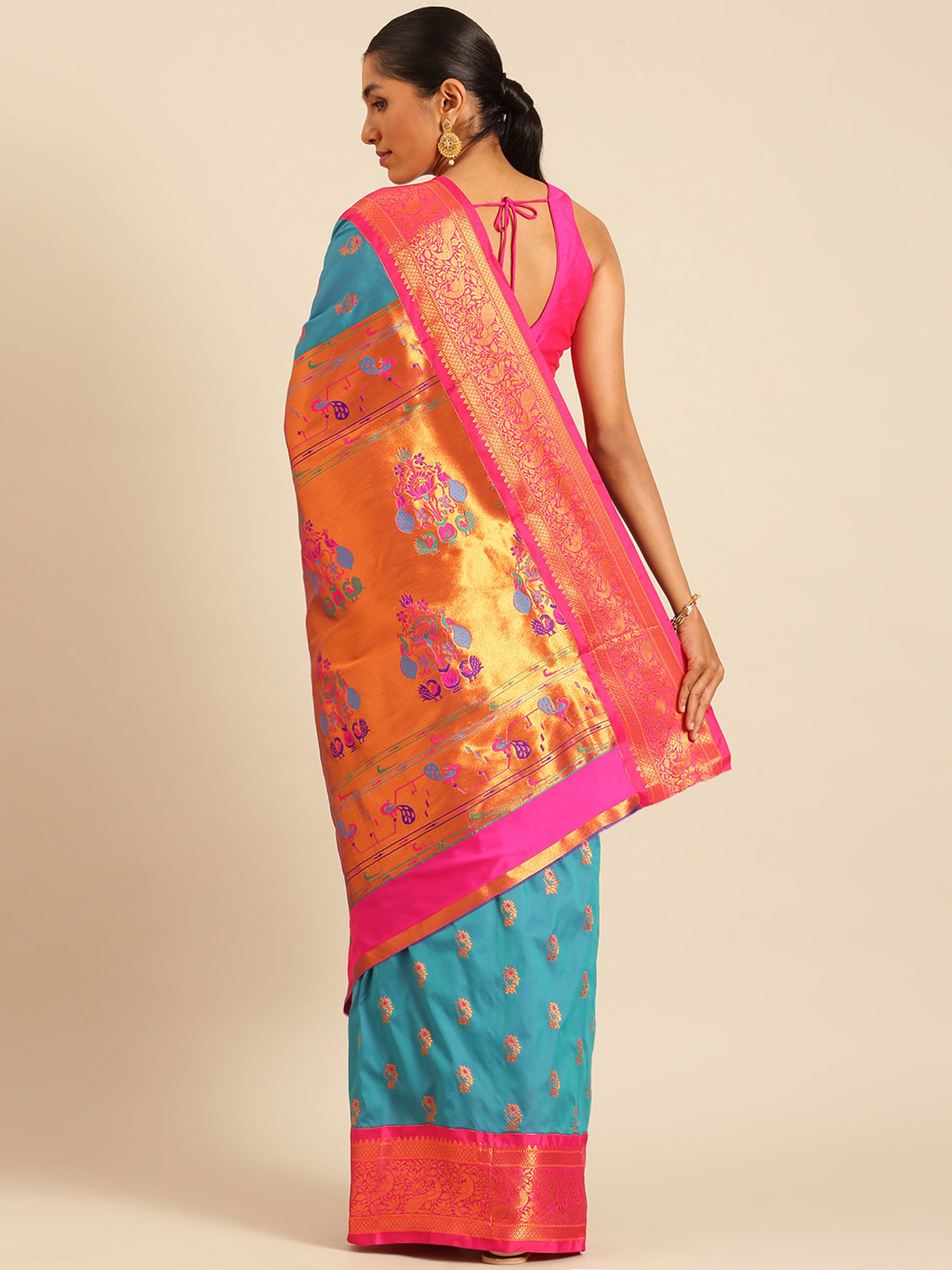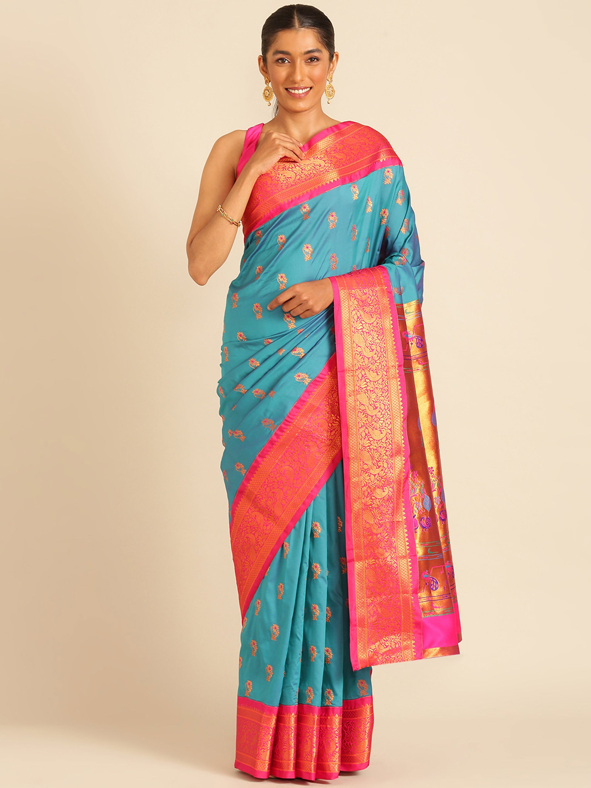 Explore The Collection Of Beautifully Designed Rama & Pink Soft Silk Peshwai Nath Paithani Saree With Blouse Piece From Varkala Silk Sarees. Add A Touch Of Timeless Elegance To Your Wardrobe With The Peshwai Nath Paithani Saree, A Stunning Blend Of Tradition And Modern Grace. Made From Soft Silk Fabric With A Composition Of 70% Polyester And 30% Silk, This Saree Offers A Smooth Texture And Rich Drape. The 5.5-Meter Saree With A 0.8-Meter Blouse Piece Is Adorned With A Copper Zari Intricate Peacock Design Jacquard Border, Adding A Regal Charm. The Body Features Copper Zari Peshwai Nath Meena Butti, While The Pallu Showcases Copper Zari Woven Peacock Motifs, Symbolizing Prosperity And Beauty. Enhanced With Zari And Multicolor Resham Silk Thread Embellishments, This Woven Kadiyal Paithani Saree Is Perfect For Weddings, Parties, And Festive Occasions. It Comes With A Matching Blouse Piece To Complete Your Look. Dry Clean For The First Wash, Followed By Gentle Hand Wash. Elevate Your Ethnic Style With This Luxurious Paithani Masterpiece.