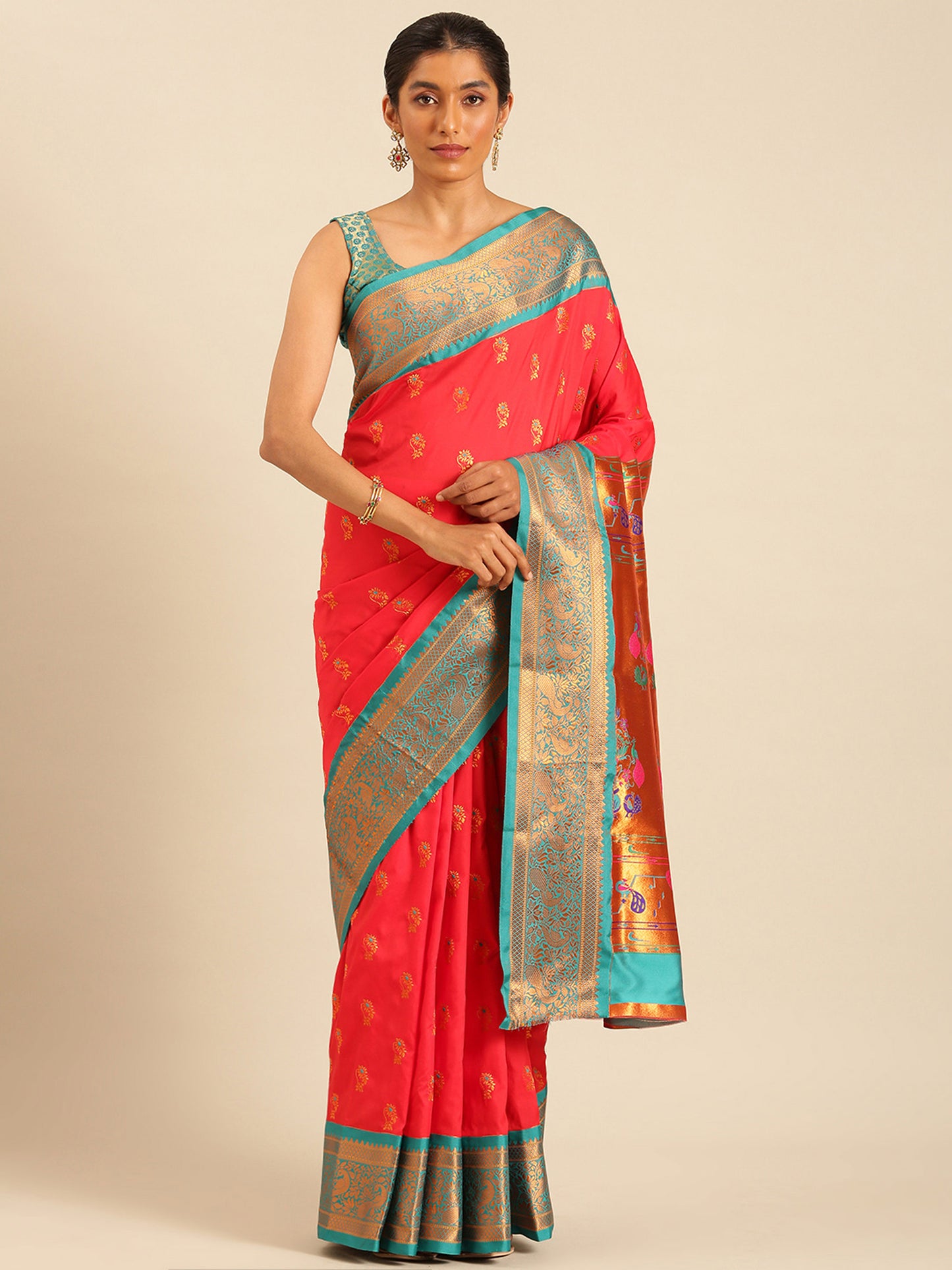 Explore The Collection Of Beautifully Designed Red & Rama Soft Silk Peshwai Nath Paithani Saree With Blouse Piece From Varkala Silk Sarees. Add A Touch Of Timeless Elegance To Your Wardrobe With The Peshwai Nath Paithani Saree, A Stunning Blend Of Tradition And Modern Grace. Made From Soft Silk Fabric With A Composition Of 70% Polyester And 30% Silk, This Saree Offers A Smooth Texture And Rich Drape. The 5.5-Meter Saree With A 0.8-Meter Blouse Piece Is Adorned With A Copper Zari Intricate Peacock Design Jacquard Border, Adding A Regal Charm. The Body Features Copper Zari Peshwai Nath Meena Butti, While The Pallu Showcases Copper Zari Woven Peacock Motifs, Symbolizing Prosperity And Beauty. Enhanced With Zari And Multicolor Resham Silk Thread Embellishments, This Woven Kadiyal Paithani Saree Is Perfect For Weddings, Parties, And Festive Occasions. It Comes With A Matching Blouse Piece To Complete Your Look. Dry Clean For The First Wash, Followed By Gentle Hand Wash. Elevate Your Ethnic Style With This Luxurious Paithani Masterpiece.