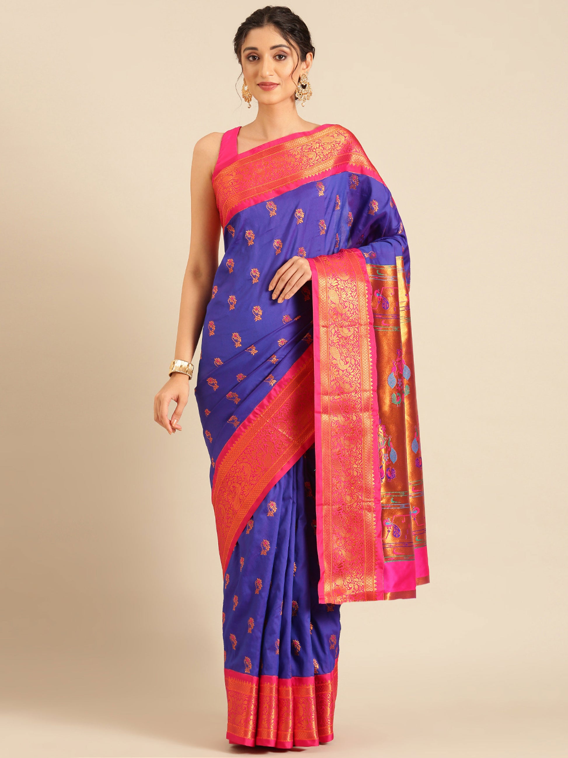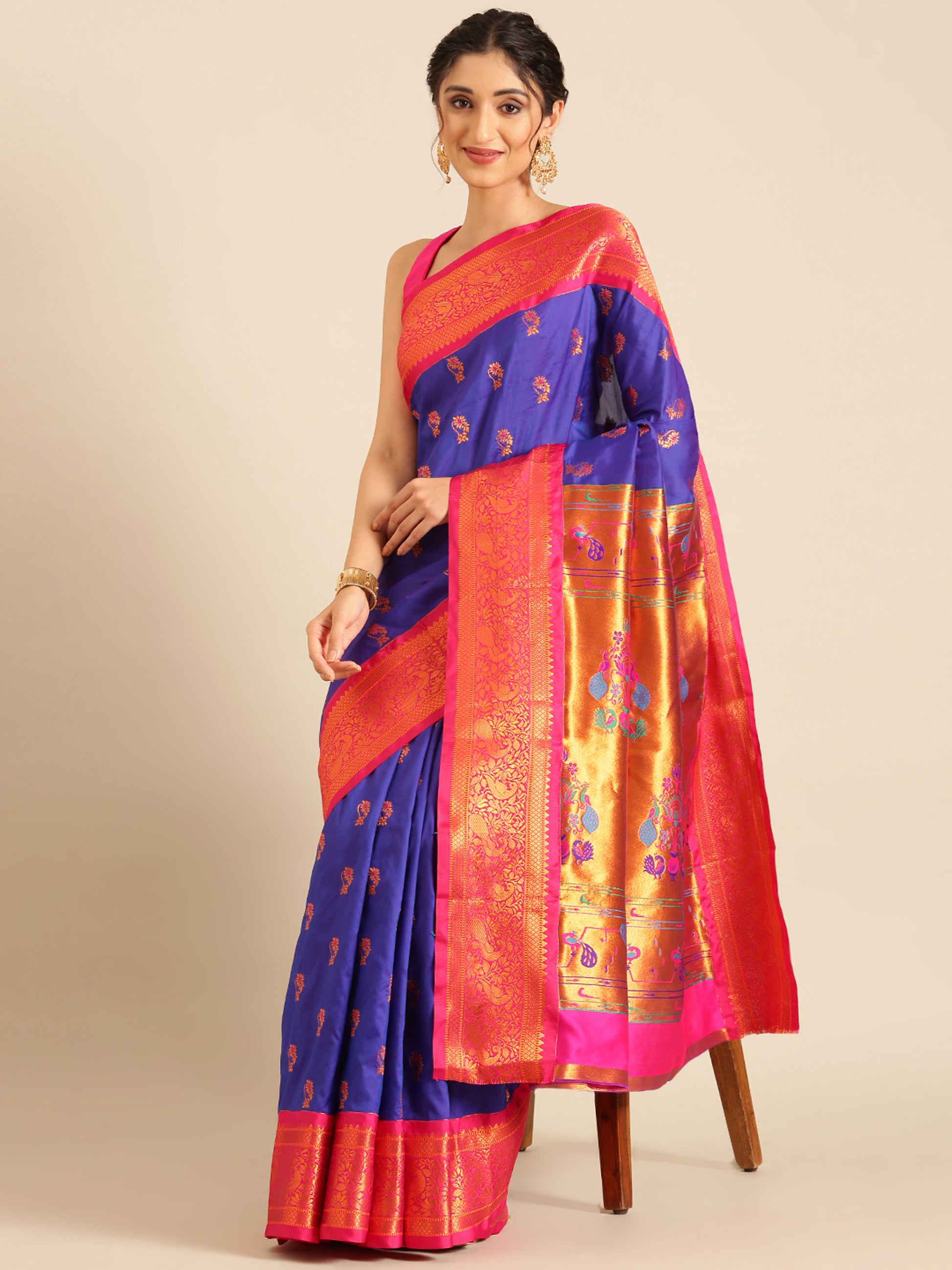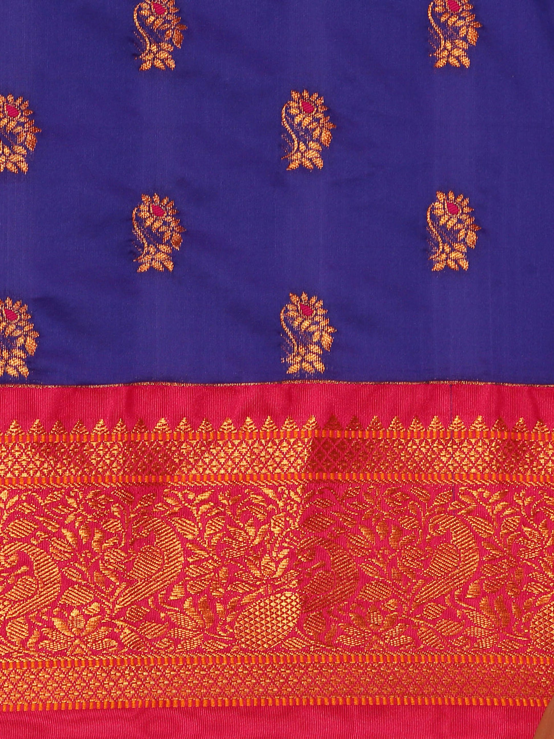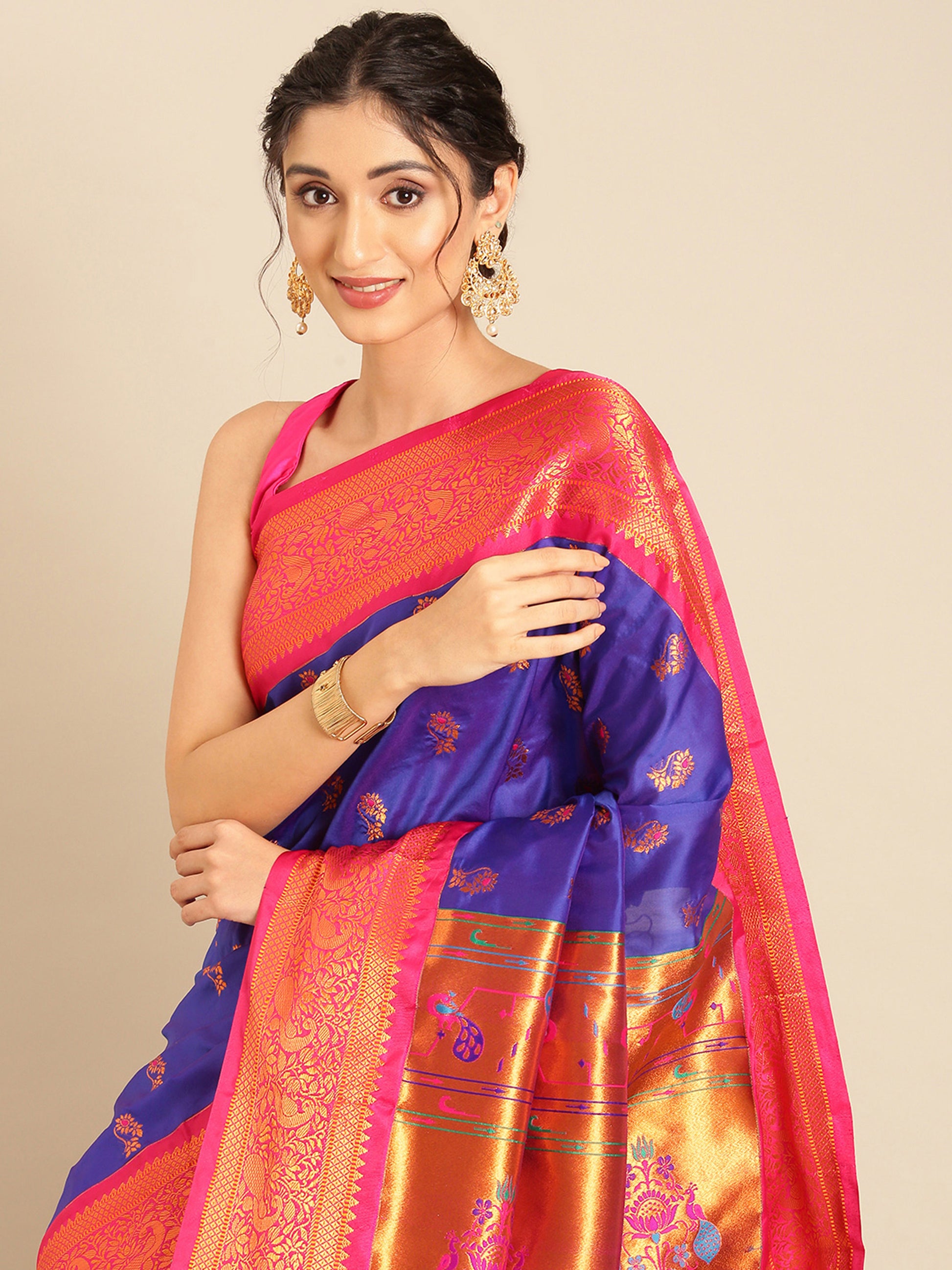 Explore The Collection Of Beautifully Designed Royal Blue & Pink Soft Silk Peshwai Nath Paithani Saree With Blouse Piece From Varkala Silk Sarees. Add A Touch Of Timeless Elegance To Your Wardrobe With The Peshwai Nath Paithani Saree, A Stunning Blend Of Tradition And Modern Grace. Made From Soft Silk Fabric With A Composition Of 70% Polyester And 30% Silk, This Saree Offers A Smooth Texture And Rich Drape. The 5.5-Meter Saree With A 0.8-Meter Blouse Piece Is Adorned With A Copper Zari Intricate Peacock Design Jacquard Border, Adding A Regal Charm. The Body Features Copper Zari Peshwai Nath Meena Butti, While The Pallu Showcases Copper Zari Woven Peacock Motifs, Symbolizing Prosperity And Beauty. Enhanced With Zari And Multicolor Resham Silk Thread Embellishments, This Woven Kadiyal Paithani Saree Is Perfect For Weddings, Parties, And Festive Occasions. It Comes With A Matching Blouse Piece To Complete Your Look. Dry Clean For The First Wash, Followed By Gentle Hand Wash. Elevate Your Ethnic Style With This Luxurious Paithani Masterpiece.
