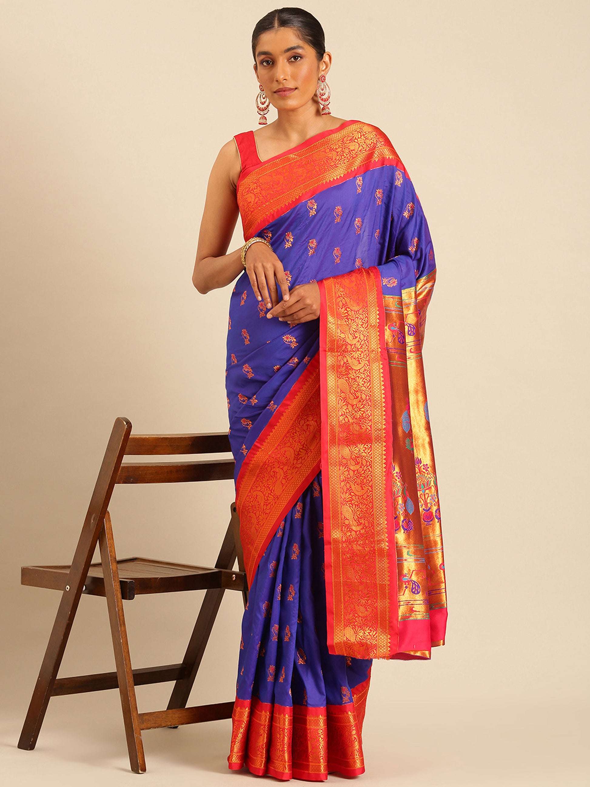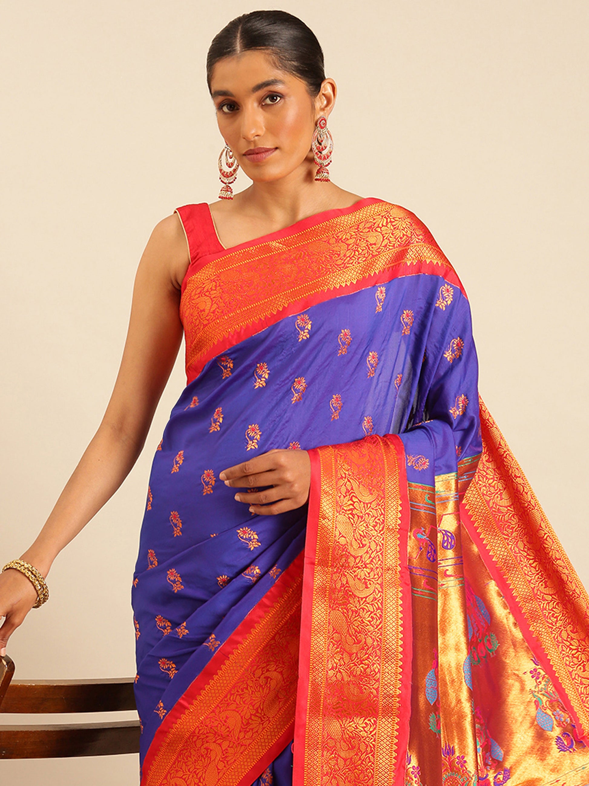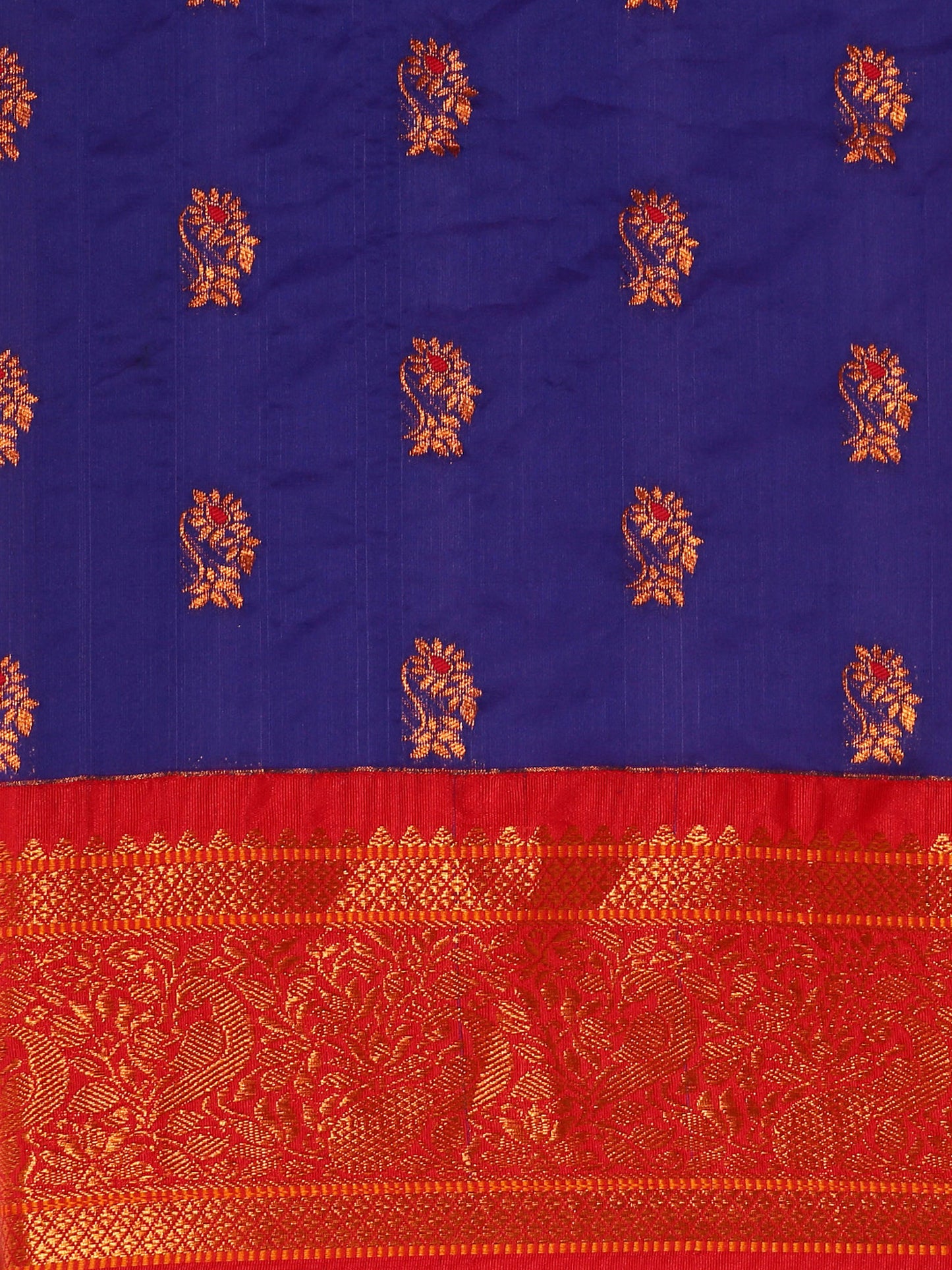 Explore The Collection Of Beautifully Designed Royal Blue & Red Soft Silk Peshwai Nath Paithani Saree With Blouse Piece From Varkala Silk Sarees. Add A Touch Of Timeless Elegance To Your Wardrobe With The Peshwai Nath Paithani Saree, A Stunning Blend Of Tradition And Modern Grace. Made From Soft Silk Fabric With A Composition Of 70% Polyester And 30% Silk, This Saree Offers A Smooth Texture And Rich Drape. The 5.5-Meter Saree With A 0.8-Meter Blouse Piece Is Adorned With A Copper Zari Intricate Peacock Design Jacquard Border, Adding A Regal Charm. The Body Features Copper Zari Peshwai Nath Meena Butti, While The Pallu Showcases Copper Zari Woven Peacock Motifs, Symbolizing Prosperity And Beauty. Enhanced With Zari And Multicolor Resham Silk Thread Embellishments, This Woven Kadiyal Paithani Saree Is Perfect For Weddings, Parties, And Festive Occasions. It Comes With A Matching Blouse Piece To Complete Your Look. Dry Clean For The First Wash, Followed By Gentle Hand Wash. Elevate Your Ethnic Style With This Luxurious Paithani Masterpiece.