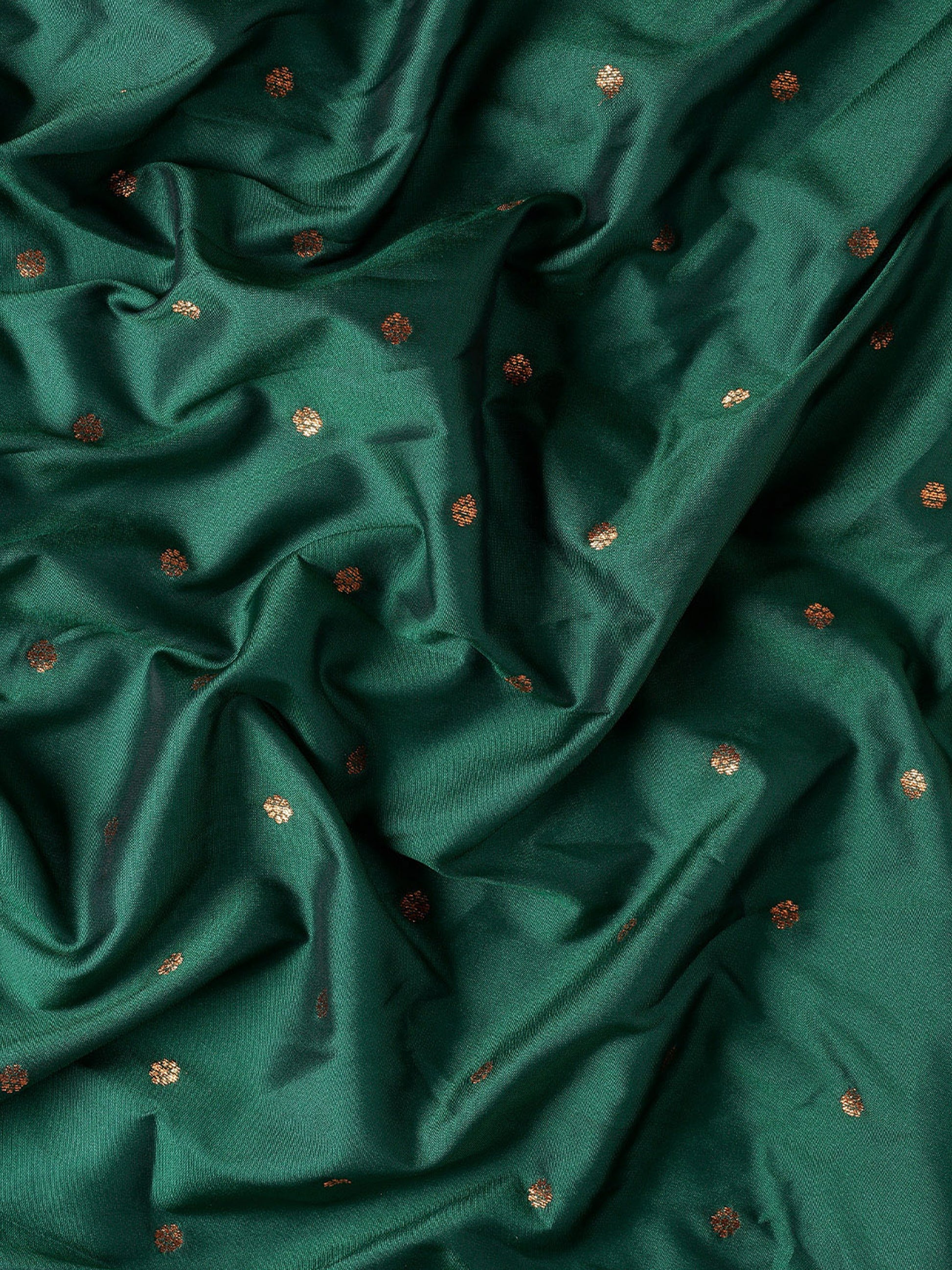 Explore The Collection Of Beautifully Designed Bottle Green & Red Soft Silk Maharani Nauwari Paithani Saree From Varkala Silk Sarees. This Soft Silk Maharani Nauwari Paithani Saree embodies elegance with its intricate design. Adorned with small copper zari buttis across its body, the saree features a captivating checks pattern in copper zari border. Its distinguishing feature is the exquisite peacock motifs in copper zari adorning the pallu. This 8.5-meter long saree is renowned for its Nauvari style draping, a hallmark of Maharashtrian culture and heritage. The draping style of Nauvari saree is distinctive, involving a single length of fabric wrapped around the body, forming a series of pleats at the waist which are tucked securely. This style not only exudes regality but also holds significant cultural and traditional value, making it ideal for weddings, festivals, and other ceremonial occasions
