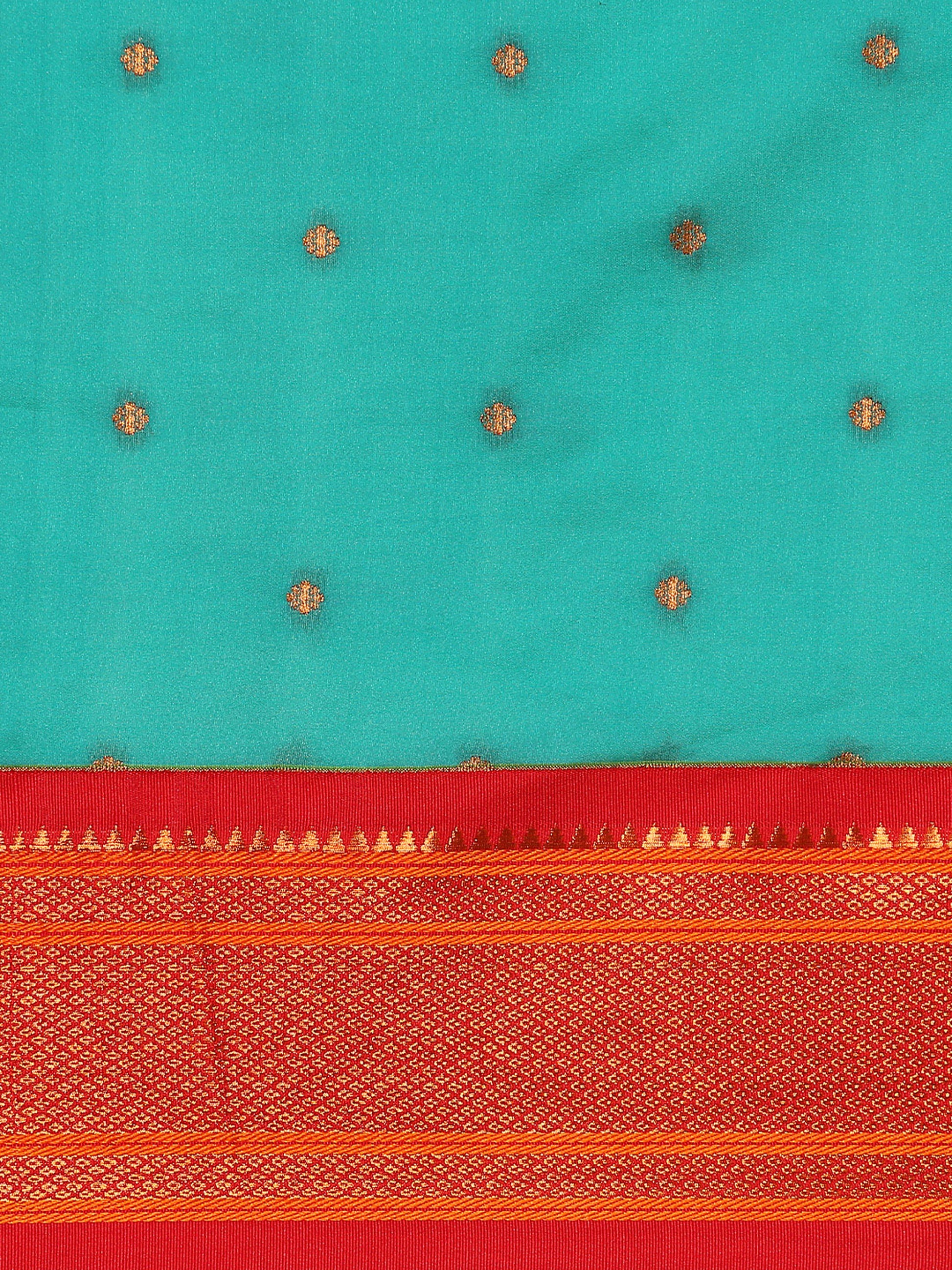 Explore The Collection Of Beautifully Designed Chintamani & Red Soft Silk Maharani Nauwari Paithani Saree From Varkala Silk Sarees. This Soft Silk Maharani Nauwari Paithani Saree embodies elegance with its intricate design. Adorned with small copper zari buttis across its body, the saree features a captivating checks pattern in copper zari border. Its distinguishing feature is the exquisite peacock motifs in copper zari adorning the pallu. This 8.5-meter long saree is renowned for its Nauvari style draping, a hallmark of Maharashtrian culture and heritage. The draping style of Nauvari saree is distinctive, involving a single length of fabric wrapped around the body, forming a series of pleats at the waist which are tucked securely. This style not only exudes regality but also holds significant cultural and traditional value, making it ideal for weddings, festivals, and other ceremonial occasions