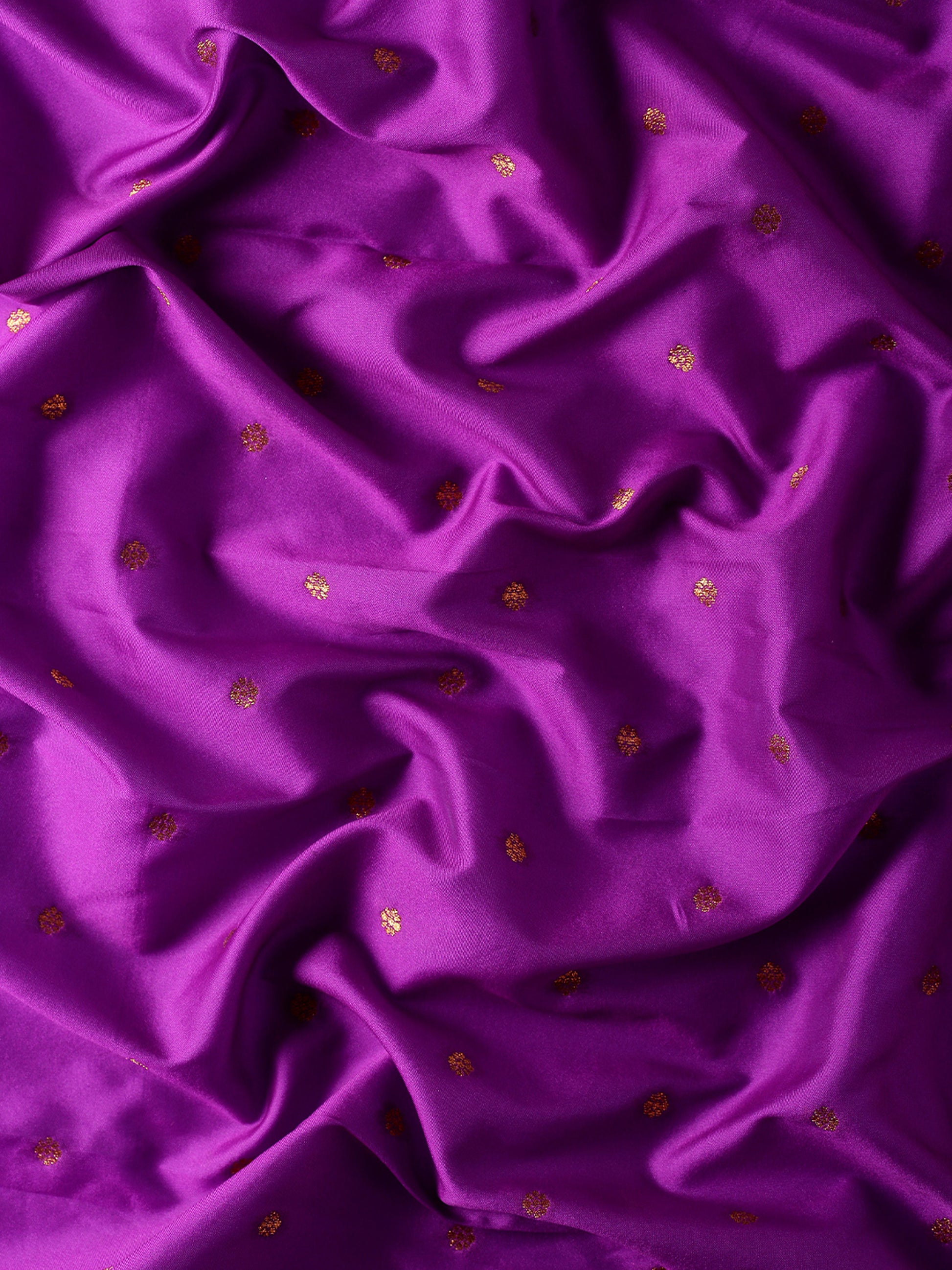 Explore The Collection Of Beautifully Designed Purple & Pink Soft Silk Maharani Nauwari Paithani Saree From Varkala Silk Sarees. This Soft Silk Maharani Nauwari Paithani Saree embodies elegance with its intricate design. Adorned with small copper zari buttis across its body, the saree features a captivating checks pattern in copper zari border. Its distinguishing feature is the exquisite peacock motifs in copper zari adorning the pallu. This 8.5-meter long saree is renowned for its Nauvari style draping, a hallmark of Maharashtrian culture and heritage. The draping style of Nauvari saree is distinctive, involving a single length of fabric wrapped around the body, forming a series of pleats at the waist which are tucked securely. This style not only exudes regality but also holds significant cultural and traditional value, making it ideal for weddings, festivals, and other ceremonial occasions