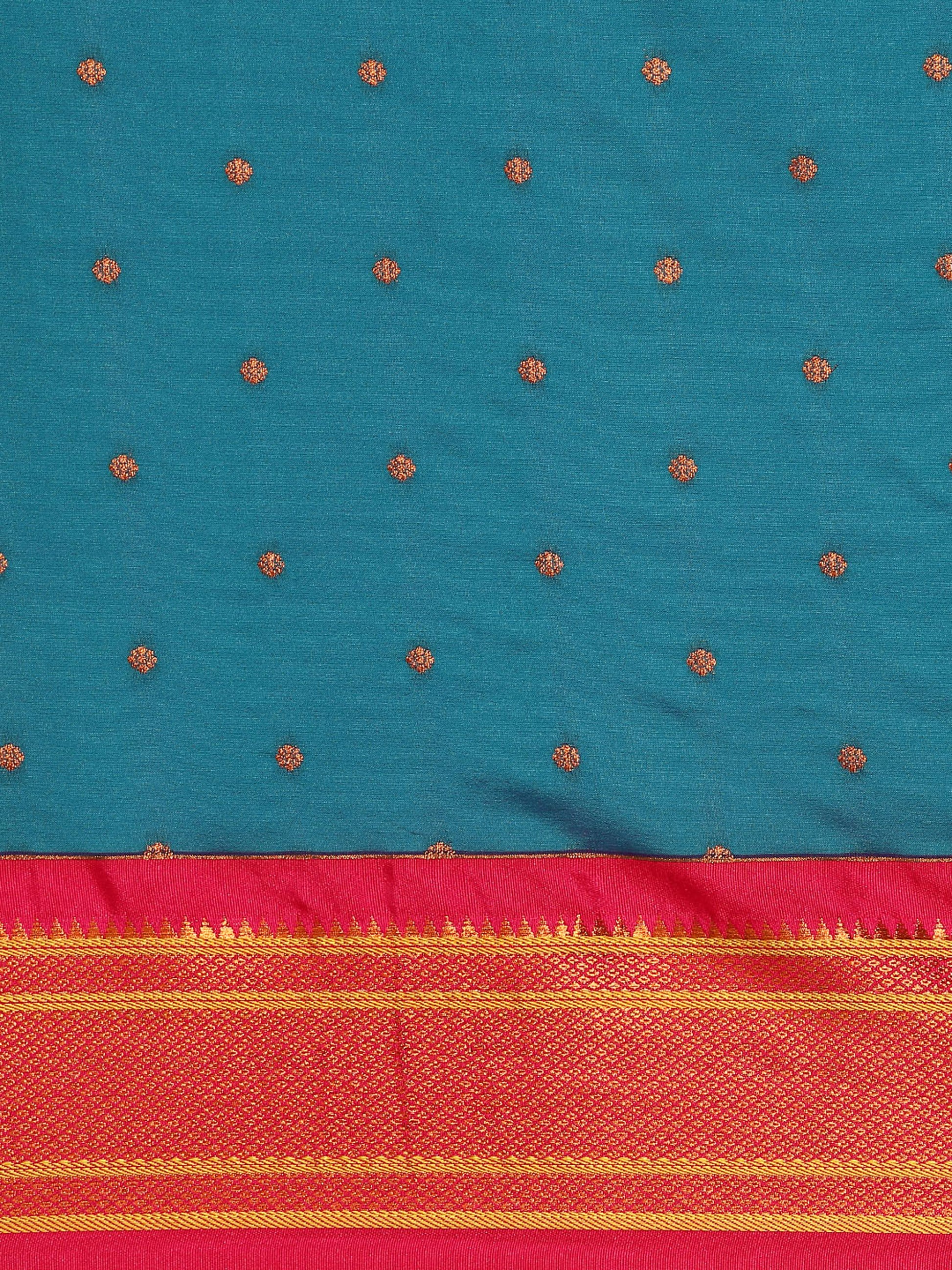 Explore The Collection Of Beautifully Designed Rama & Pink Soft Silk Maharani Nauwari Paithani Saree From Varkala Silk Sarees. This Soft Silk Maharani Nauwari Paithani Saree embodies elegance with its intricate design. Adorned with small copper zari buttis across its body, the saree features a captivating checks pattern in copper zari border. Its distinguishing feature is the exquisite peacock motifs in copper zari adorning the pallu. This 8.5-meter long saree is renowned for its Nauvari style draping, a hallmark of Maharashtrian culture and heritage. The draping style of Nauvari saree is distinctive, involving a single length of fabric wrapped around the body, forming a series of pleats at the waist which are tucked securely. This style not only exudes regality but also holds significant cultural and traditional value, making it ideal for weddings, festivals, and other ceremonial occasions