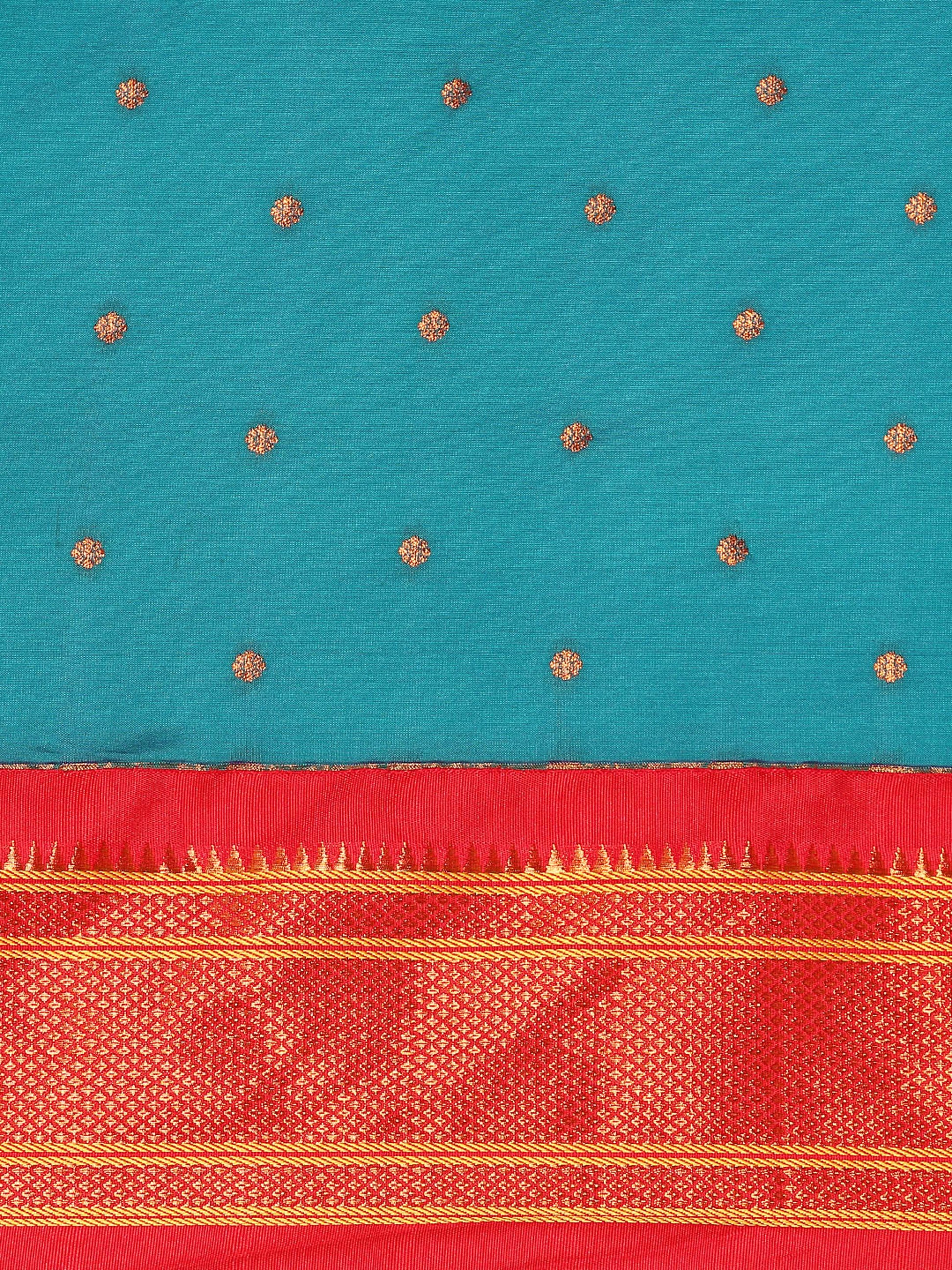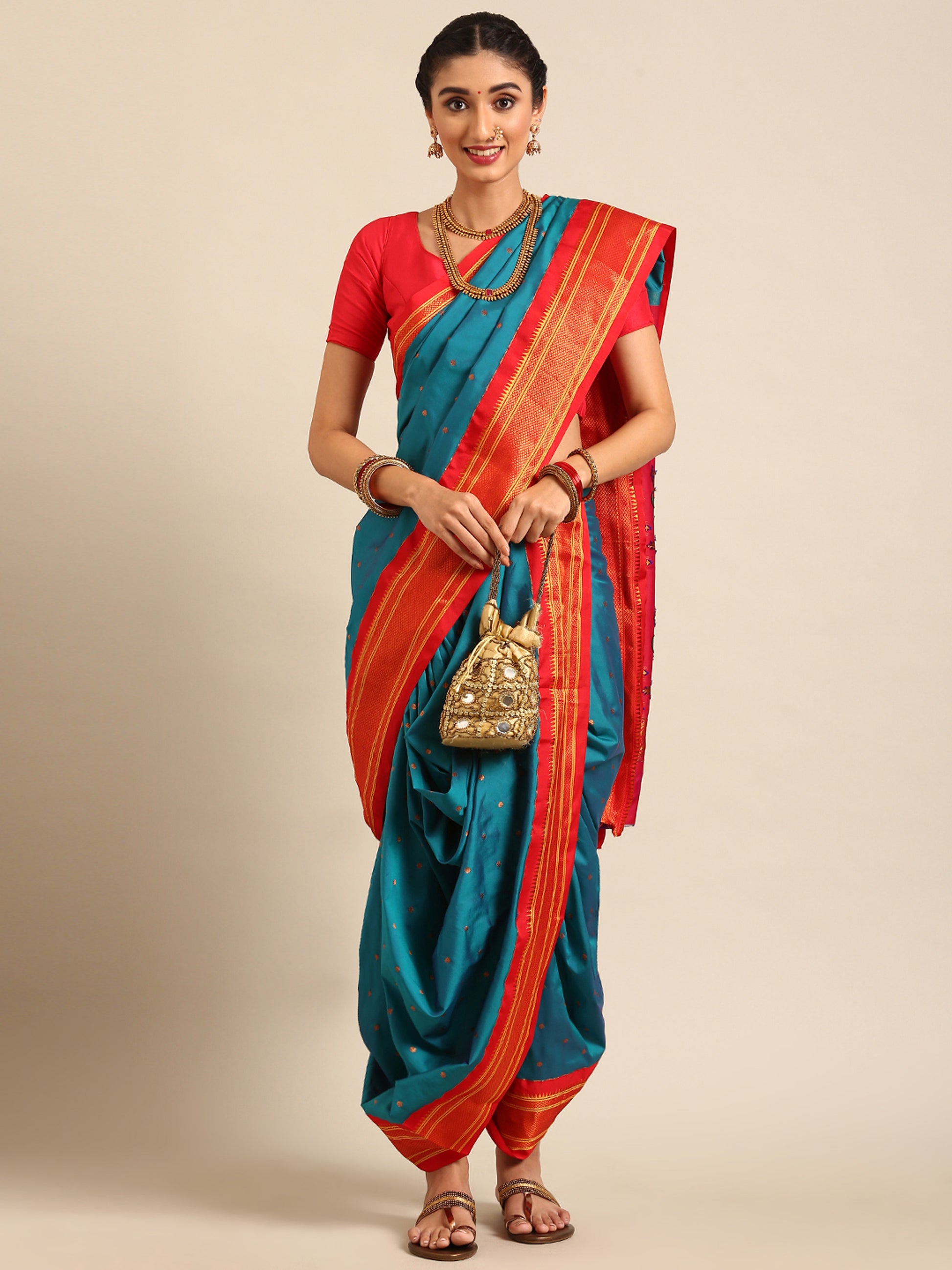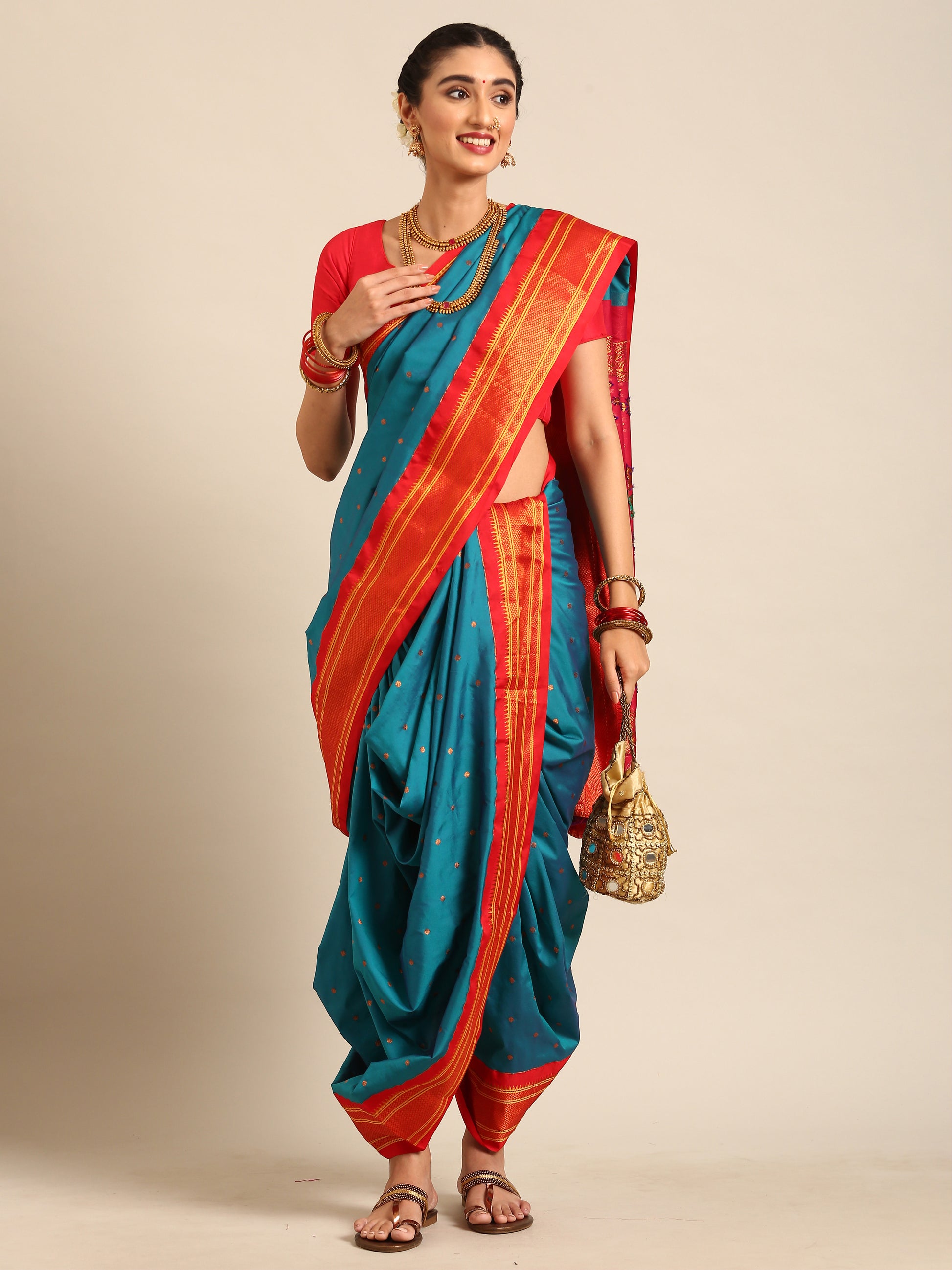 Explore The Collection Of Beautifully Designed Rama & Red Soft Silk Maharani Nauwari Paithani Saree From Varkala Silk Sarees. This Soft Silk Maharani Nauwari Paithani Saree embodies elegance with its intricate design. Adorned with small copper zari buttis across its body, the saree features a captivating checks pattern in copper zari border. Its distinguishing feature is the exquisite peacock motifs in copper zari adorning the pallu. This 8.5-meter long saree is renowned for its Nauvari style draping, a hallmark of Maharashtrian culture and heritage. The draping style of Nauvari saree is distinctive, involving a single length of fabric wrapped around the body, forming a series of pleats at the waist which are tucked securely. This style not only exudes regality but also holds significant cultural and traditional value, making it ideal for weddings, festivals, and other ceremonial occasions